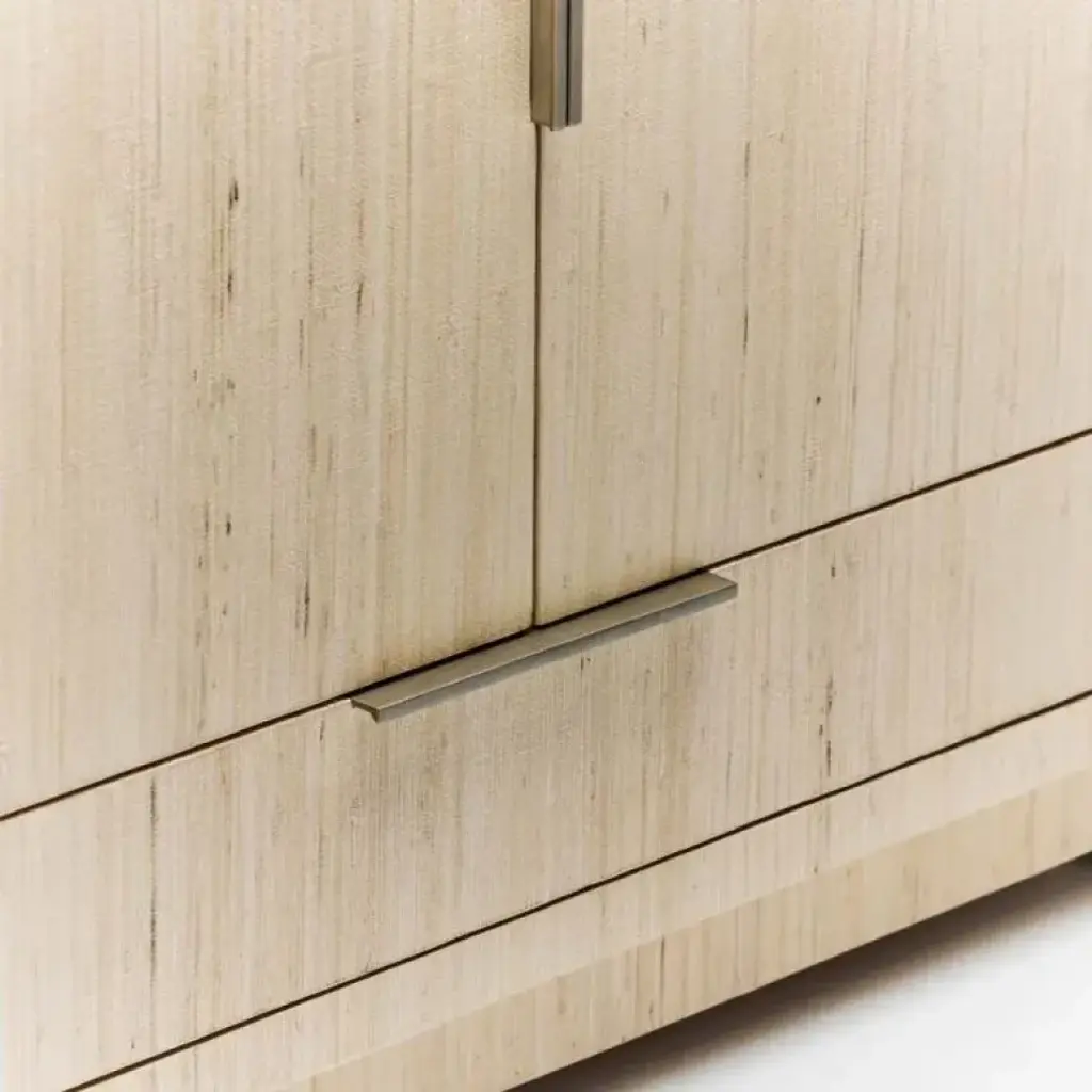 The organic flair of a natural sisal texture complements the sophistication of the Montaigne Bar Cabinet and its champagne silver iron hardware. Sisal is made from hand-woven strands of natural fibers on a rice paper backing. The texture and coloration of all natural fibers will vary and will patina with time and use. Each piece will have its own charm, character and coloration and should be celebrated for its uniqueness.