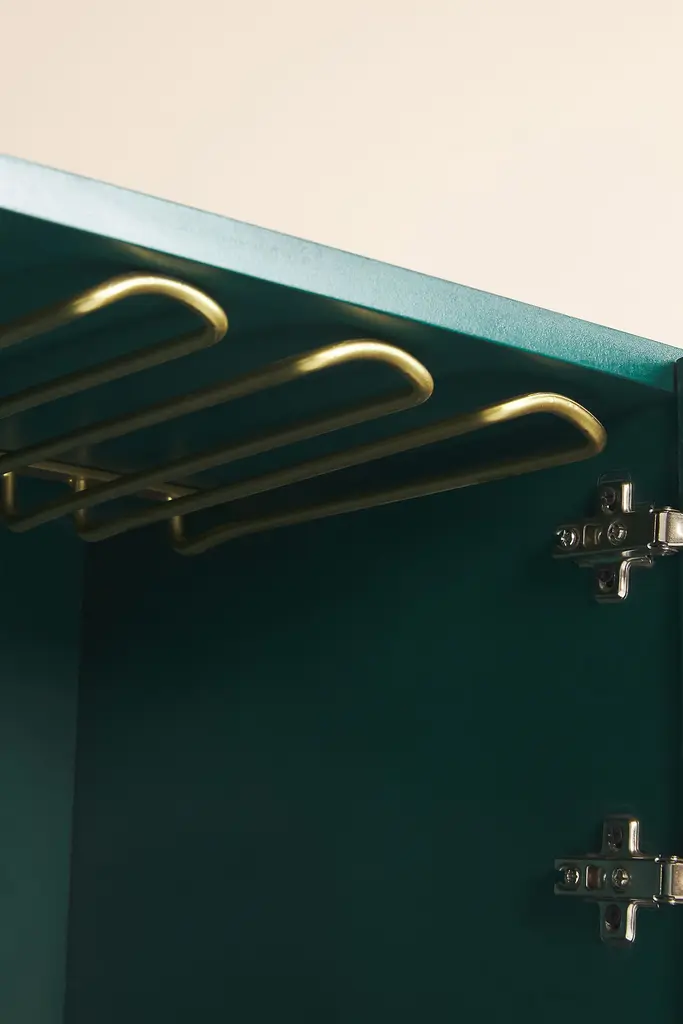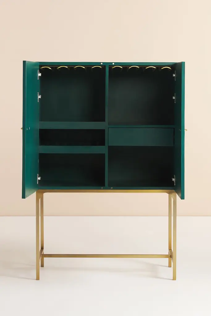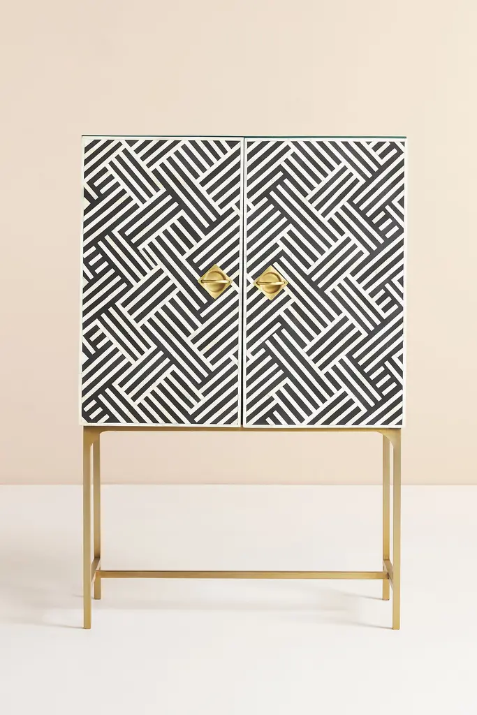 Featuring intricately patterned bone inlay and defining brass hardware, our showstopping Optical Inlay collection exudes unparalleled craftsmanship. Artful and functional at once, this bar cabinet makes a striking statement in any home. Pull its inlaid doors to reveal a glass rack that extends the length of its interior, a drawer for utensils, and multiples shelves to host the ingredients of your signature cocktail. For ordering assistance and more, please contact us. For aesthetic advice and tips to help decorate your space, enjoy our complimentary home styling services.For more information on the materials and techniques of this piece, click here.