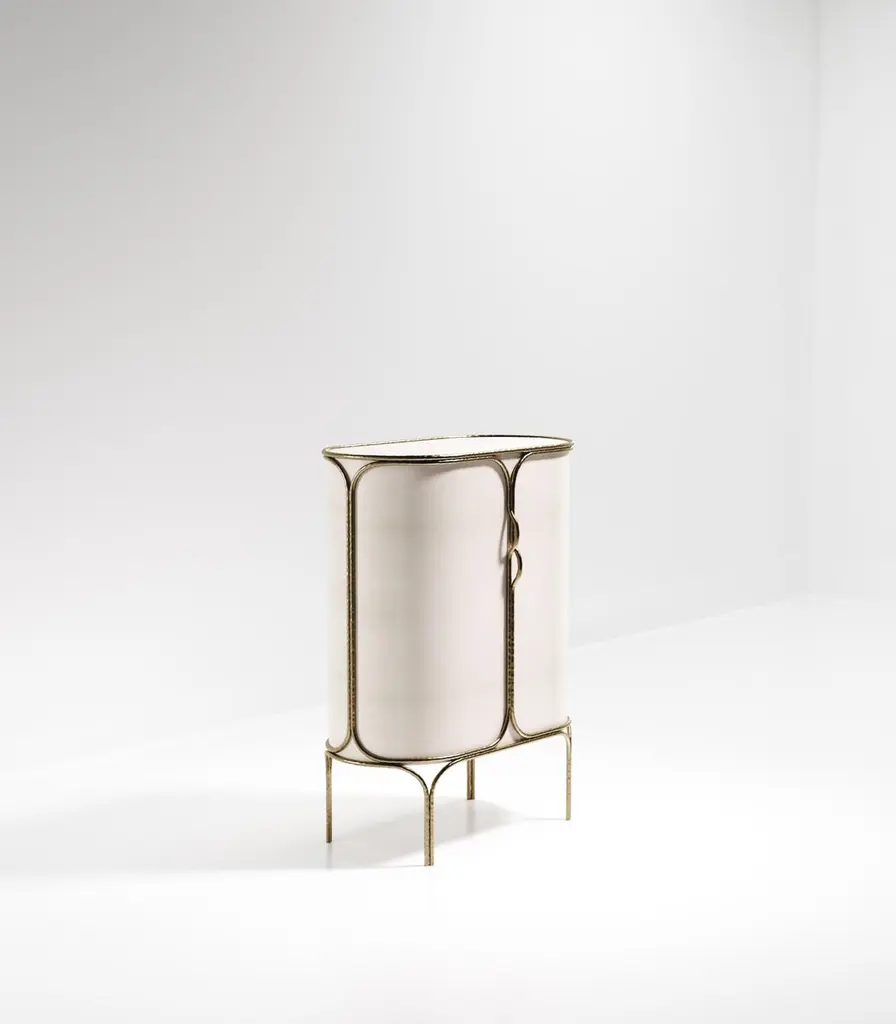 The Paris based label has distinguished themselves since their launch, with their iconic use of shagreen mixed with brass and other exotic materials. All furniture is handcrafted by skilled artisans, ultimately making each piece unique, designed in Paris and produced in the Philippines.The Arianne bar cabinet by R&Y Augousti is one of a kind statement piece. The overall piece is inlaid in cream parchment accentuated with intricate bronze-patina brass details that have the signature Augousti "melting" effect. The interior of the piece is in wood veneer and opens to 3 shelves. This piece is part of the Arianne Capsule, see images at end of slide of the collection. Available in other finishes, see images at end of slide. Custom sizing / finishing available in requestMeasures: 93 x 48 X 120 cm All R & Y Augousti pieces are handmade by artisans, ultimately making each piece unique. Custom color/sizing available on request. Wipe clean with soft dry cloth.Acclaimed design duo Ria & Yiouri Augousti have established themselves since the 1990s as pioneers of modern-vintage style through their luxurious Art Deco inspired collections.The Paris based label has distinguished themselves since their launch, with their iconic use of shagreen mixed with brass and other exotic materials. All furniture is handcrafted by skilled artisans, ultimately making each piece unique. All shagreen-covered items should be kept out of direct sunlight, color variants may occur on the stingray and other exotic finishes, but this showcases the Parisian label's commitment to creating authentic luxurious products using natural components.