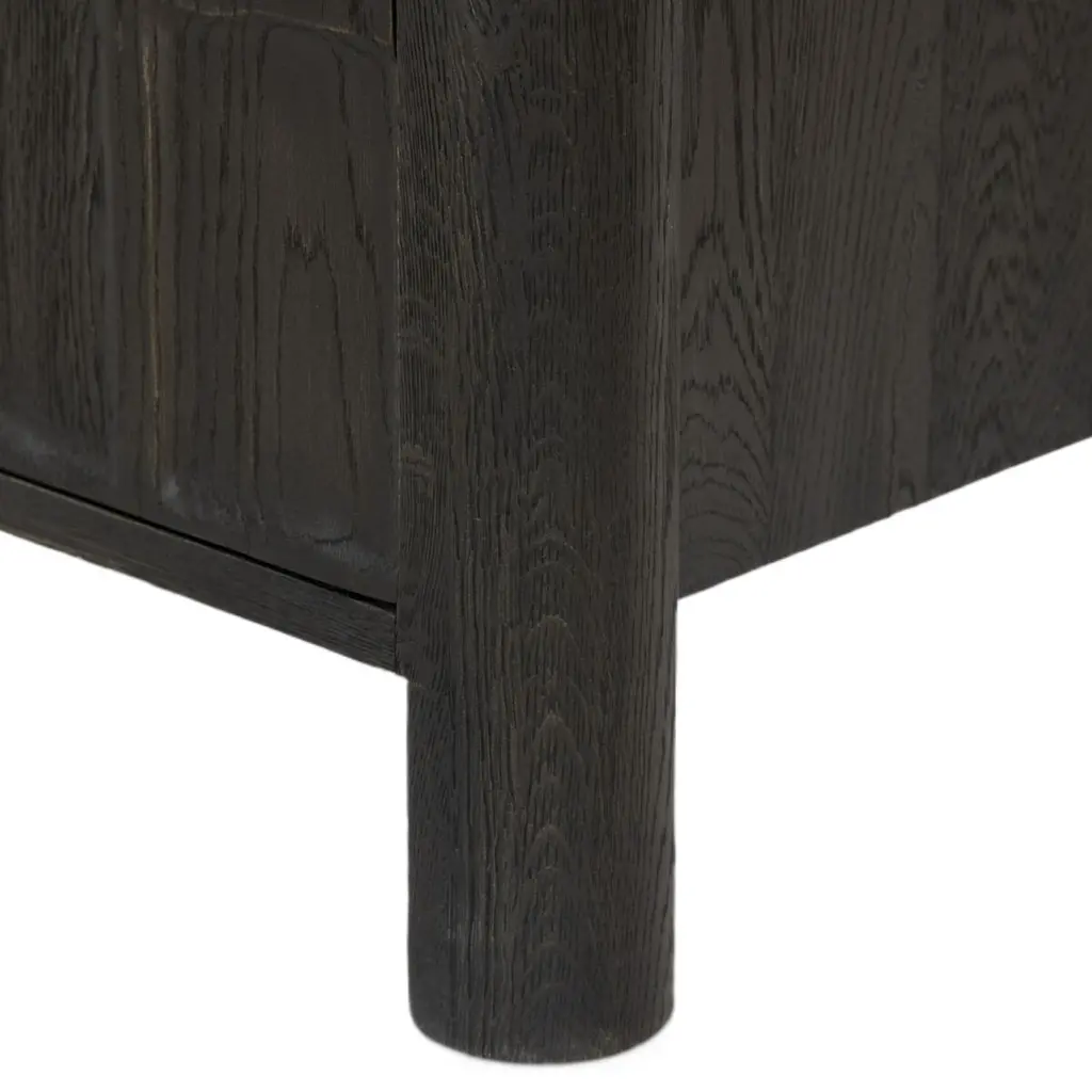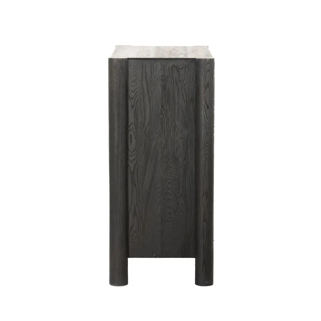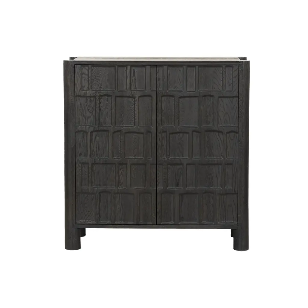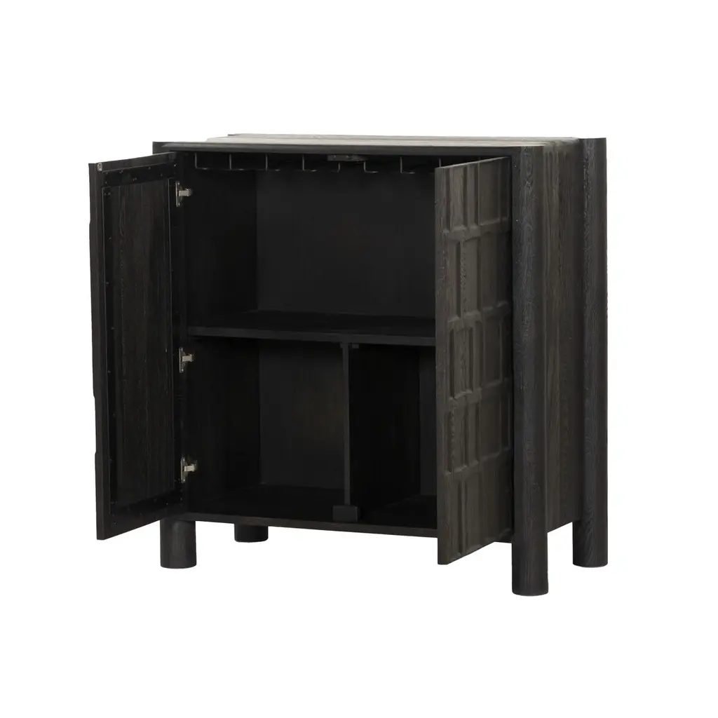The Percy Bar Cabinet is a masterpiece of craftsmanship, featuring a stunning blend of solid oak and mango wood. Its unique carving accentuates the rich natural graining, creating an inspired piece that stands out in any setting. The design is completed with floor-to-top cylinder legs, offering a striking silhouette. Inside, you'll find ample storage space, perfect for organizing your barware with elegance and style.