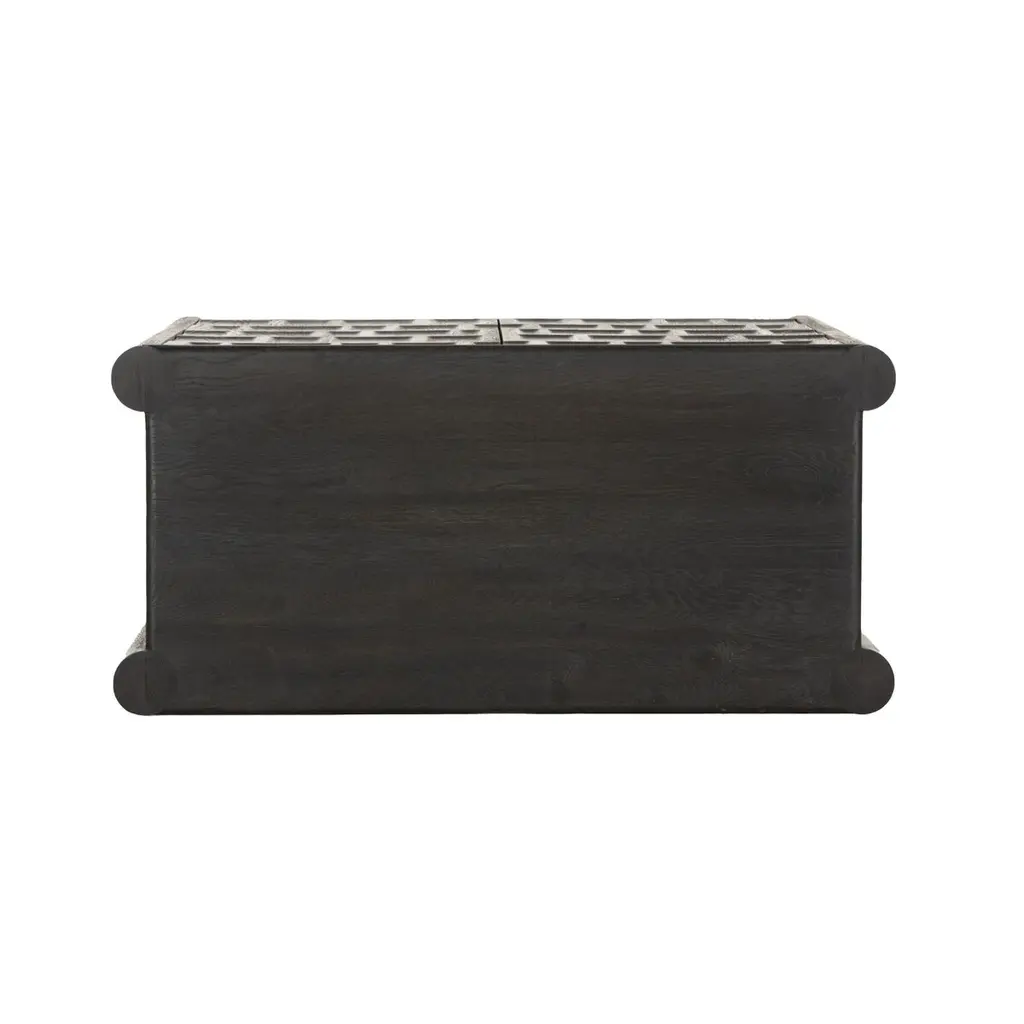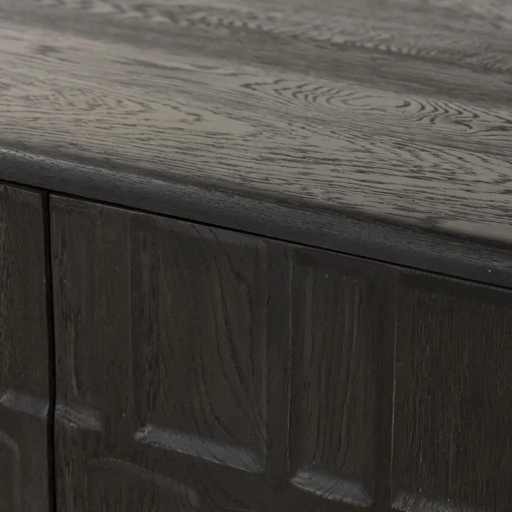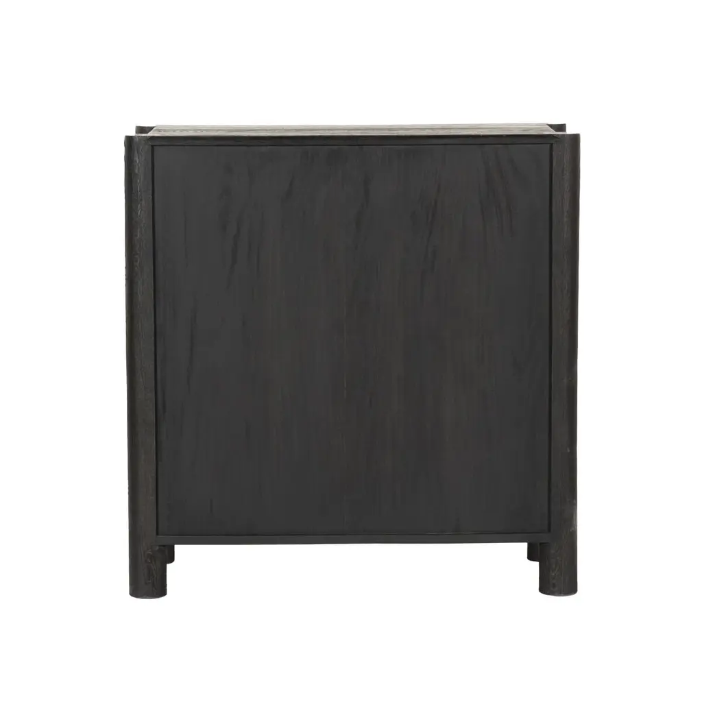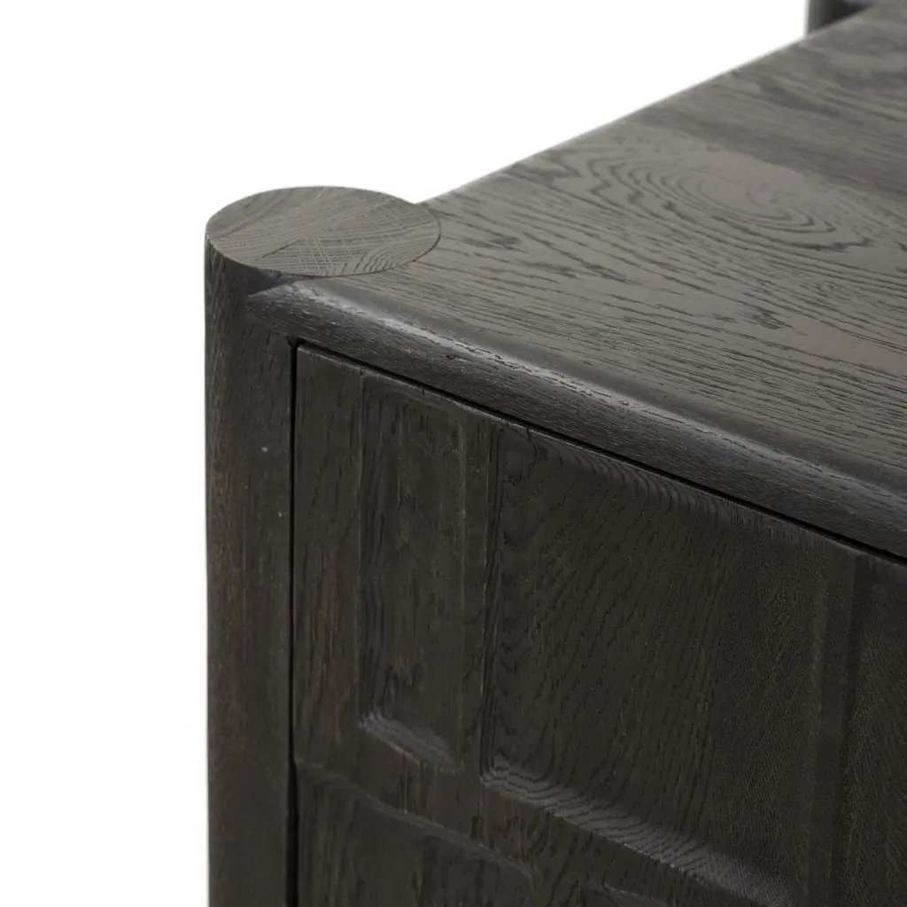 The Percy Bar Cabinet is a masterpiece of craftsmanship, featuring a stunning blend of solid oak and mango wood. Its unique carving accentuates the rich natural graining, creating an inspired piece that stands out in any setting. The design is completed with floor-to-top cylinder legs, offering a striking silhouette. Inside, you'll find ample storage space, perfect for organizing your barware with elegance and style.