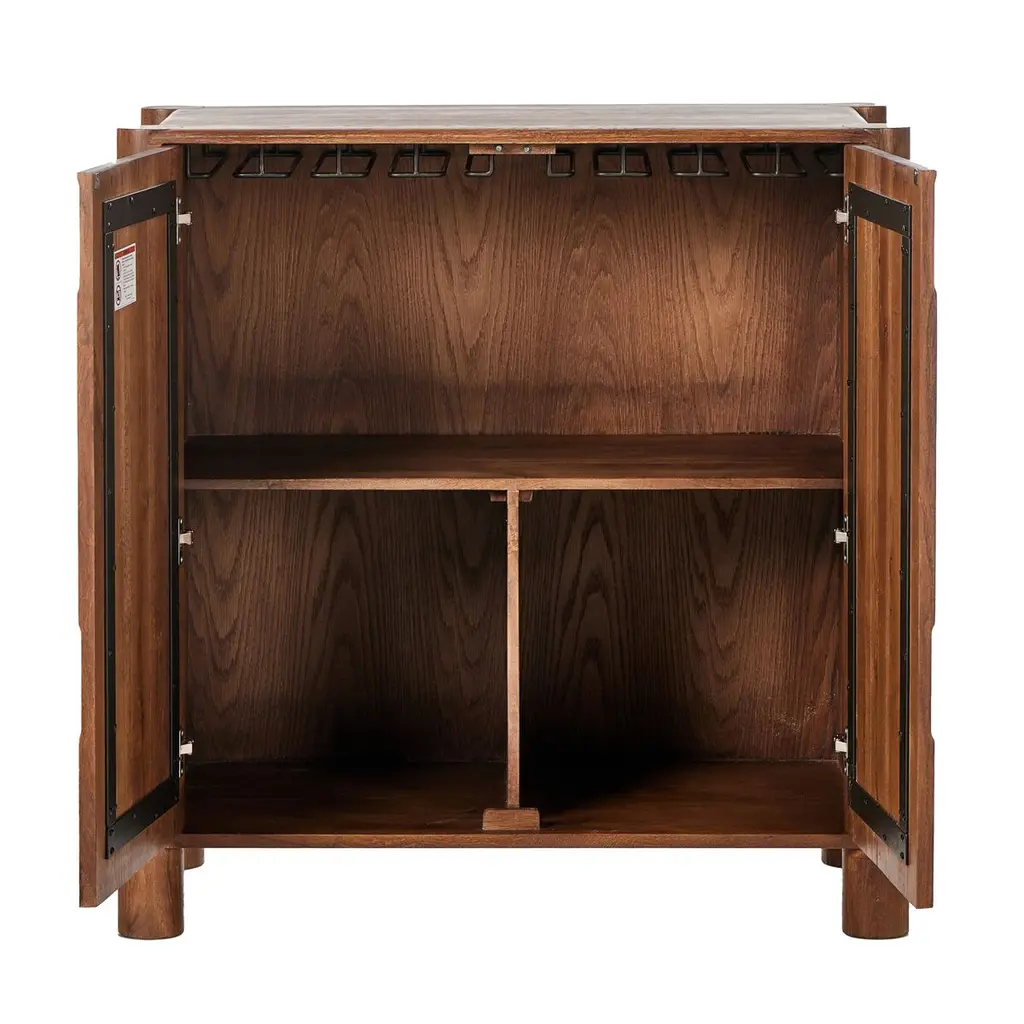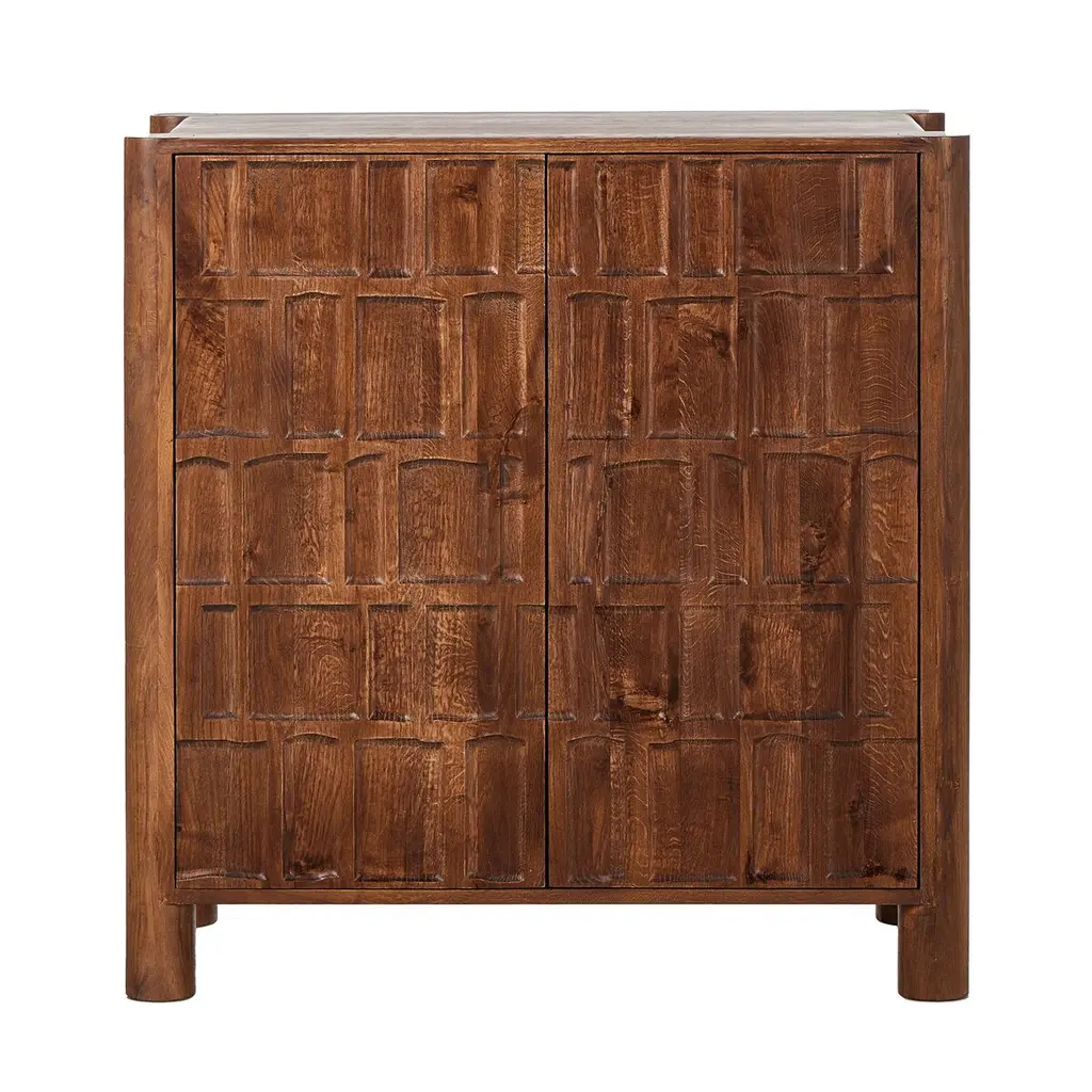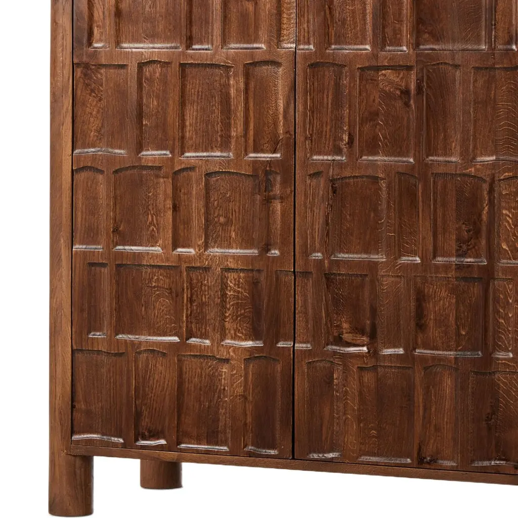 The Percy Bar Cabinet is a masterpiece of craftsmanship, featuring a stunning blend of solid oak and mango wood. Its unique carving accentuates the rich natural graining, creating an inspired piece that stands out in any setting. The design is completed with floor-to-top cylinder legs, offering a striking silhouette. Inside, you'll find ample storage space, perfect for organizing your barware with elegance and style.