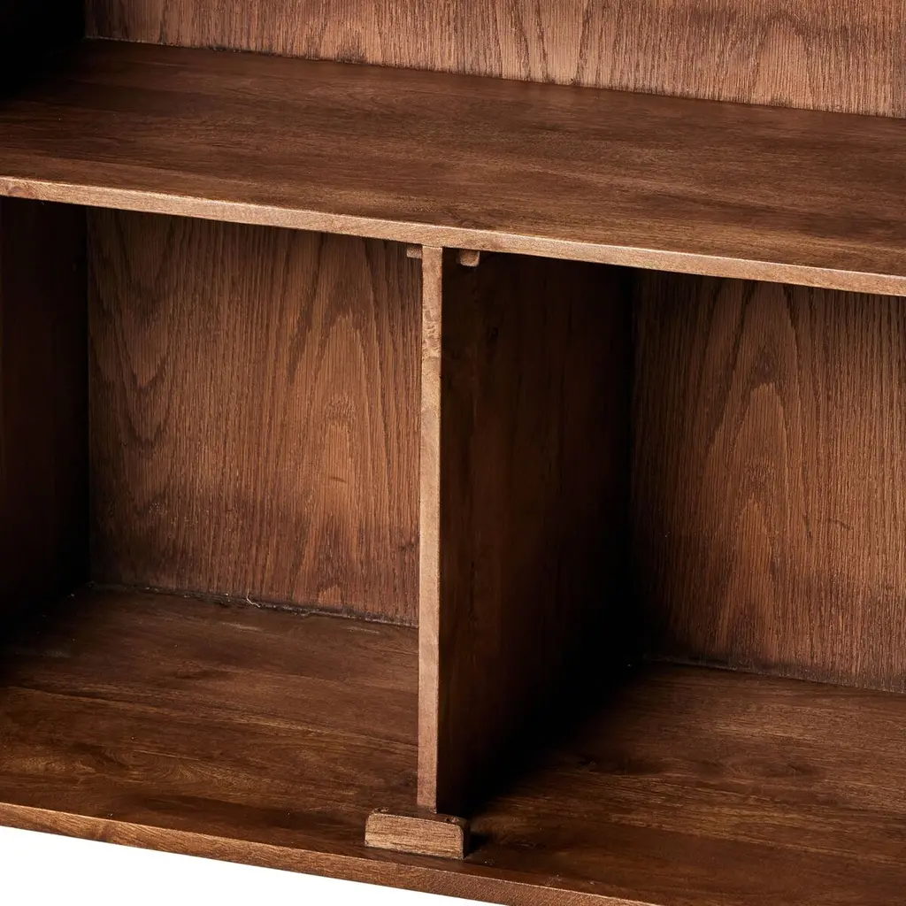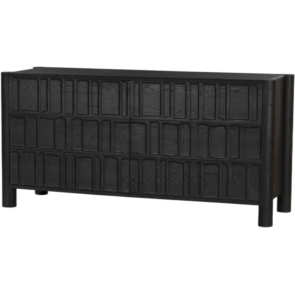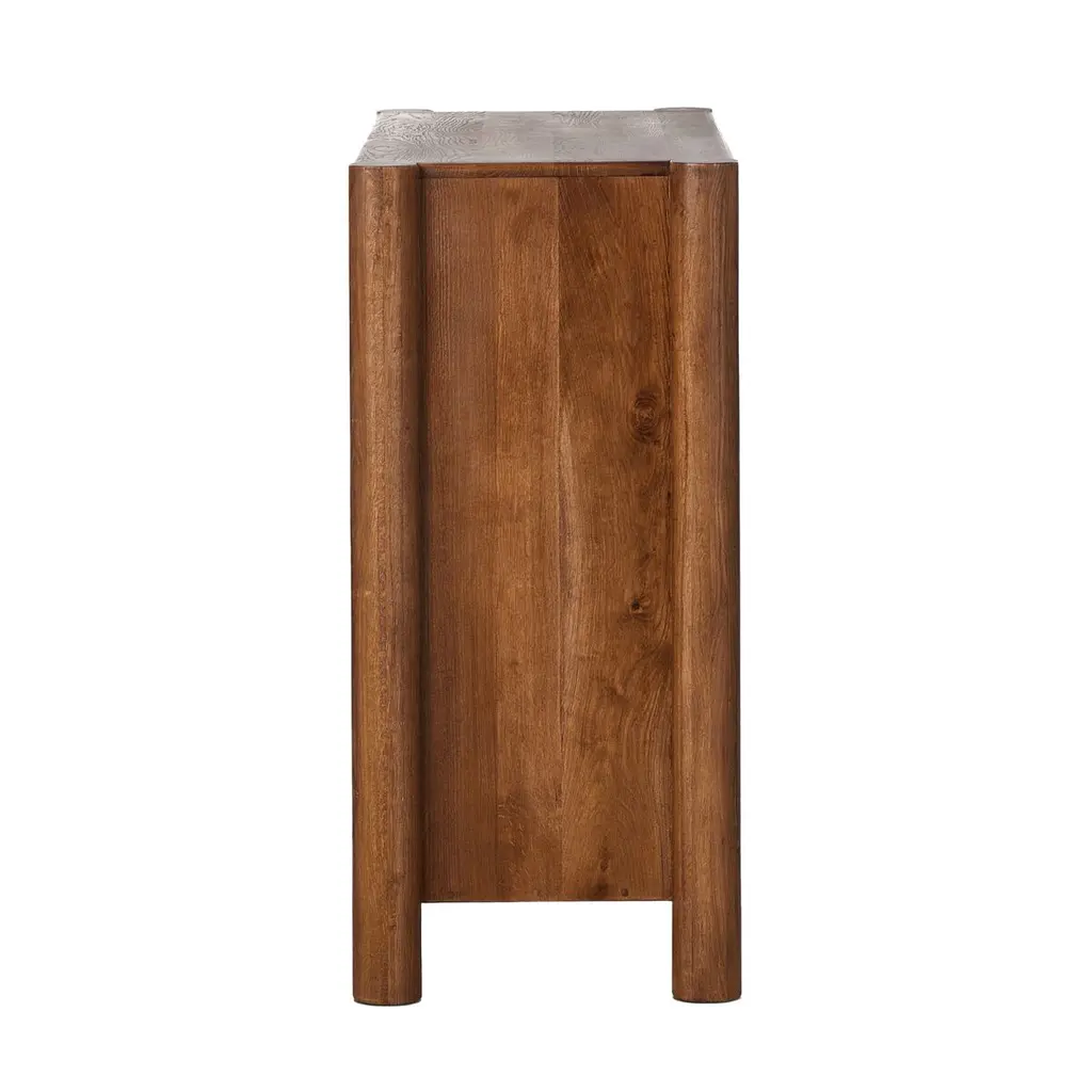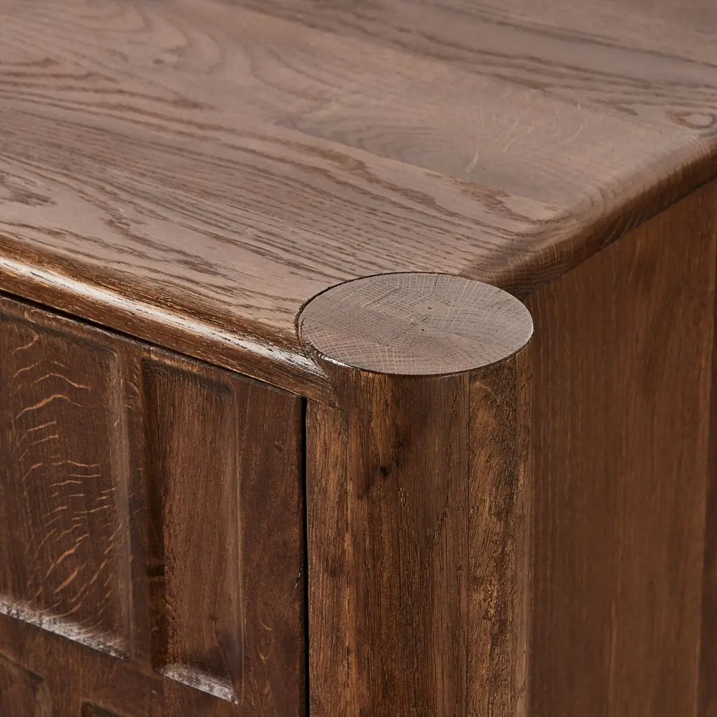 The Percy Bar Cabinet is a masterpiece of craftsmanship, featuring a stunning blend of solid oak and mango wood. Its unique carving accentuates the rich natural graining, creating an inspired piece that stands out in any setting. The design is completed with floor-to-top cylinder legs, offering a striking silhouette. Inside, you'll find ample storage space, perfect for organizing your barware with elegance and style.