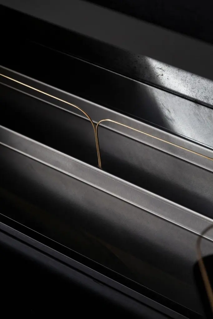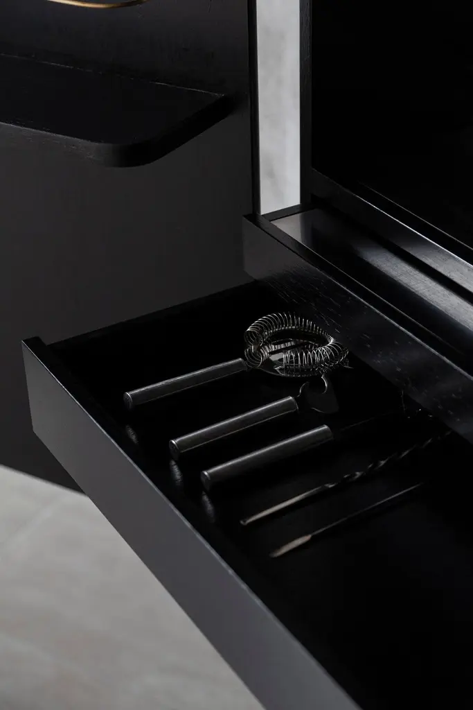 Bar cabinet made of solid seike wood body with Ébano finish, details in lathed bronze, interior surfaces laminated with stainless steel sheets, interior back panel with antique mirror glass, and bronze sand-casted handles. The first Perfidia collection explores the mutualism between artisan techniques and industrialized manufacturing methods. It is an investigation into the relationship between crafts and automated processes that seeks to highlight the natural characteristics of each method and material. The furniture has been developed through a dialogue between the artisan and innovation, maintaining the inherence of the process and its manual strokes. To paraphrase the Mexican writer Octavio Paz: “between the timeless time of the museum, and the accelerated time of the machine, these pieces palpitate human time.” Perfection, existing in the “imperfections” of artisanal methods, is the tool that bestows soul to each piece, moving away from mass production. Steel rod structures are the common language of the collection, achieving a visual sophistication that pushes toward innovation. Sand-casted bronze details contrast against automated manufacturing components, such as CNC-carved wooden parts or laser-cut metal parts. The Perfidia collection aims to value and revitalize the golden age of the 70s in Latin America; times of fervent and prosperous creation with a personal stamp in various disciplines; the time of Los Panchos and Lucho Gatica. Through this lens, each design is an act of complicity with our ancestors, parents, or grandparents, to honor them in the present day and engage the world with their legacy. Pieces that, like a bolero, bring memories to home and preserve the energy of what we were and the possibilities of what we can create. ARTISANS Washington Romero: Woodworking Edison Simbaña: Bronze and Stainless Steel CNC Lathe Carlos Pila: Bronze Sand-casting