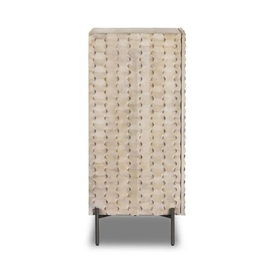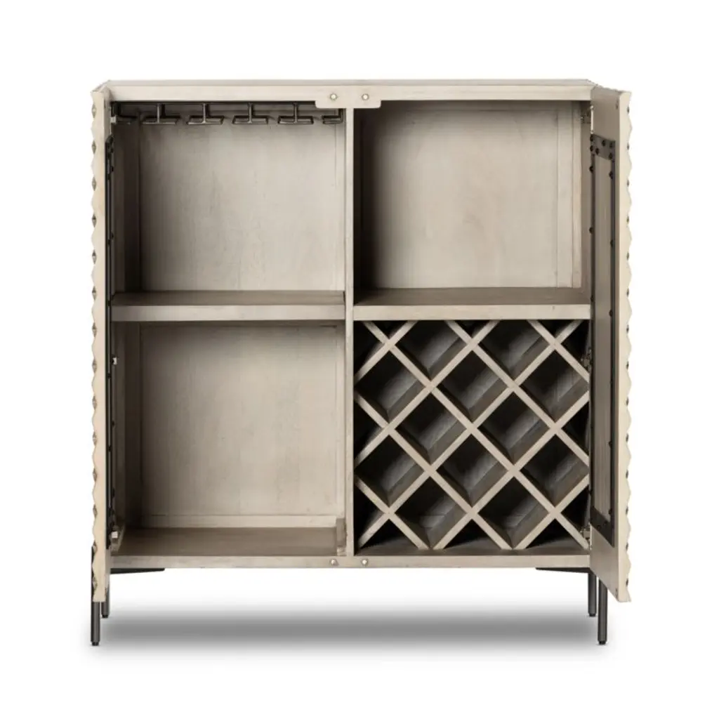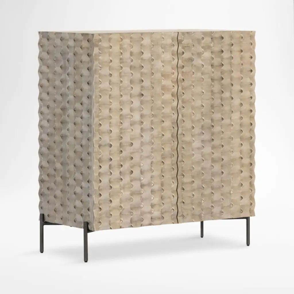 A carved honeycomb pattern wraps Raffael's grey-washed exterior in conversation-sparking texture and dimension. Crafted of renewable solid mango wood, from trees no longer producing fruit, each facet of the intricately carved door fronts highlights the wood's lively grain. Set on a minimalist base of gunmetal-finished iron, the cabinet makes a sculptural addition to a living room or study. Open the doors and Raffael is ready for cocktail hour, with room to store bottles and bar tools plus a rack to hold up to 15 wine glasses.