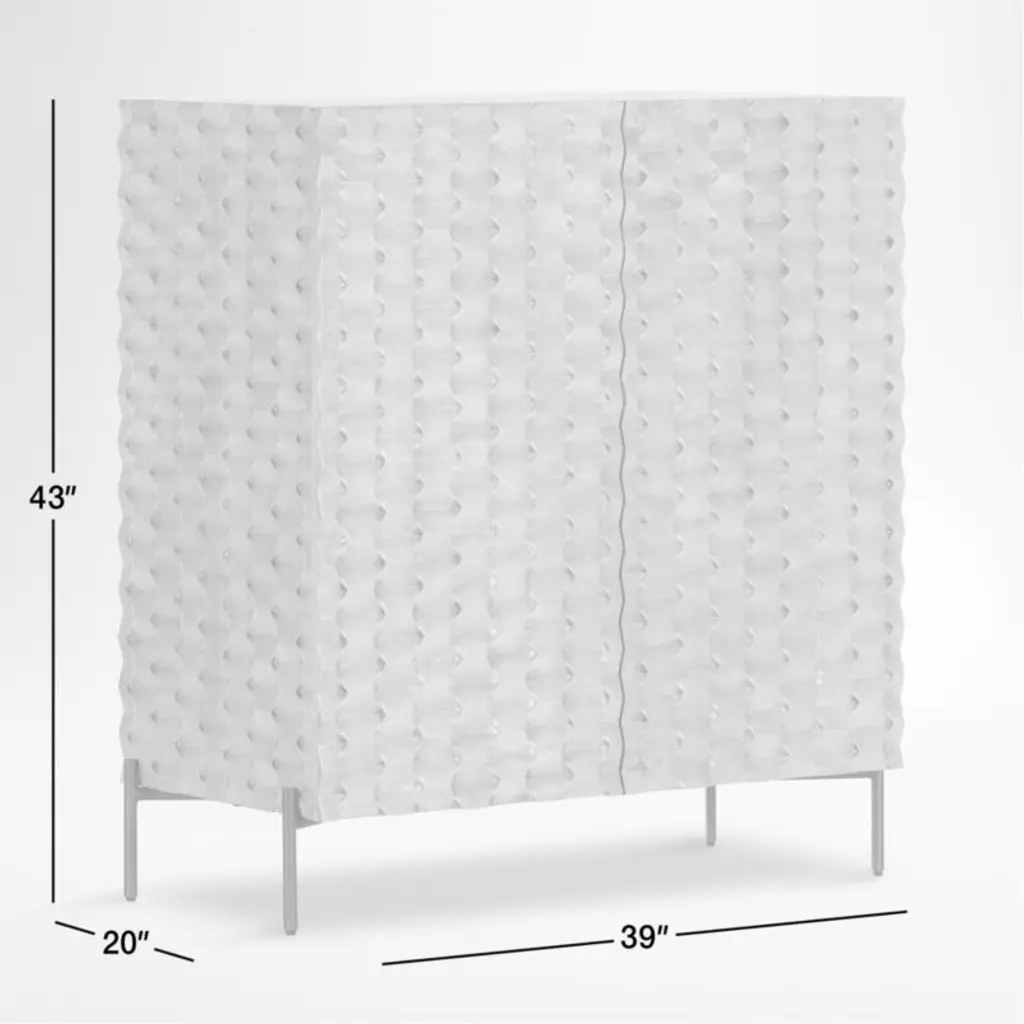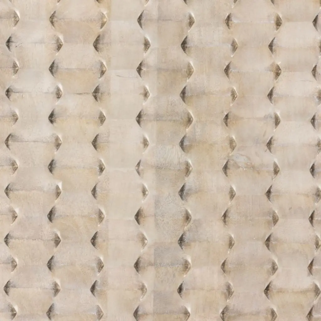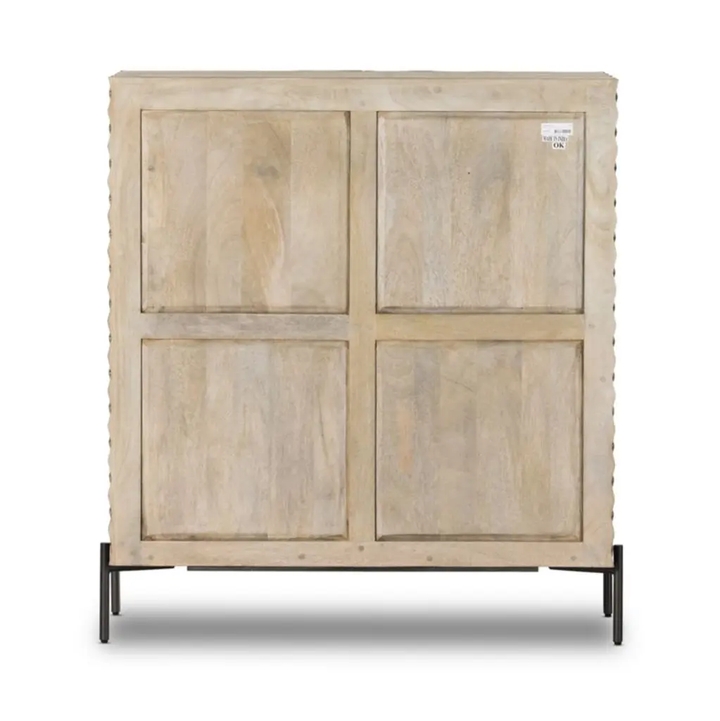 A carved honeycomb pattern wraps Raffael's grey-washed exterior in conversation-sparking texture and dimension. Crafted of renewable solid mango wood, from trees no longer producing fruit, each facet of the intricately carved door fronts highlights the wood's lively grain. Set on a minimalist base of gunmetal-finished iron, the cabinet makes a sculptural addition to a living room or study. Open the doors and Raffael is ready for cocktail hour, with room to store bottles and bar tools plus a rack to hold up to 15 wine glasses.