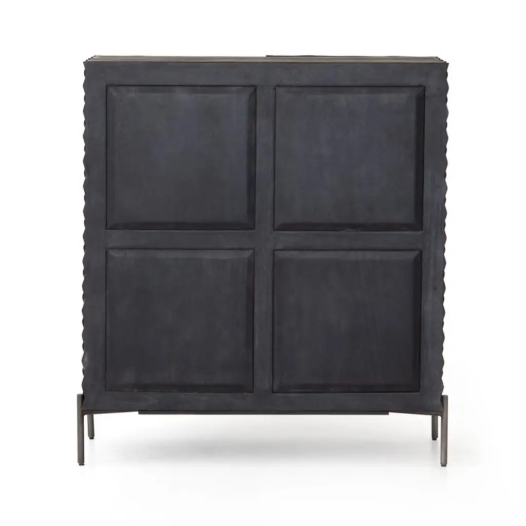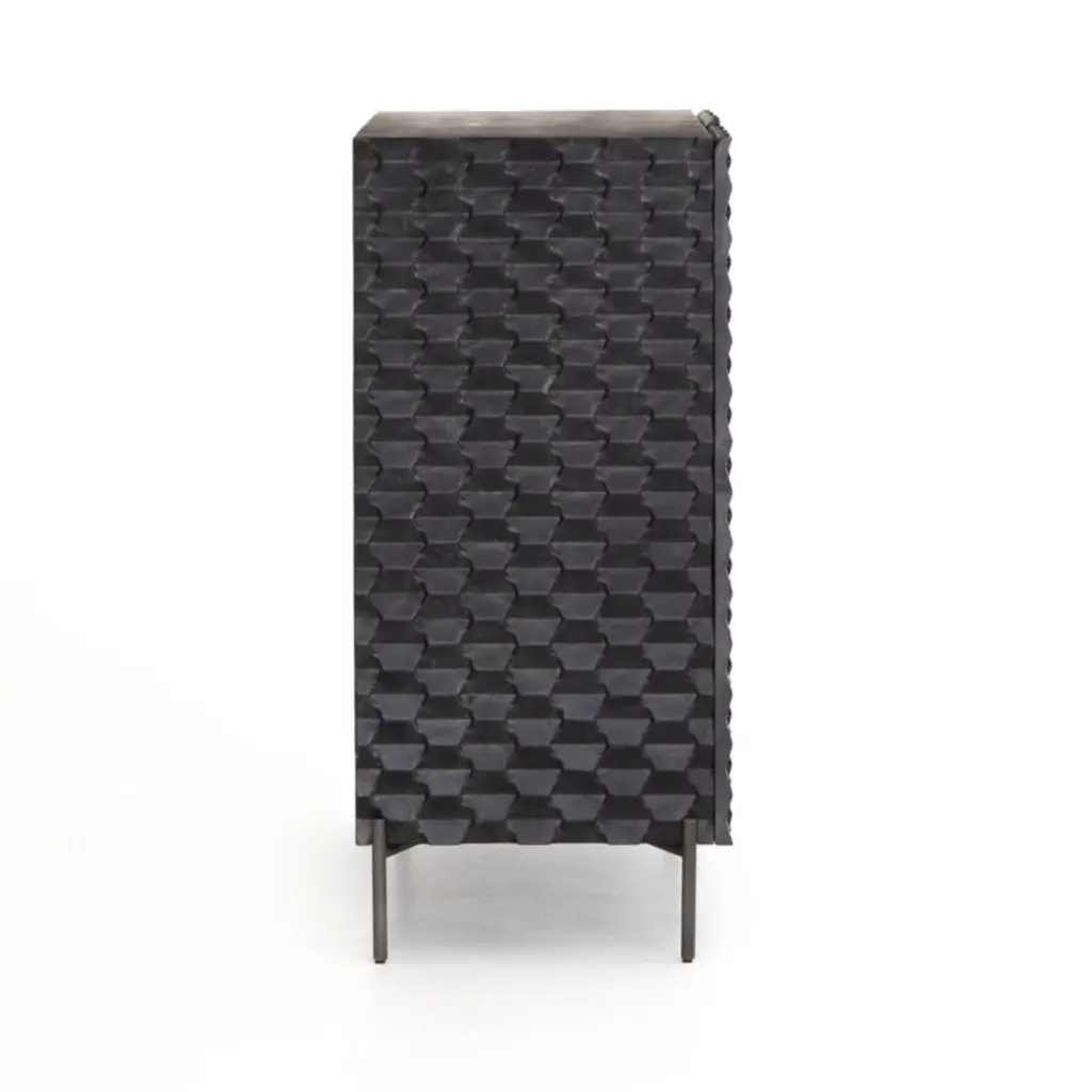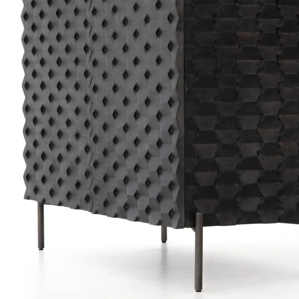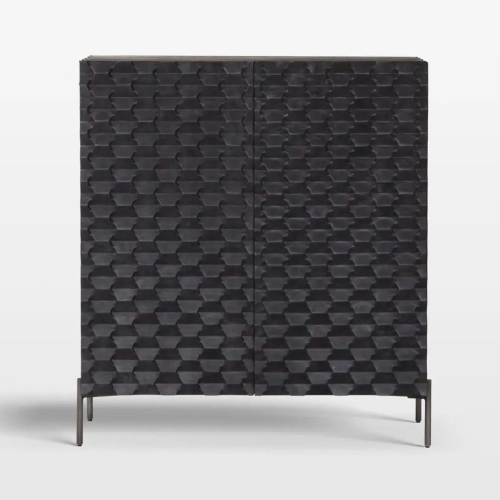 A carved honeycomb pattern wraps Raffael's black-stained exterior in conversation-sparking texture and dimension. Crafted of renewable solid mango wood, from trees no longer producing fruit, each facet of the intricate door fronts highlights the wood's lively grain. Set on a minimalist base of gunmetal-finished iron, the cabinet makes a sculptural addition to a living room or study. Open the doors and Raffael is ready for cocktail hour, with room to store bottles and bar tools plus a rack to hold up to 15 wine glasses.