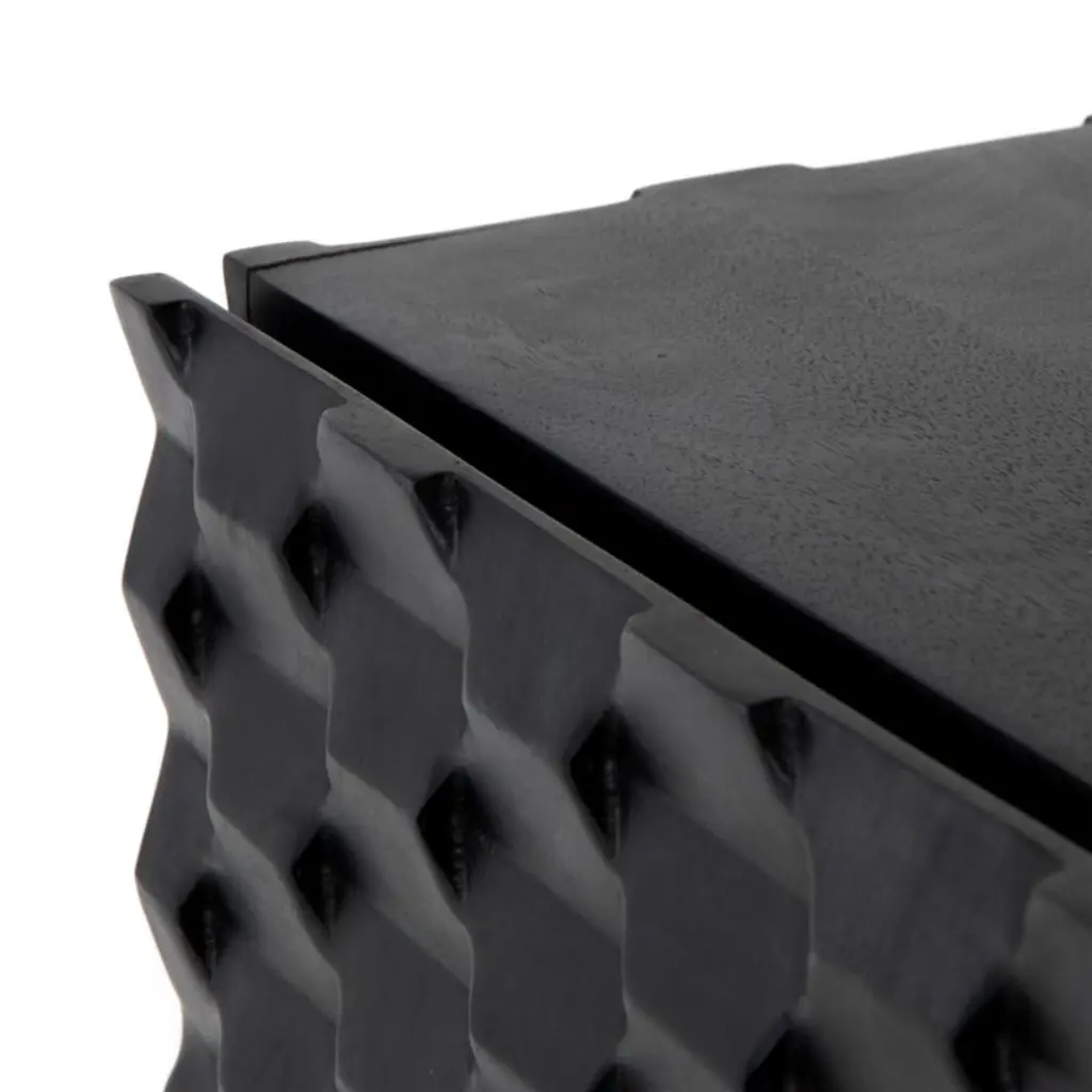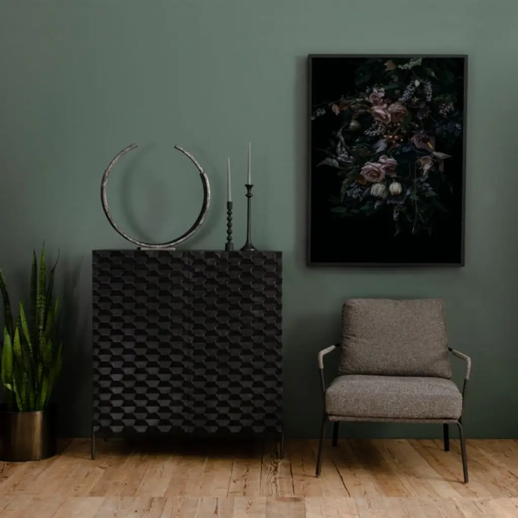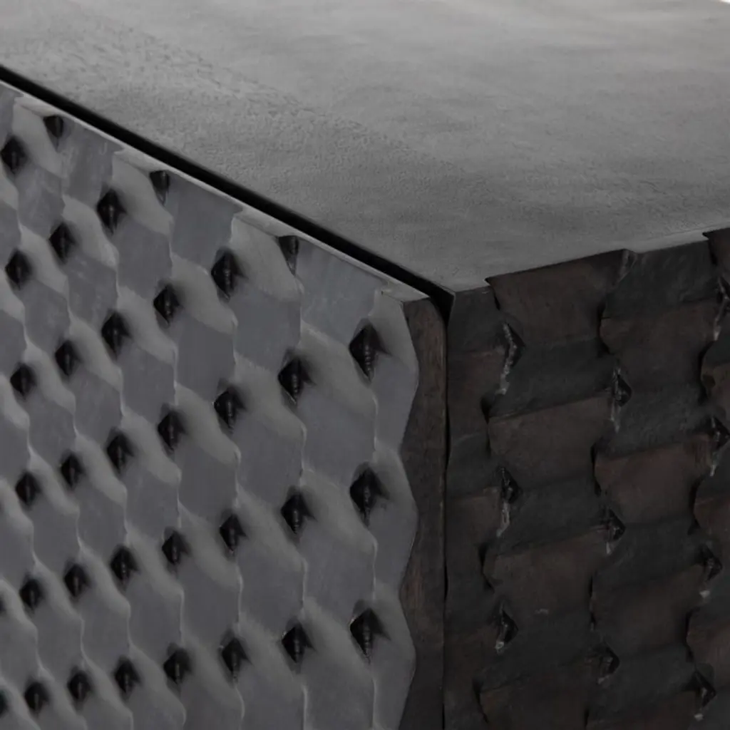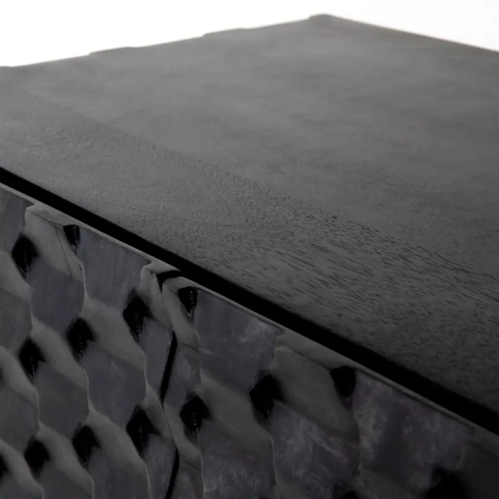 A carved honeycomb pattern wraps Raffael's black-stained exterior in conversation-sparking texture and dimension. Crafted of renewable solid mango wood, from trees no longer producing fruit, each facet of the intricate door fronts highlights the wood's lively grain. Set on a minimalist base of gunmetal-finished iron, the cabinet makes a sculptural addition to a living room or study. Open the doors and Raffael is ready for cocktail hour, with room to store bottles and bar tools plus a rack to hold up to 15 wine glasses.