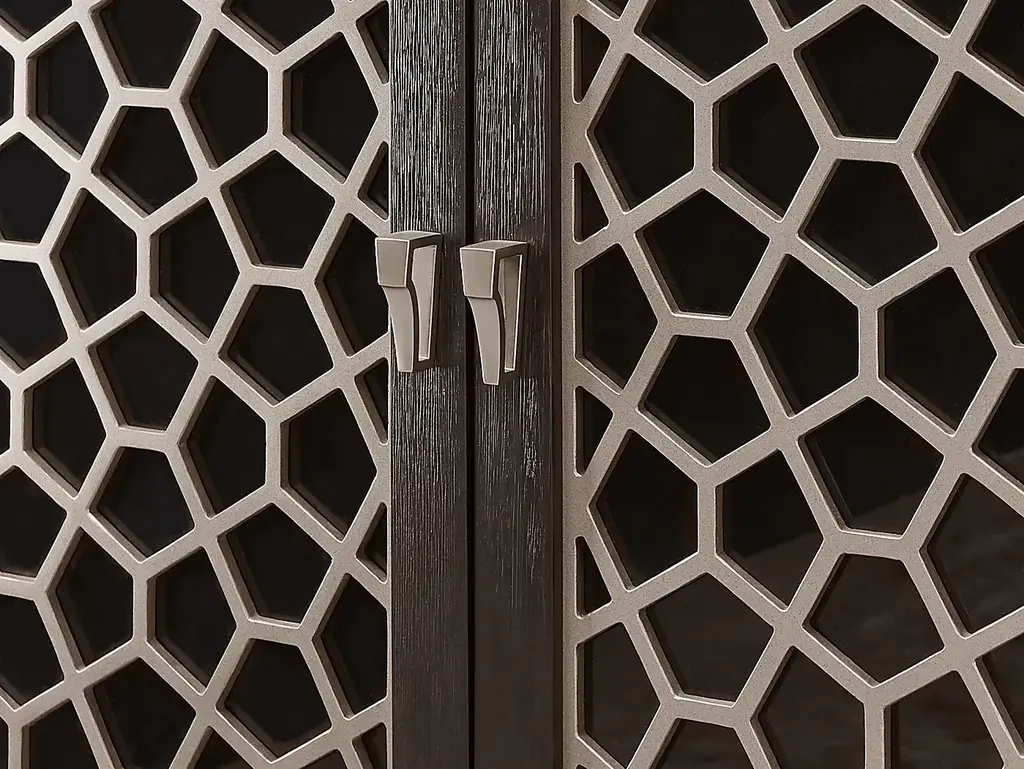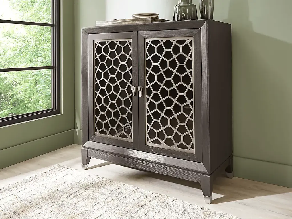 With built-in features and design details to delight guests and family alike, the Rosalie bar cabinet is a functional work of art that imbues every dining space with irresistible contemporary flair. Crafted with wood solids and oak veneers in an espresso finish, this piece features two doors with gray acrylic mosaic inlays. Internally the bar has two drawers with ball bearing side mounted glides. Glasses can be stored on the top shelf while the wine rack on the bottom is there to store cabernets, vermouths, and more. Polished hardware compliments the look, offering a perfect final detail.