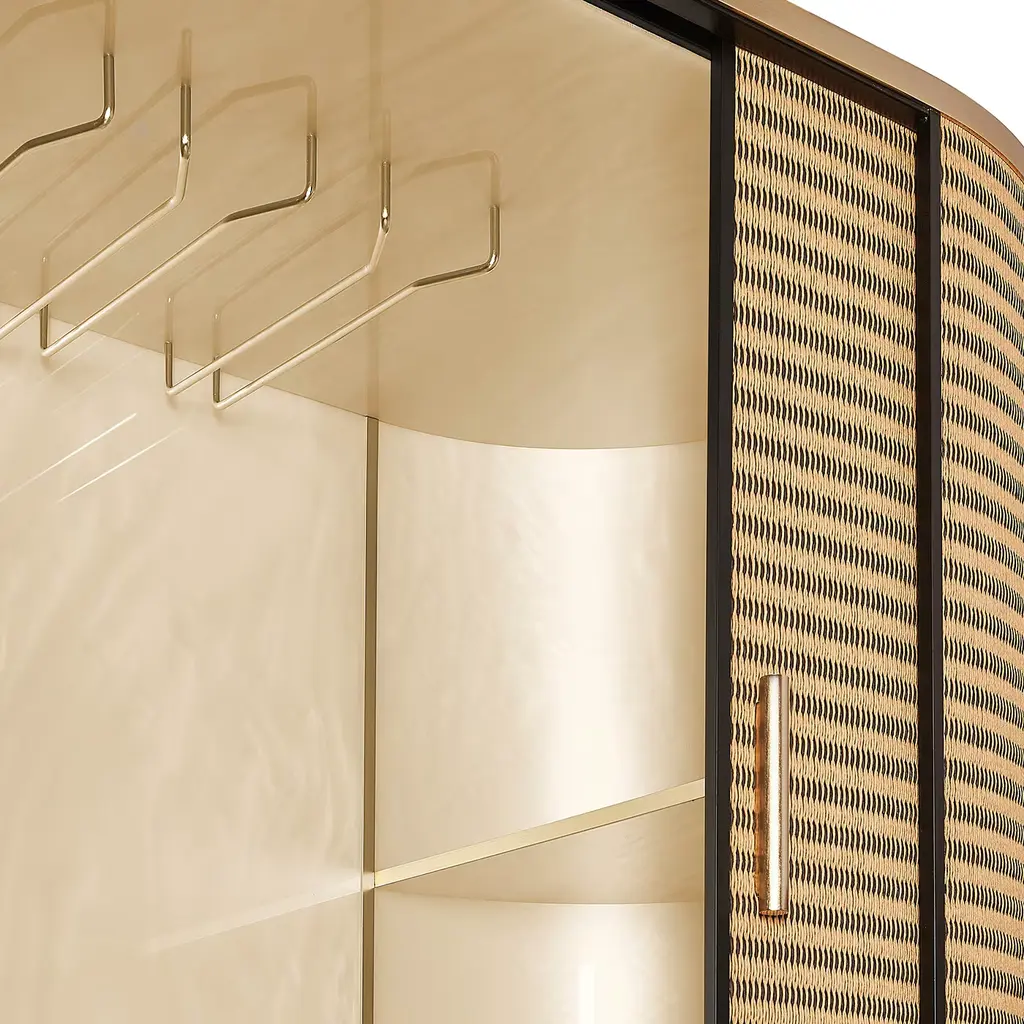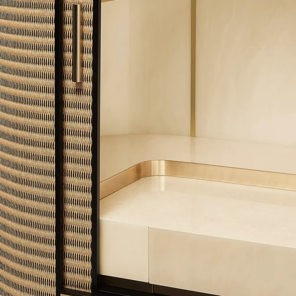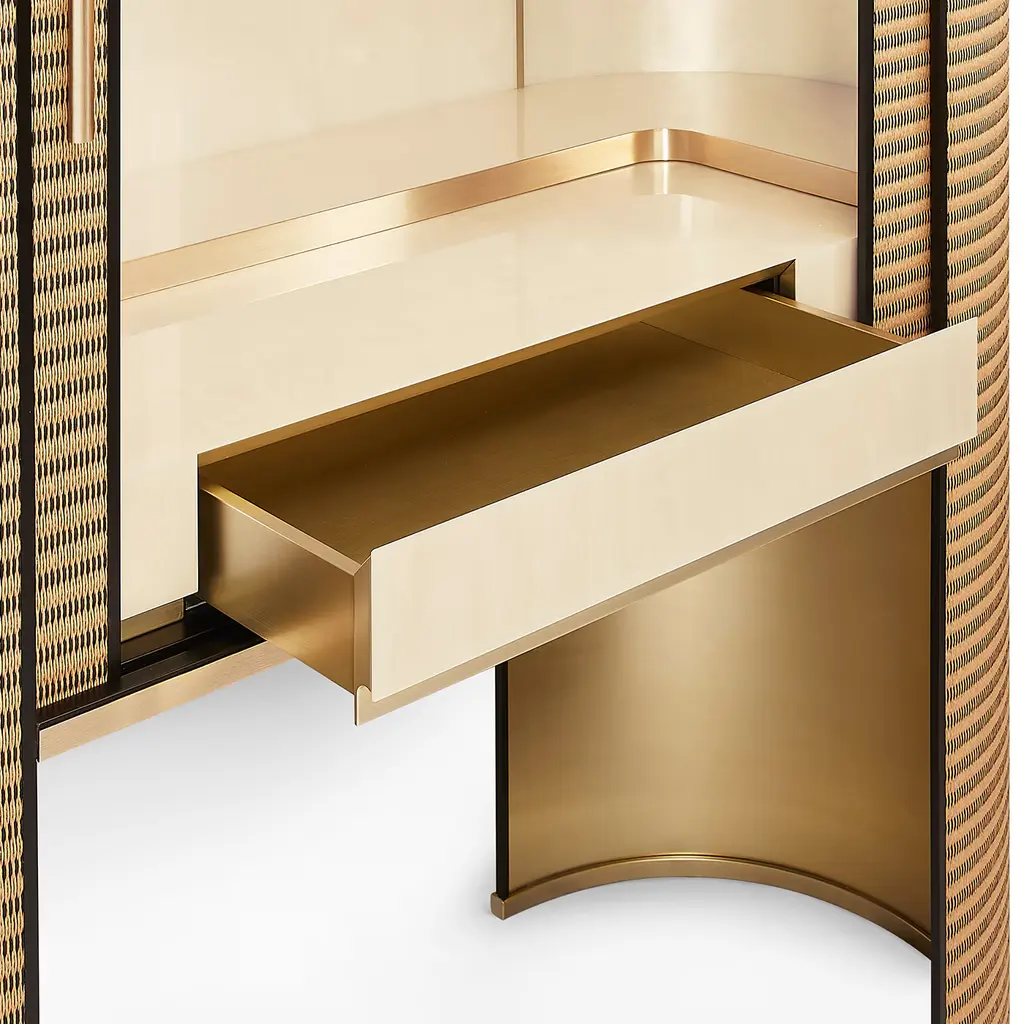 Royal Cabinet is a limited edition of 88 pieces. The structure is marked by an elongated cylindrical shape with semicircular sides, which become also the base of the furniture. The bar unit is closed by two flexible doors that slide horizontally into the main structure, unveiling the working area completed by shelves and a large drawer for preparation tools. Inside, back-lit panels of gold-toned methacrylate add movement thanks to their motif, recalling marble veins and mother of pearl.