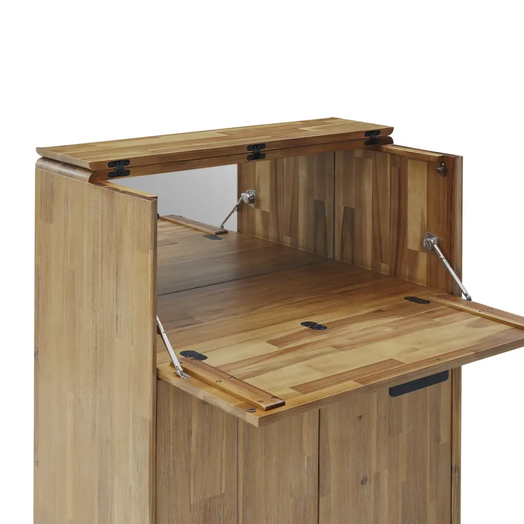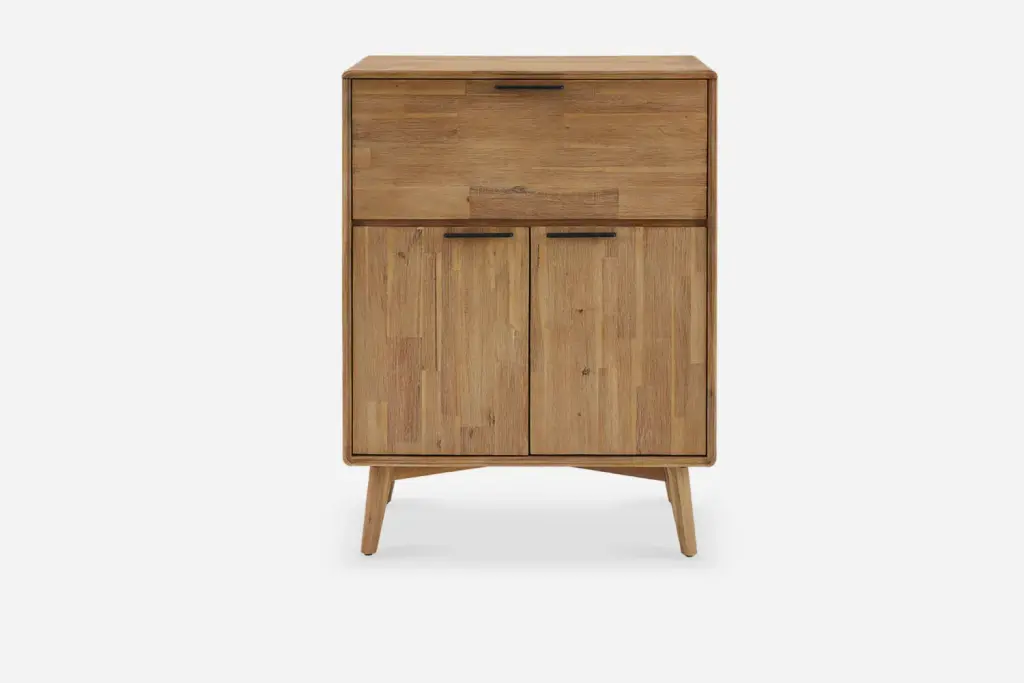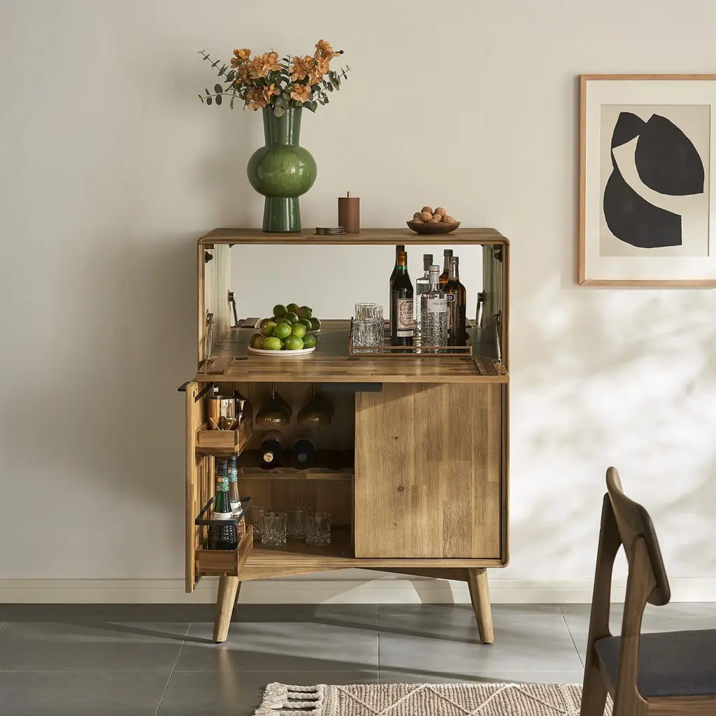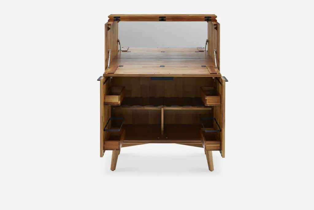 Functionally designed with fluted shelving and a stemware rack, the Seb Bar Cabinet fulfills your party needs with a mid-century modern appeal.