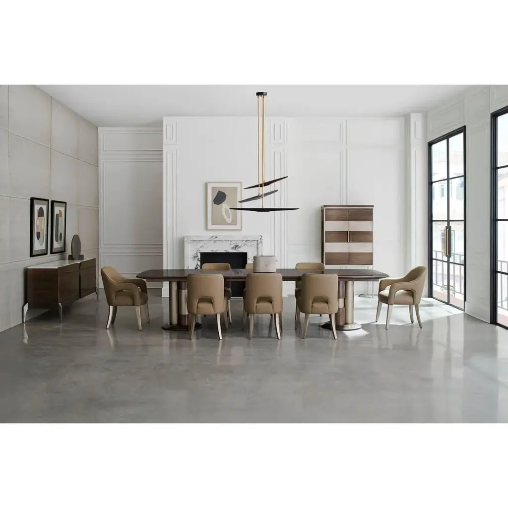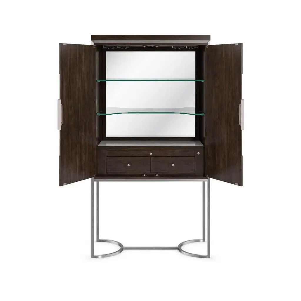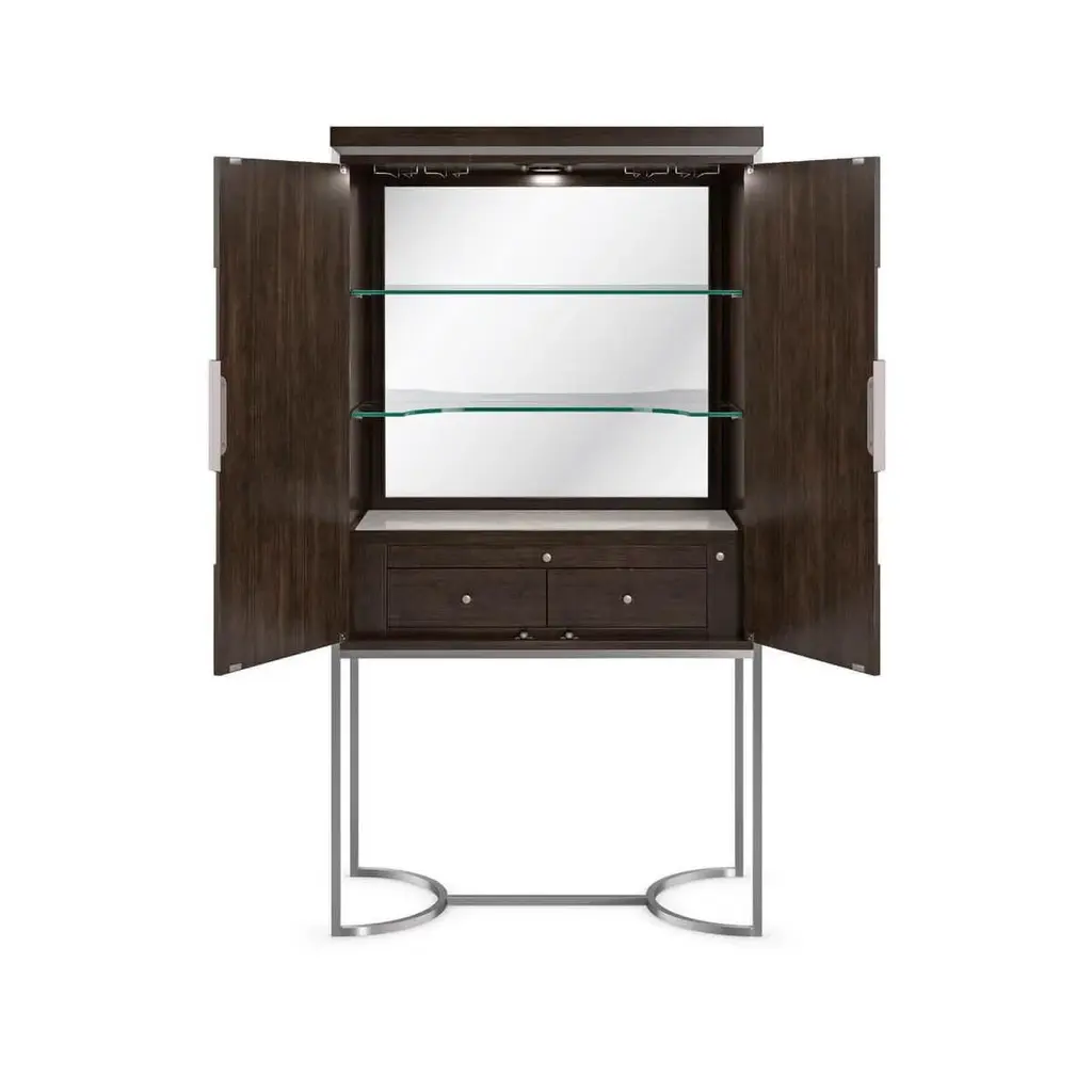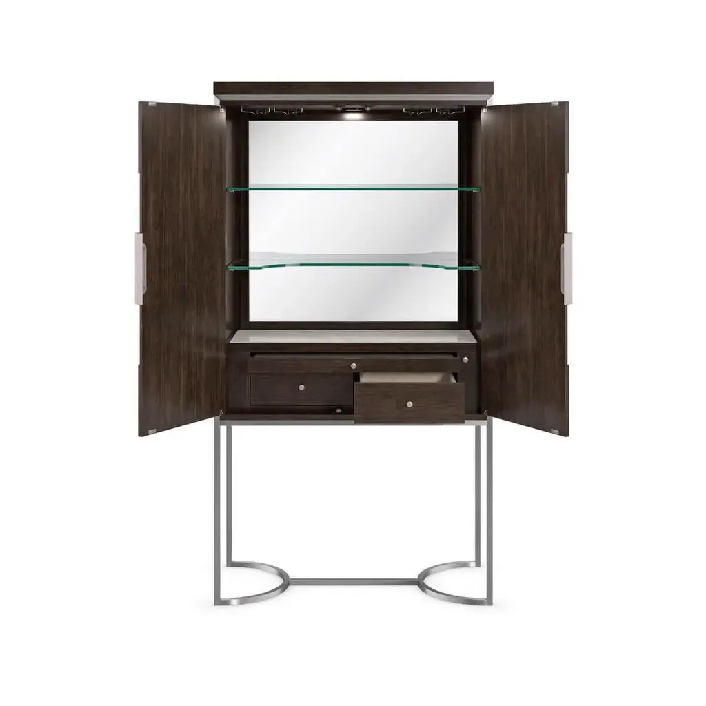 This architectural bar cabinet fuses form and function in an intriguing mix of materials and finishes. Its linear design adds height to a room, with a lavish amount of space for entertaining essentials. Features a mirrored back and lit interior with adjustable glass shelves, two drawers, a white marble work surface, and metal frame stemware storage. A pullout laminated shelf lets you serve guests with ease. Dimensions: 36" W x 20" D x 78" H FEATURES: Metal frame in Smoked Stainless Steel Paint. Interior features: clear mirrored back, white marble work surface, two adjustable glass shelves and two drawers with side guides. Upper wine glass storage. Pull out shelf with laminated surface, Interior light with touch dimmer. Drawer interior in Soft Silver Paint.