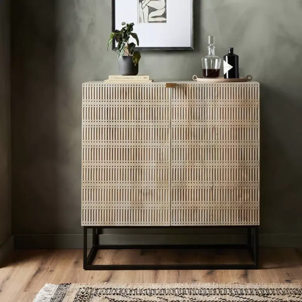 Customize your living room with the Class Cabinet from Dutchbone. Made with acacia wood, features steel square tube legs, and door handles are coated in an antique brass finish.