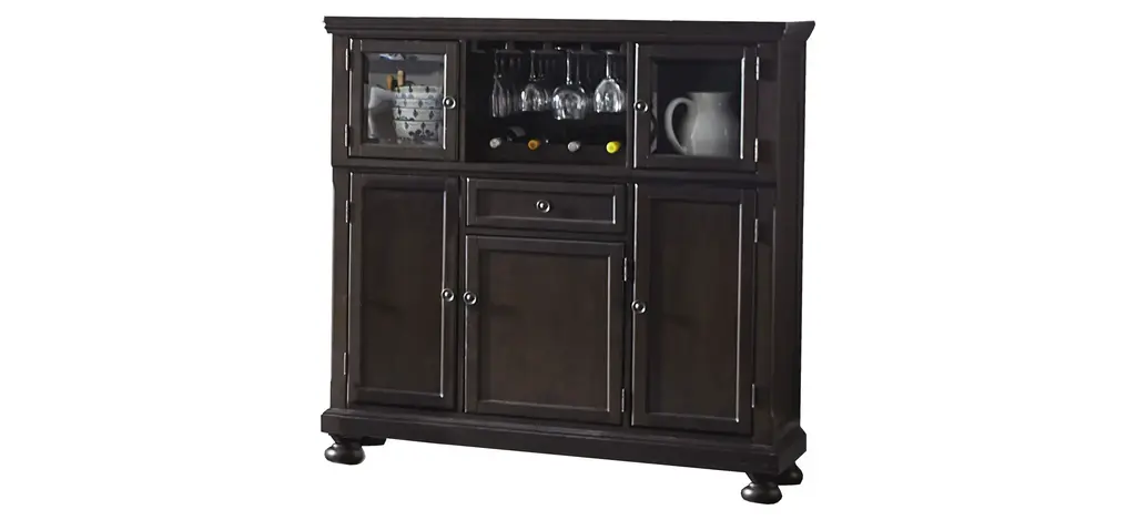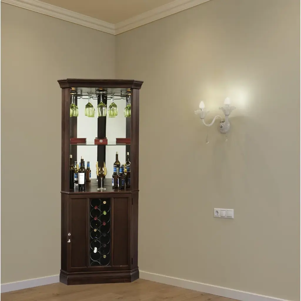 This traditionally styled Wine and Bar cabinet combines plentiful storage with a convenient space-saving corner design.