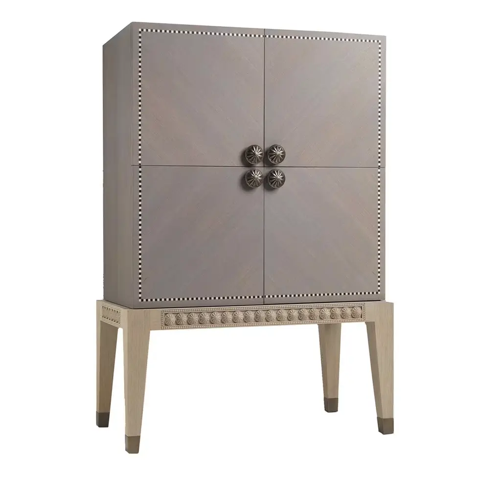 Beveled Edge Top & Duster Finish Mahogany Veneered SidesTwo Vertical Channel Paneled Doors with Metal Framed DetailsLit Interior with a Mirror Back , Glass Inset Shelves & Glass HoldersTurned Tapering Legs Joined by Bronze Finish Stretchers