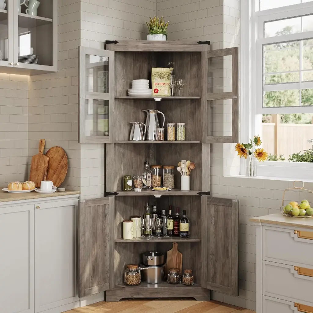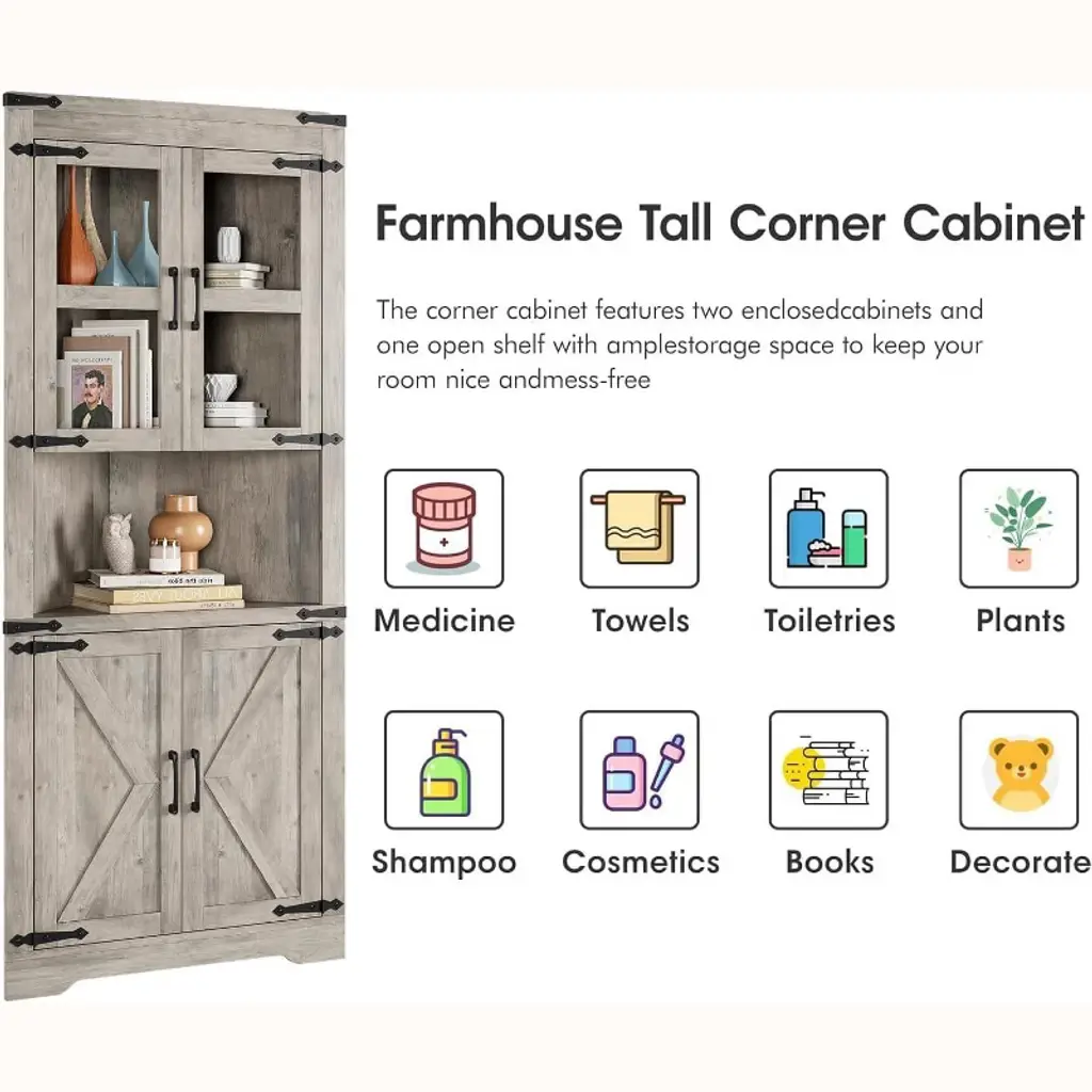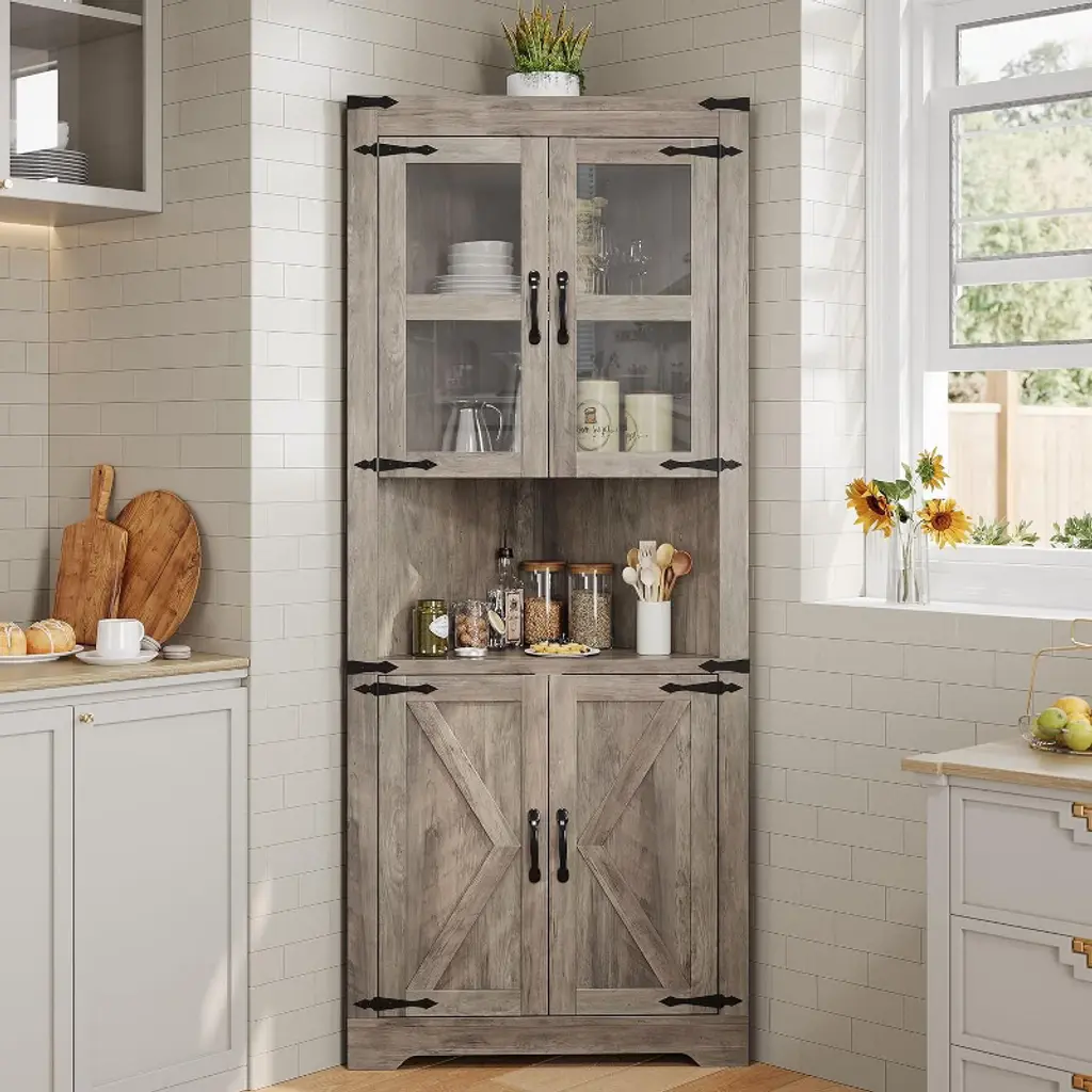 Add charm and convenience to your home with theTall Corner Cabinet, designed to blend farmhouse style with space-saving functionality. Finished in a washed gray tone with a rustic wood texture, this cabinet features a unique combination of two glass doors on top and two barn-style doors on the bottom, offering both display and hidden storage in one elegant unit.Crafted from durable engineered wood with a waterproof finish, this cabinet is ideal for high-traffic areas like bathrooms, kitchens, or laundry rooms. The tall, vertical design makes it easy to tuck neatly into corners, maximizing space in small or narrow areas.With adjustable shelves in both compartments, you can customize storage for kitchenware, home bar items, linens, or decorative pieces. Metal handles and a sturdy base offer long-lasting reliability, while the anti-tip safety kit ensures secure installation for households with children or pets.