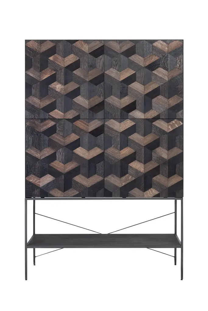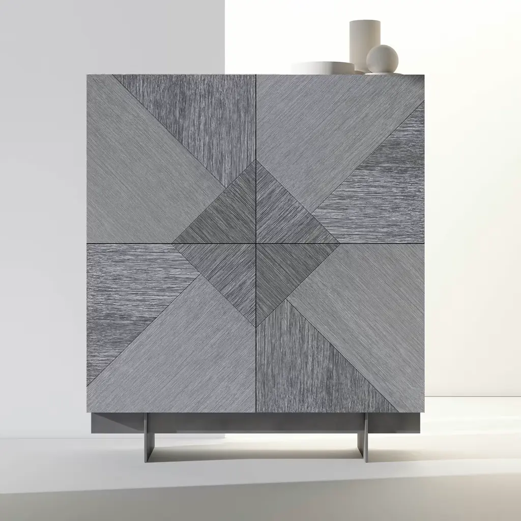 Container cabinet with 4 push-pull doors and equipped with 1 fixed shelf, 2 internal drawers and 2 crystal shelves. External finish "Tatami" in two color combinations: Silver/Nickel. Top and sides with monochromatic Tatami decoration. Internal finish in wengé wood essence. Base in lacquered metal. BAR OPTION: Methacrylate mirrored bottom LED lighting on the two vertical sides Undermounted steel cup holder