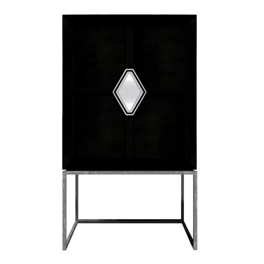 Part of the Temptation collection, this bar cabinet features two glass doors enriched by the use of "Lati" exotic wood for the structure. The irregular decorations are hand-engraved and fulfilled with liquid brass metal finishing. On the inside, a seamless mirror reflects the light from an LED light stripe perfectly inserted underneath the top. With its crystal shelves and the drawer allows plenty of storage space. The handles are made in golden galvanic metal. All is completed by a top strip and details on top and bottom of the legs in galvanic gold metal. Please ask Concierge for customization details.