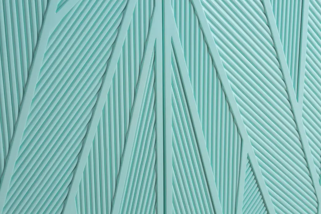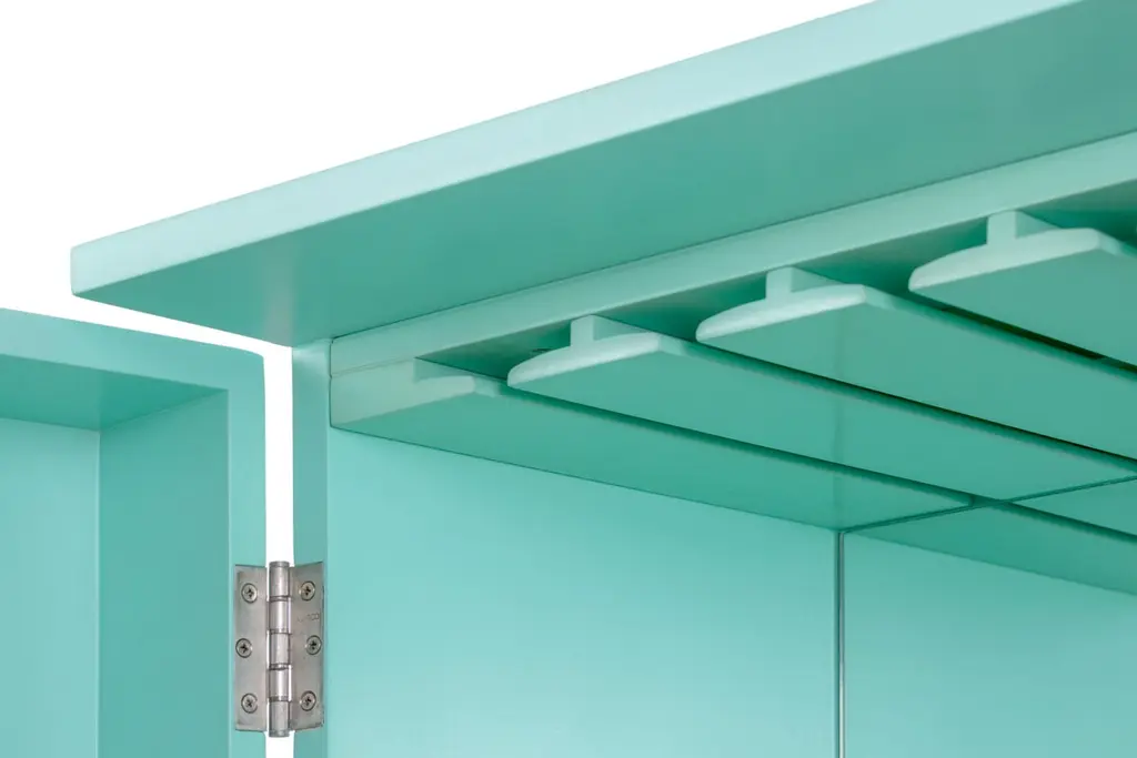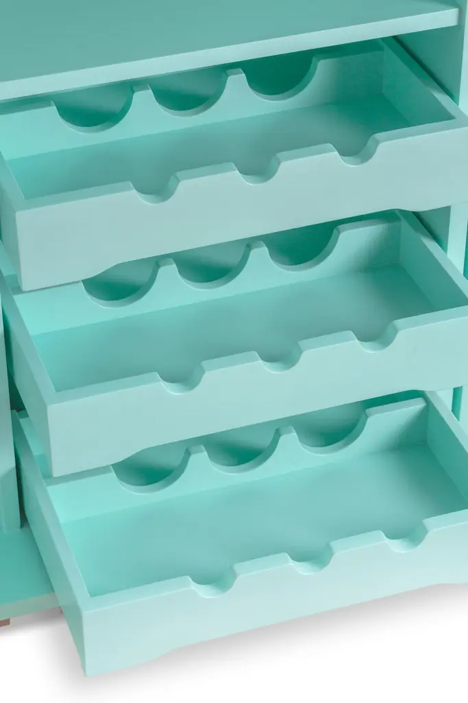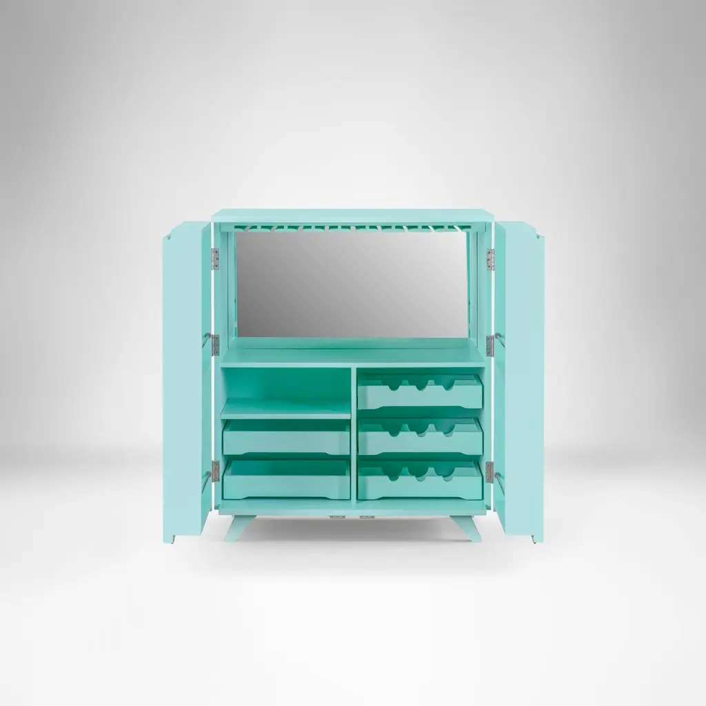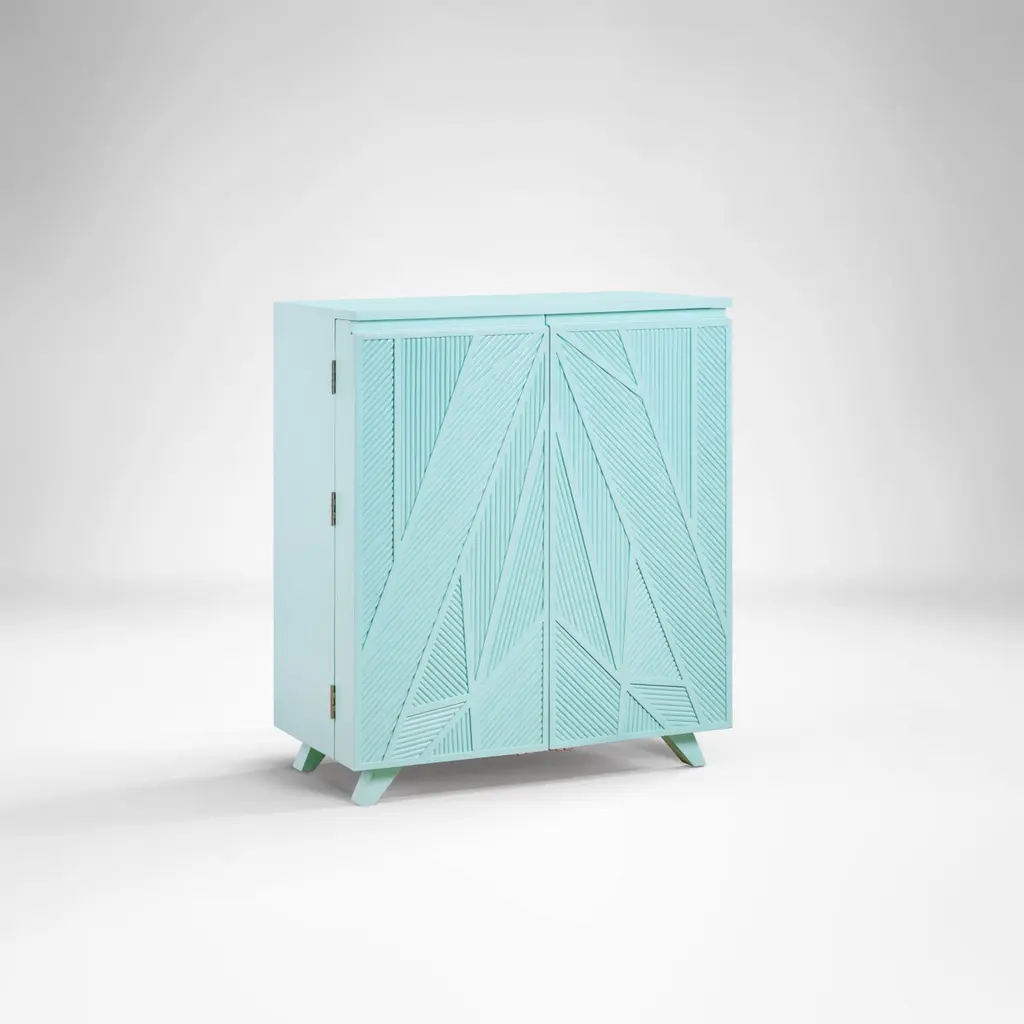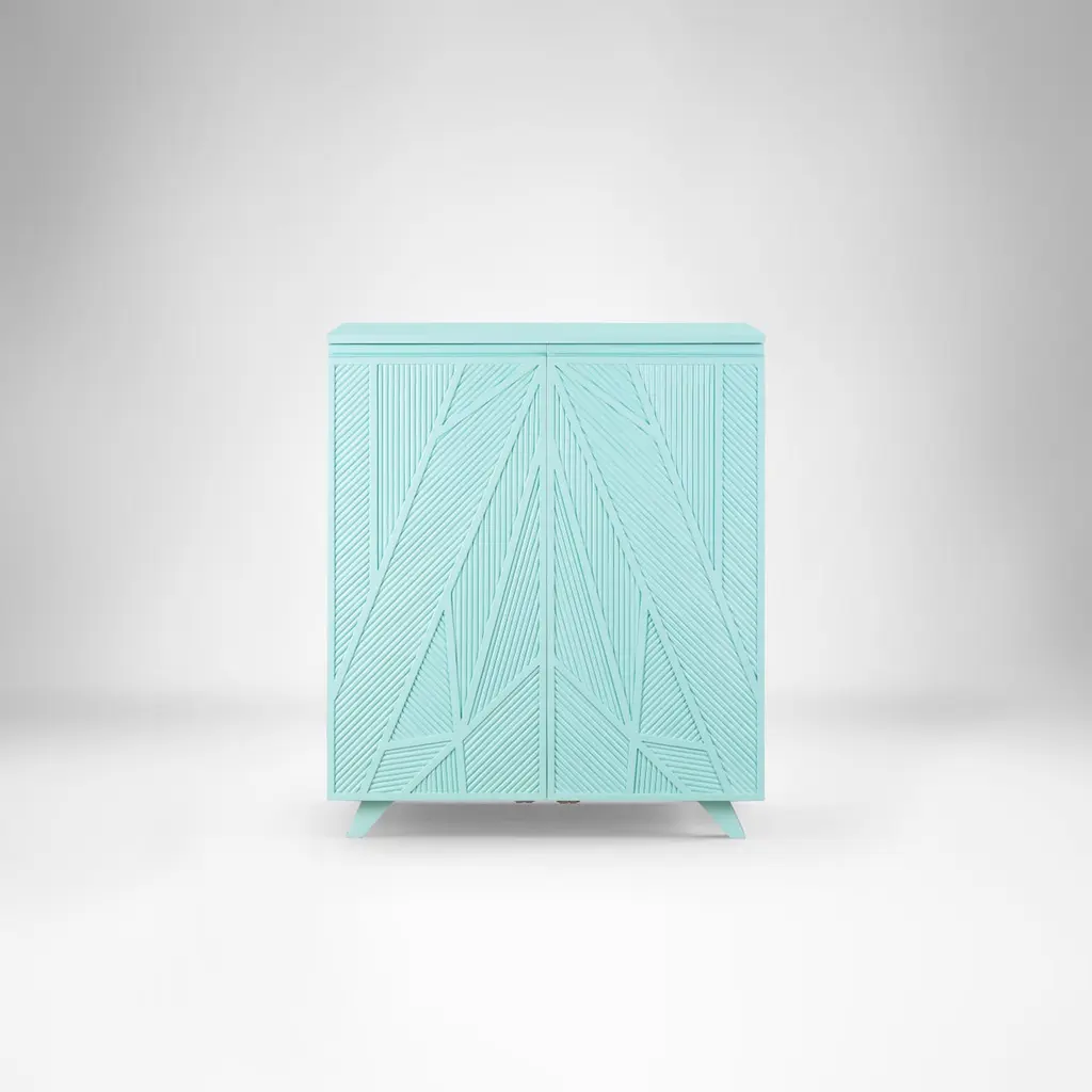 Tiffany blue geometric bar cabinet inspired by Ancient Egypt use of Palm BranchOur unique Cool Palm bar cabinet manifests Ancient Egyptian woven palms in a vibrant Tiffany blue shade. The dynamic pattern will surely give life to your room with its organic geometric pattern. Feeling the cabinet’s intertwined texture is highly irresistible as the eye-catching pattern will marvel your senses because it looks as good as it feels! Fully loaded with all sorts of shelves, bottle drawers and glass holders for the perfect bar experience. Can be made in other colors.