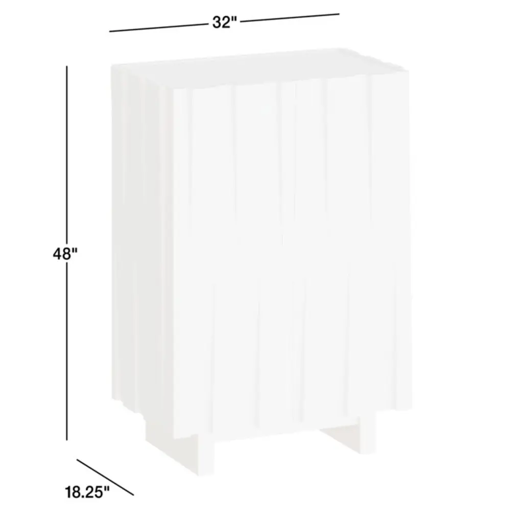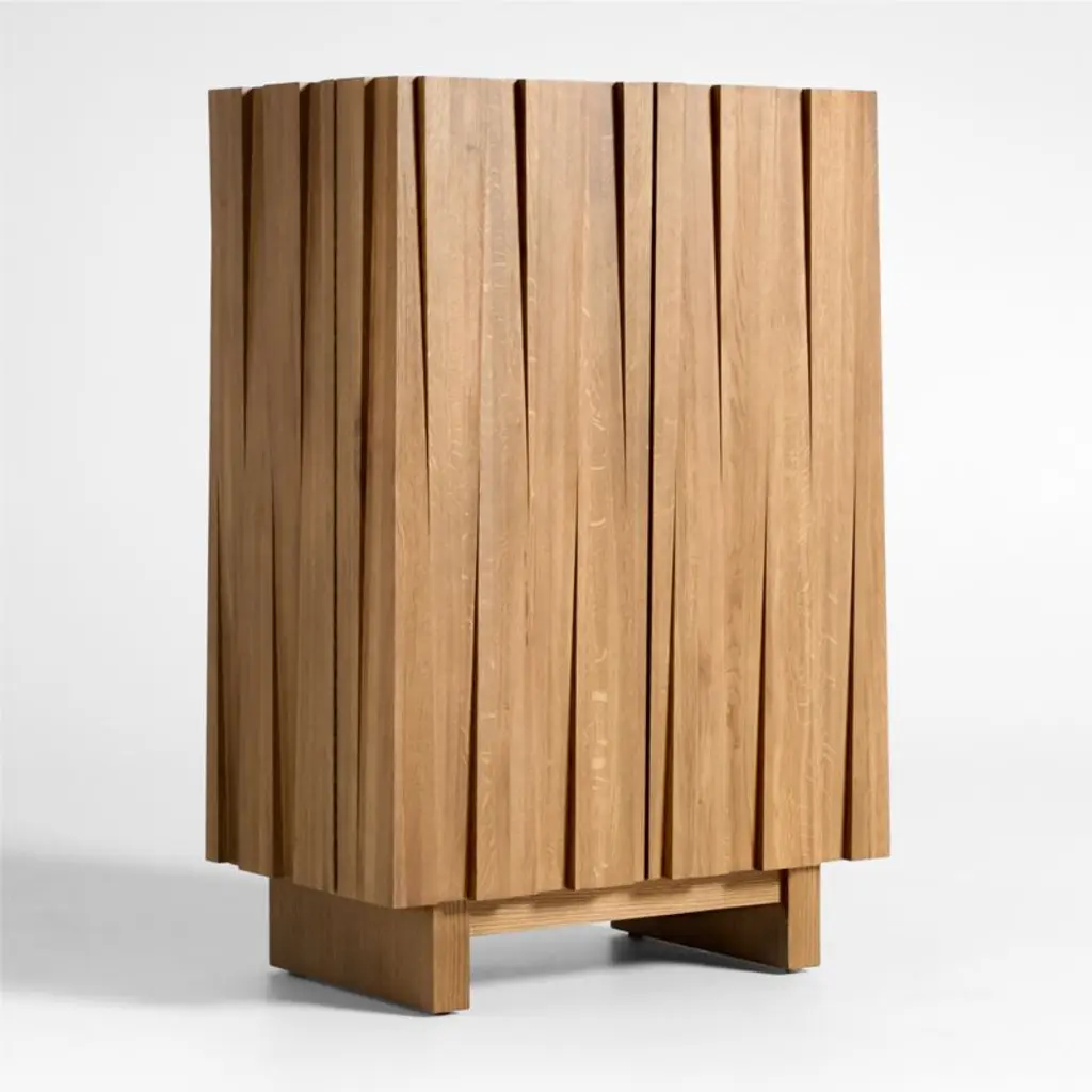 From the textured geometry of its exterior to the thoughtfully equipped interior, this bar cabinet stands alone. Alternating angled planks of quartered white oak create an undulating facade on the front and sides that showcases the wood's unique flake patterning: straight grain accented with fleck-like figures called "medullary rays." A home bartender's dream come true, the bar opens to full-service functionality with wine glass racks, bottle storage on the doors, wine bottle cubbies, two shelves, a work surface and a drawer.Exclusive collaboration! L.A.-based star designer Brigette Romanek redefines design rules as only she can, with playfully unexpected forms to bring you the fresh look her A-list clients love.