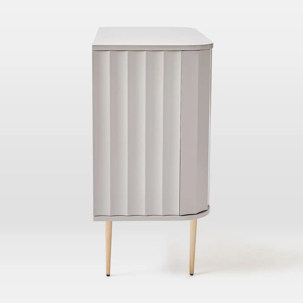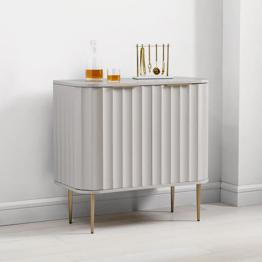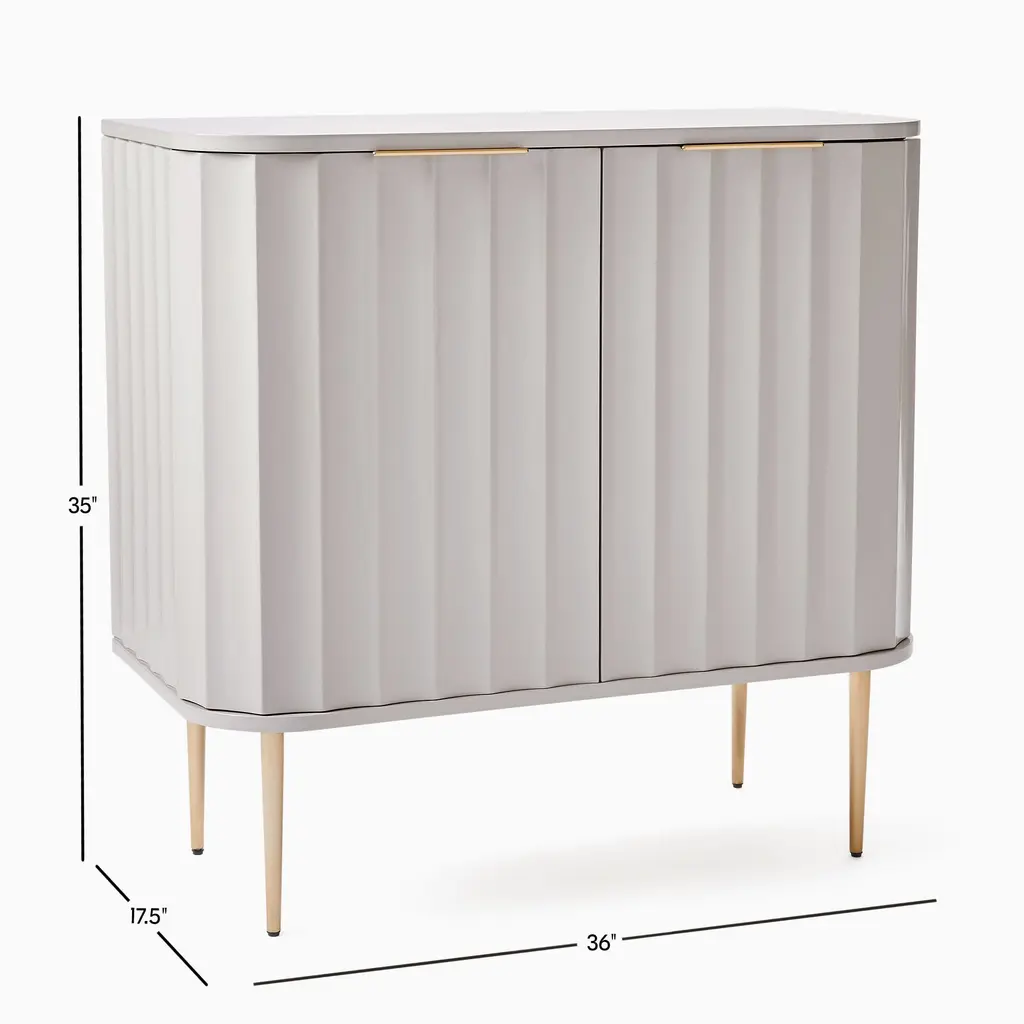 Adds a dose of old Hollywood glamour. Its curved frame & bronze-finished hardware. Ample room for your bar essentials.