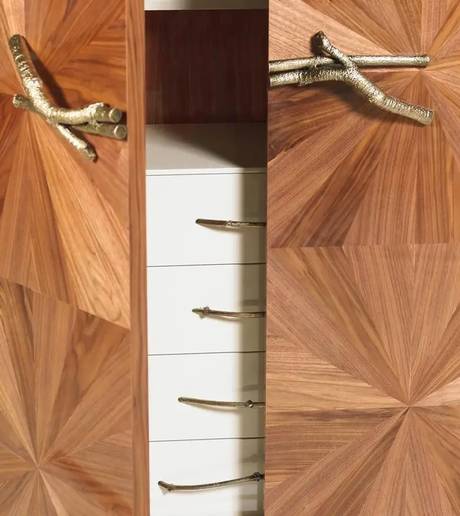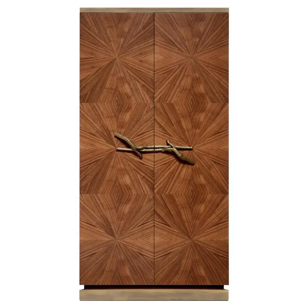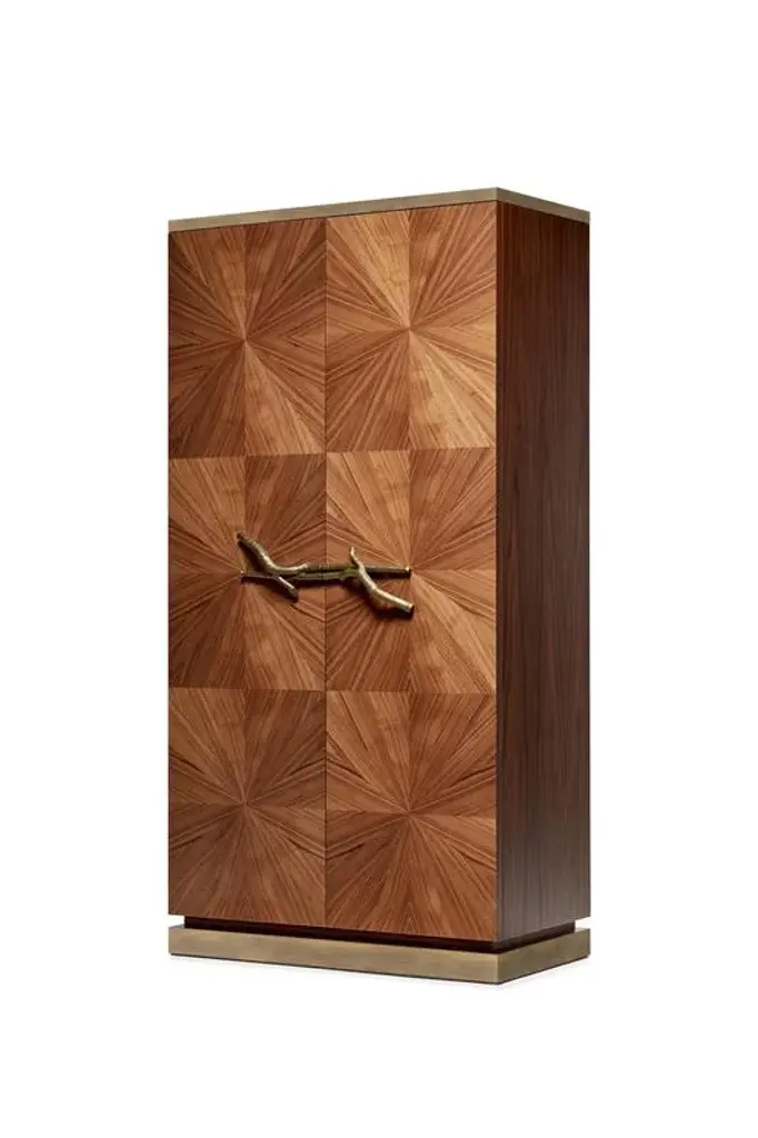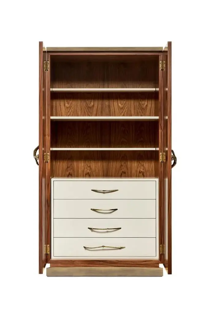 Walnut Bar Cabinet by Ginger & Jagger Dimensions: D 56 x W 100 x H 196 cm. Materials: American walnut, brass, and lacquer. Finish: Doors in American Walnut veneer in matt; drawers and shelves in Stone gloss lacquer; handles in cast Brass in Antique Brass finishing; top and footer in Antique Brass. This product is suitable for custom size. This product is made for living areas and interior spaces only. This product is not specified for bathrooms, spas, or humid environments. Not suitable for exteriors.