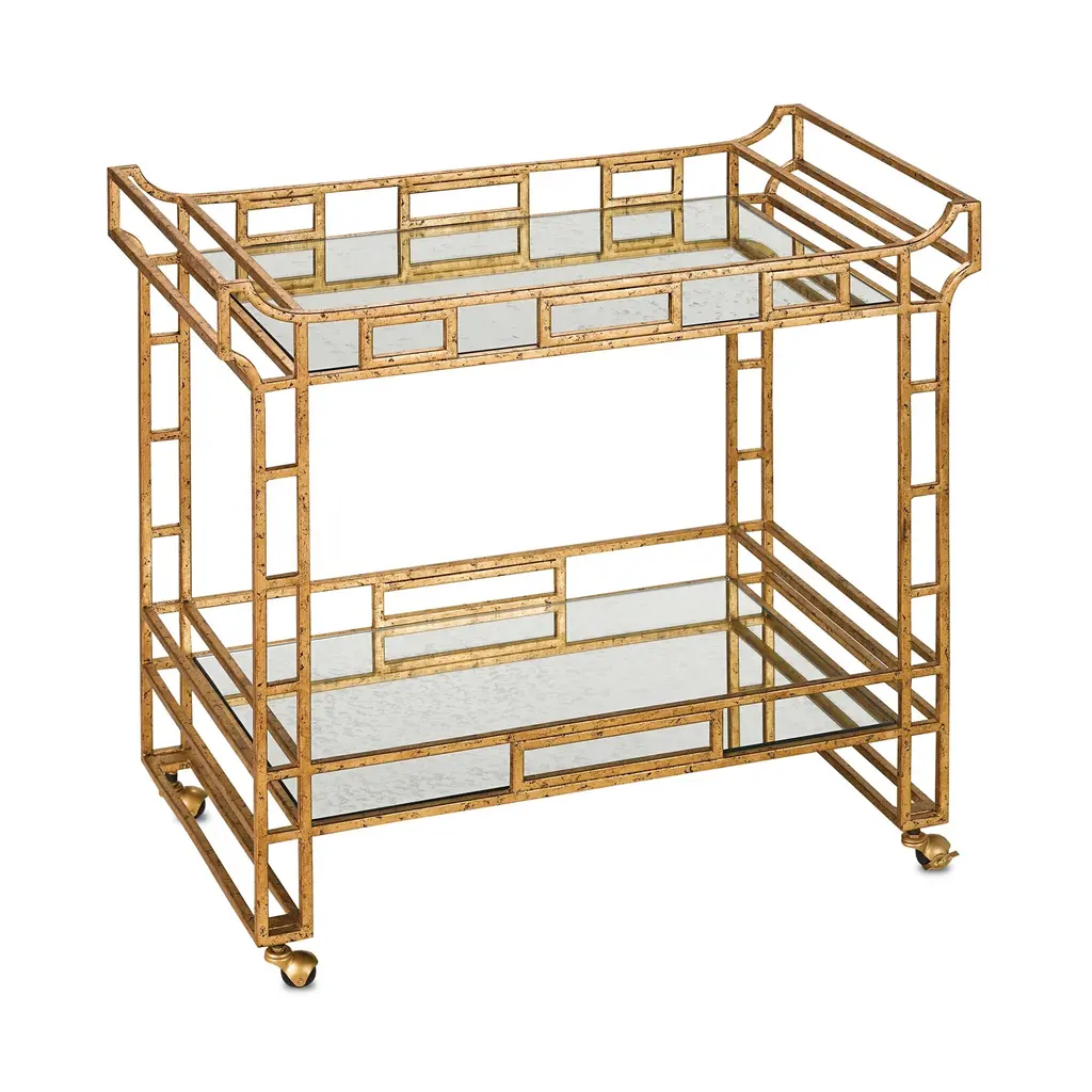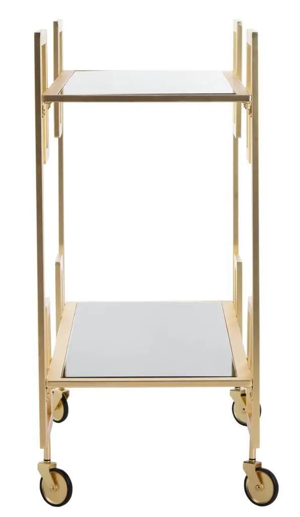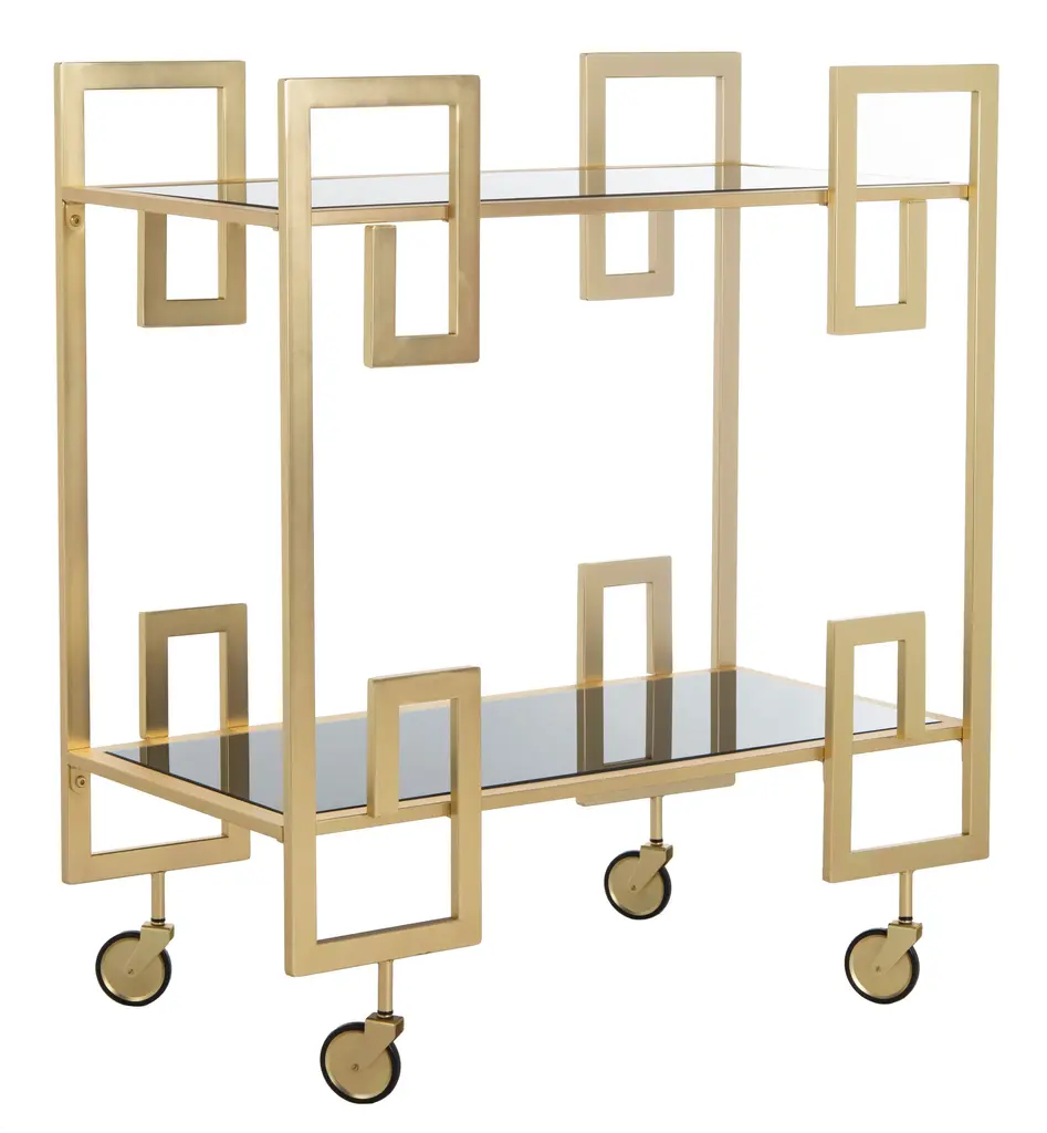 A contemporary classic, this 2-tier bar cart was designed to add modern luxury to any room. it's timeless Greek key design is highlighted with a rich brass finish white it's chic black glass tiers graciously display glassware, beverages and culinary treats. Dust regularly with a soft, dry cloth. Never use oiled or treated cloths on lacquered finishes. Some finishes can be wiped with a damp (not wet) cloth, followed at once by rubbing with a dry cloth to remove fingerprints and smudges. For persistent spots, gently clean with a soft cloth and a solution of water and mild soap, make sure to wipe dry. Use adhesive felt pads, coasters and placemats to protect your furniture. Some assembly required.