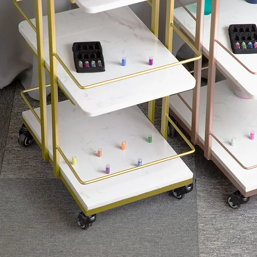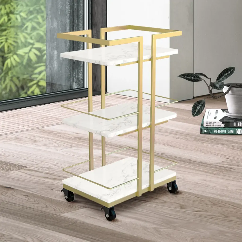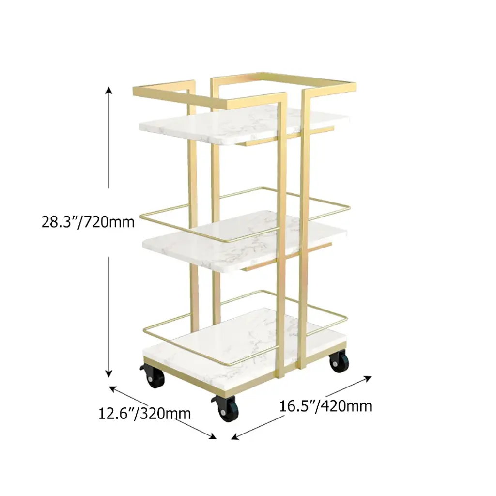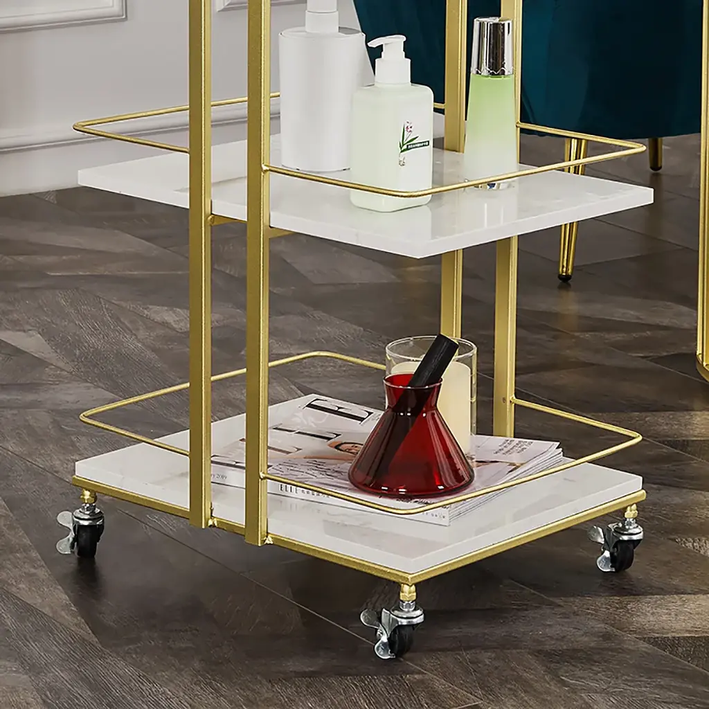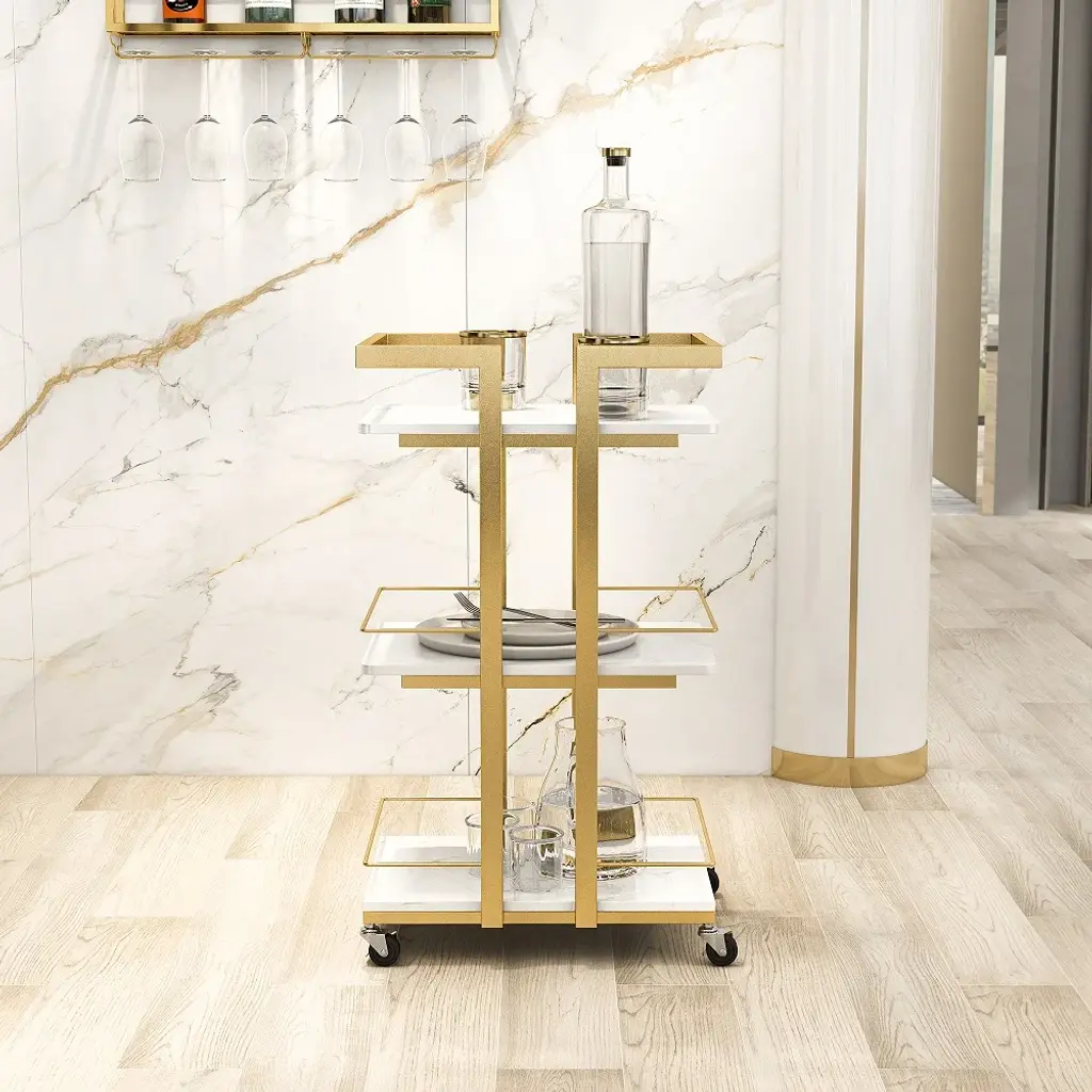 3-Tier Rectangular Rolling Bar Cart With Wheels Gold White Marble Shelves