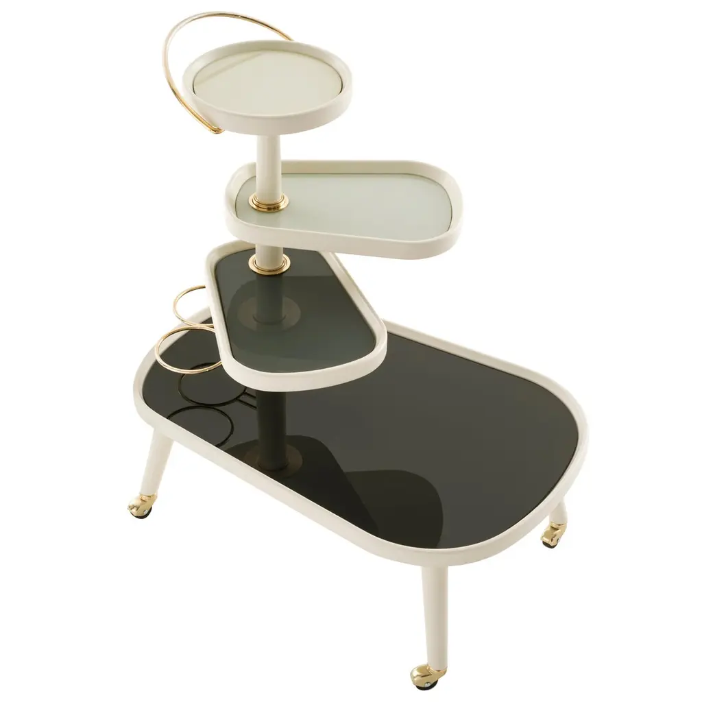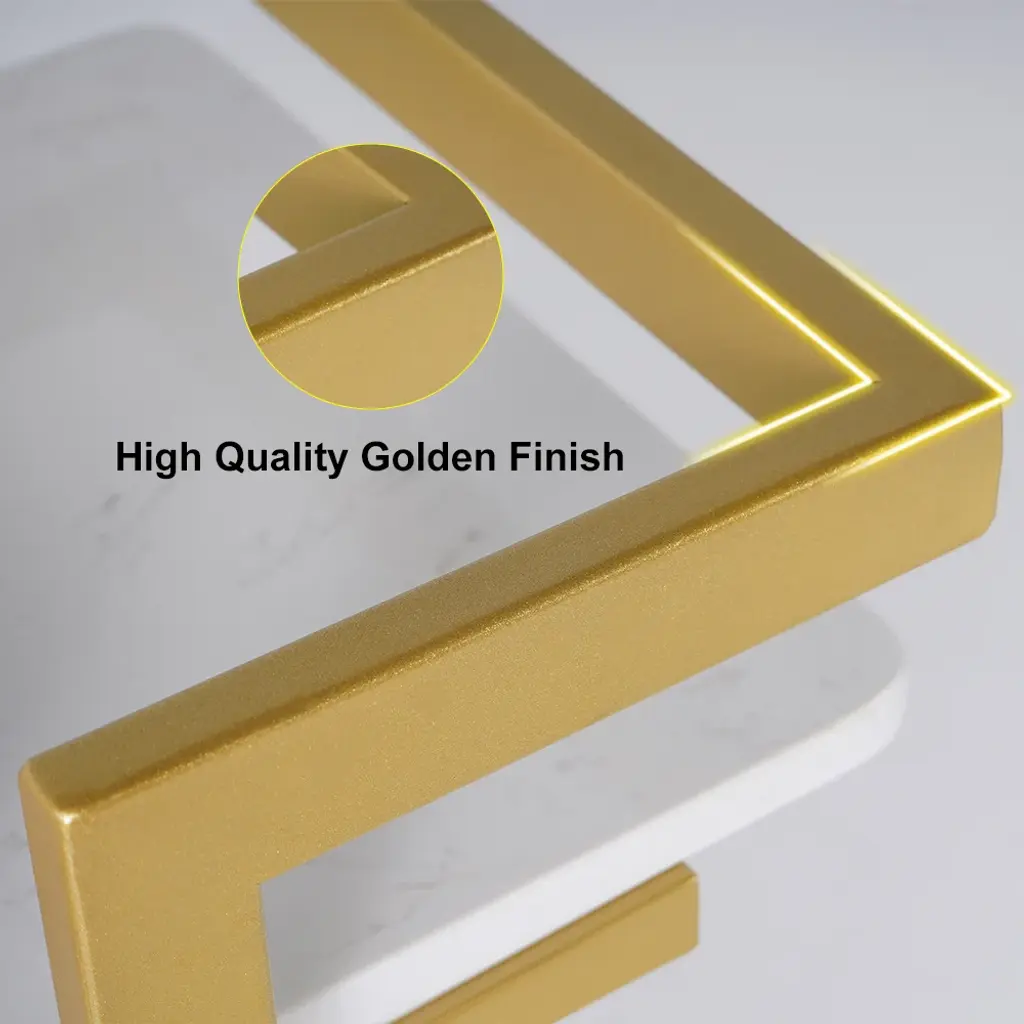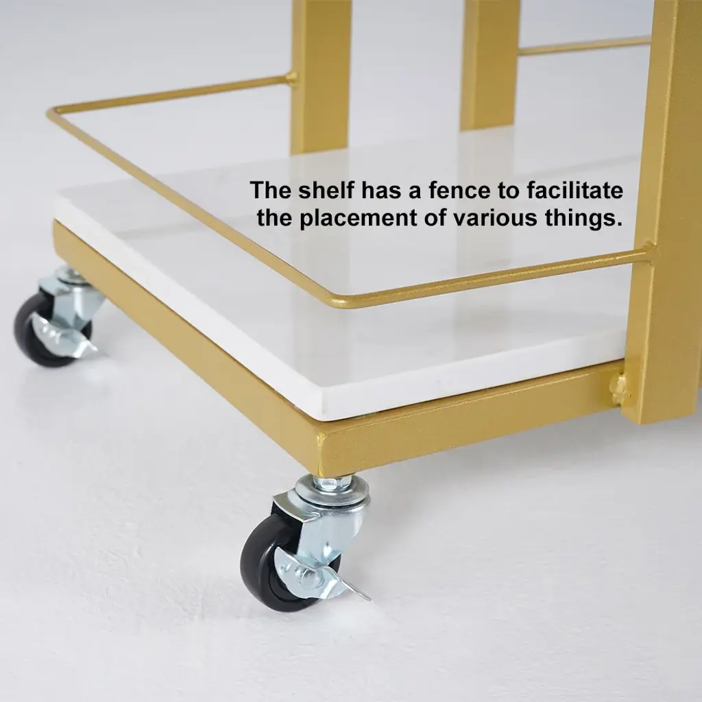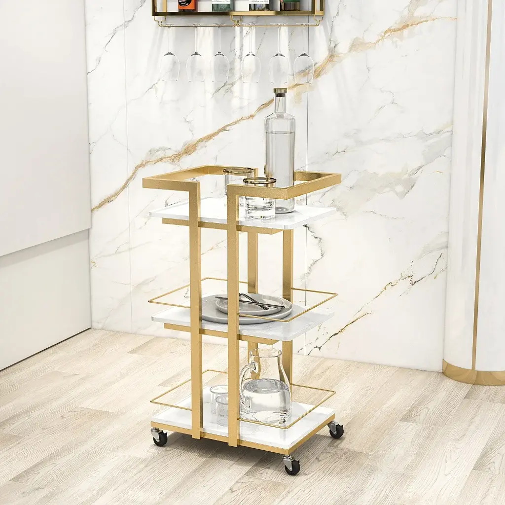 Bring streamlined style to your space with this modern square bar cart. Crafted of metal in a gold finish, this bar cart strikes a 3-tiered rectangular silhouette on 4 casters. Feature in sleek side railings, the marble shelf creates a handy place for stowing mixers and handles of liquor, while adding a classy and unique look. Rounding out the design, built-in handles and four caster wheels offer effortless mobility.