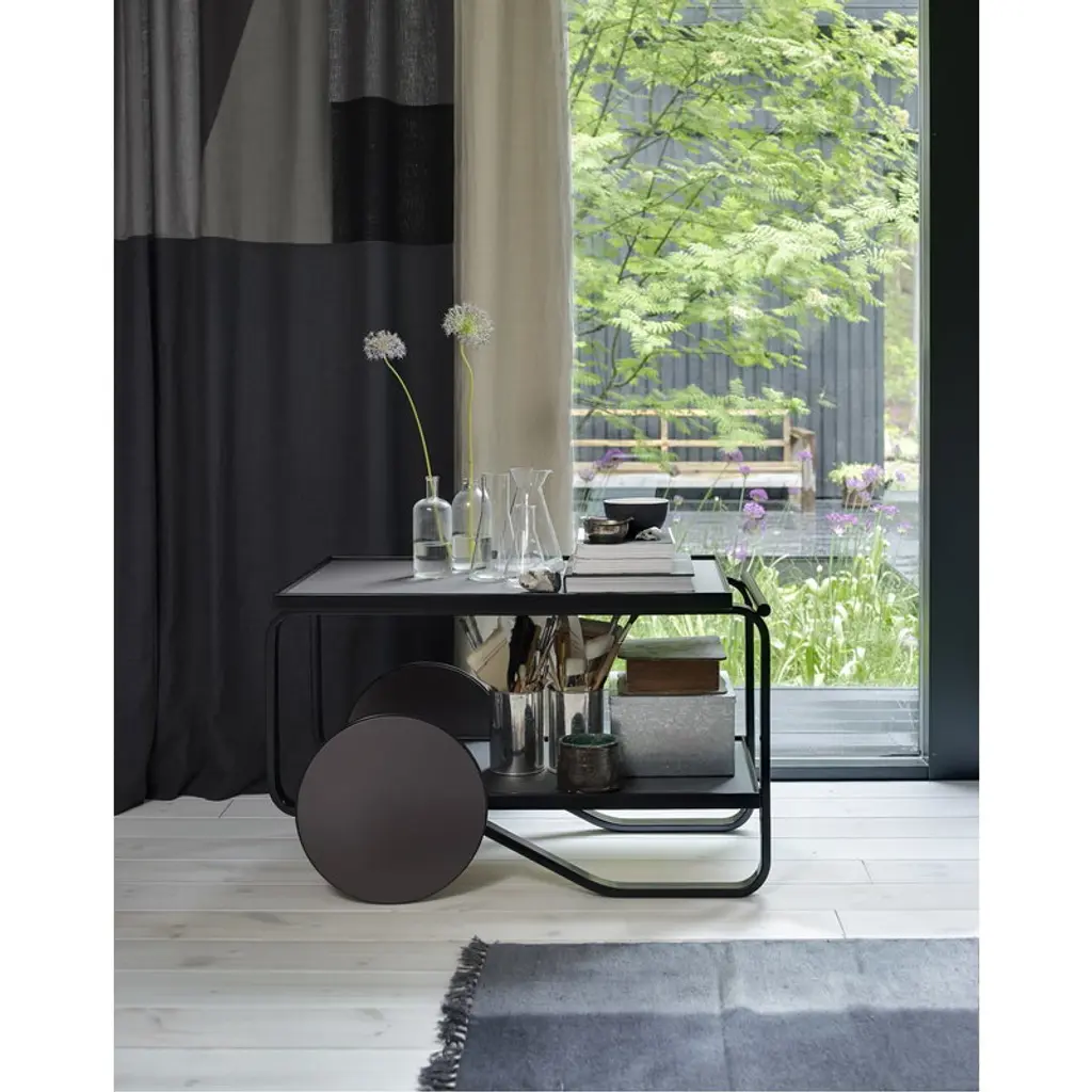 Artek's tea trolley 901, designed by Alvar Aalto in 1936, is the simplest and most graceful tea trolley among the ones created by Aalto. The expression of the tea trolley 901 has references to British tea culture as well as Japanese woodwork and architecture. After delving into Artek’s archives, Dutch designer and color specialist Hella Jongerius created two new color combinations for the trolley: dark and light. The dark trolley is dressed in two stylish hues: the lacquered birch frame and the bottom linoleum tray are black, and the wheels and the top linoleum tray peat. The tea trolley 901 is an excellent side table for any home and perfect for serving tea, coffee and other refreshments.