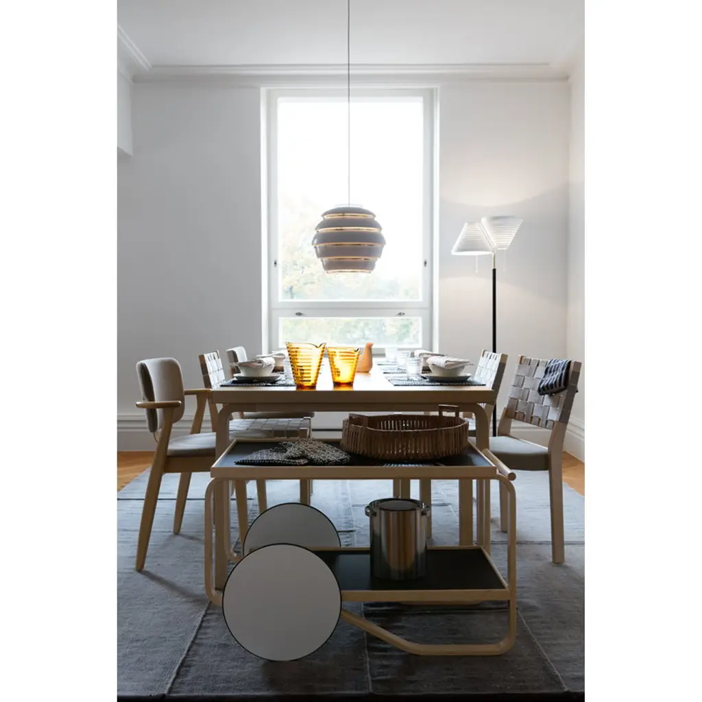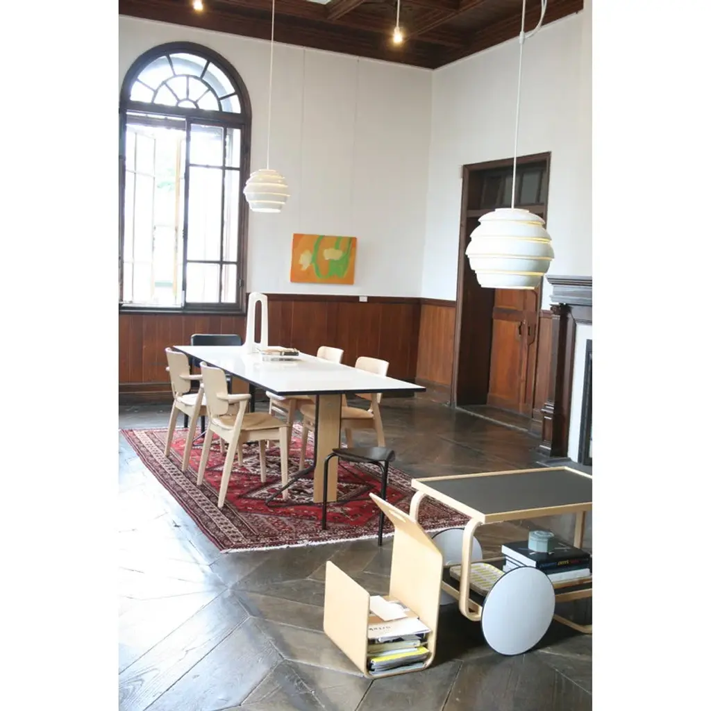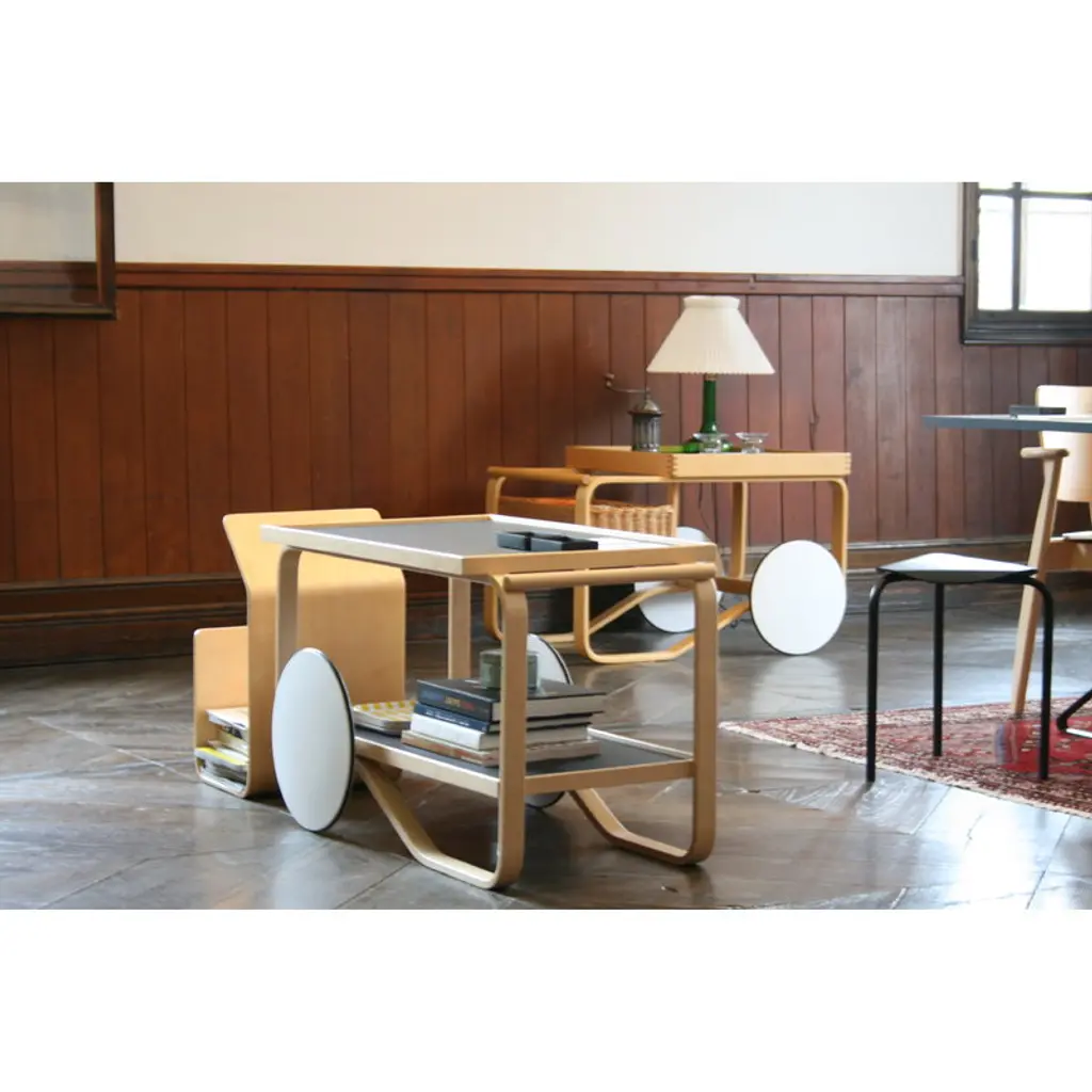 Artek's tea trolley 901, designed by Alvar Aalto in 1936, is the simplest and most graceful tea trolley among the ones created by Aalto. The expression of the tea trolley 901 has references to British tea culture as well as Japanese woodwork and architecture. Tea trolley 901 is one of Aalto's most recognizable masterpieces. The wheels and frame are made of natural birch, and the tabletops have been coated with easy-care linoleum. The tea trolley 901 is an excellent side table for any home and perfect for serving tea, coffee and other refreshments.