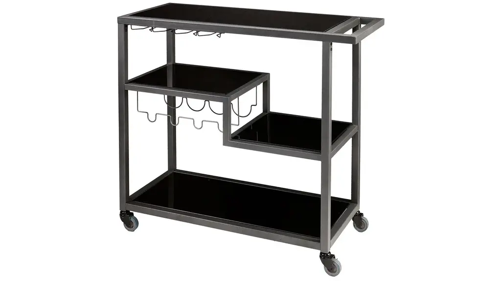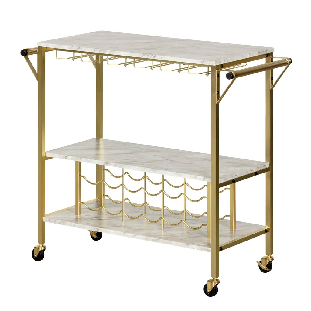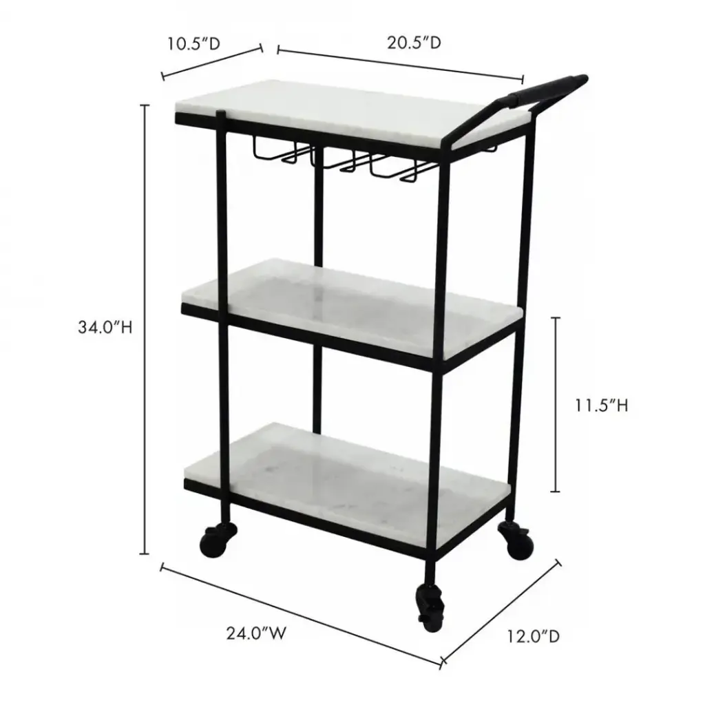 The Midnight bar cart is guaranteed to be a hit at your next hosting occasion. This dining room showstopper has a traditional style with a touch of retro glamor. Featuring three white marble shelves housed within an iron frame, this cart allows you to store your favorite drinks, glassware and cocktail accessories, and to serve your guests in style.