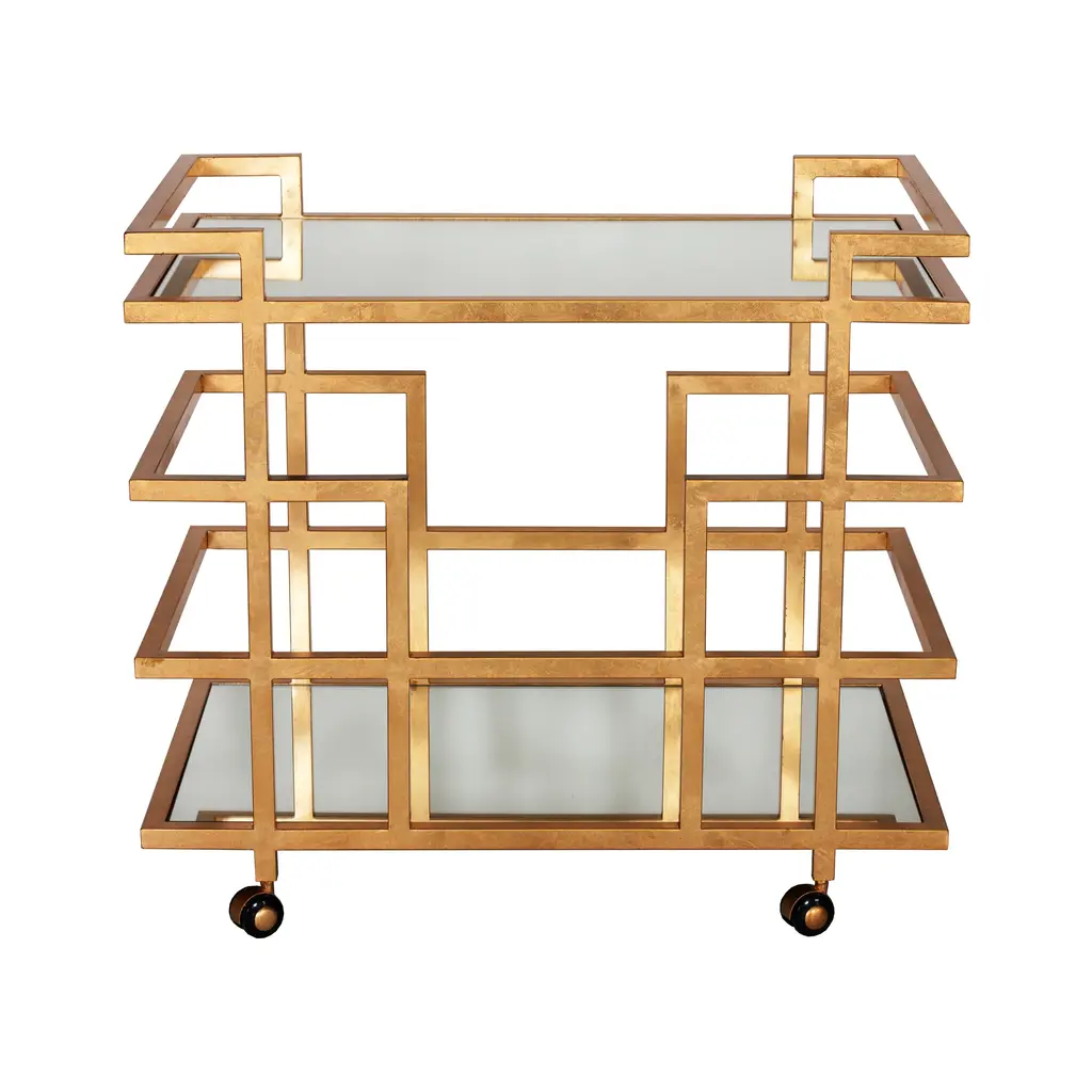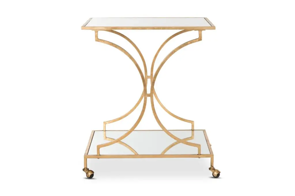 Step up your serving game with the Afton Bar Cart. The eye-catching design includes mirrored glass shelves perched atop a dramatically curved base with a lustrous gold finish.