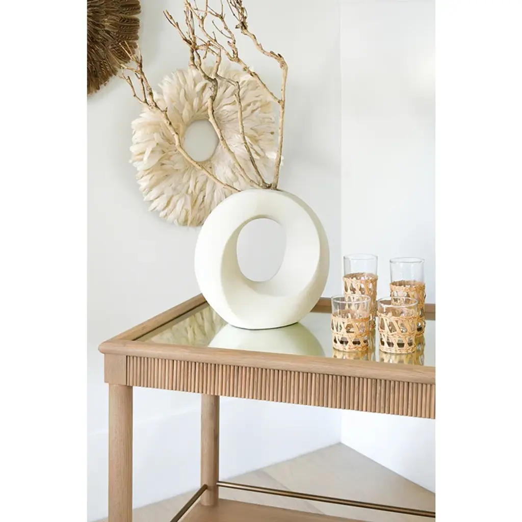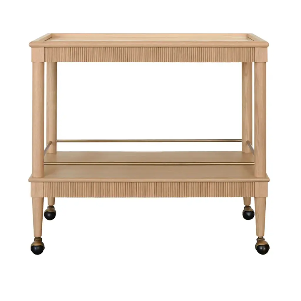 Ambassador leather inlay serving cart with gold tooling accents, mirror glass top, brass gallery, and casters.