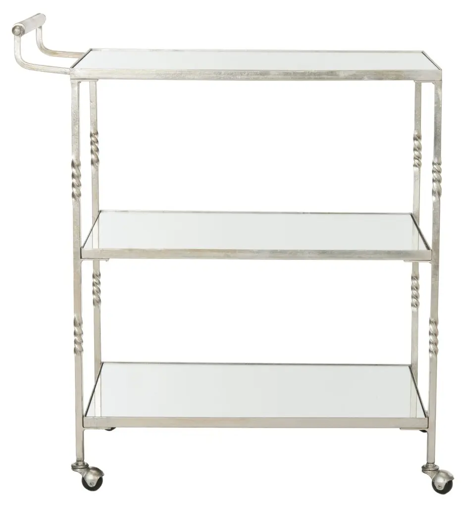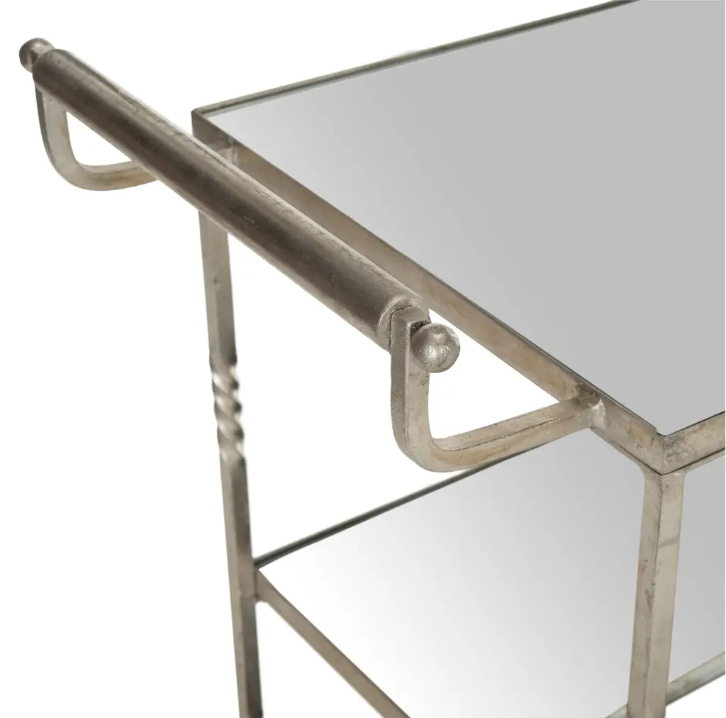 Entertain in chic style with this stylish bar cart. Featuring mirrored glass shelves and steering handles, this elegant trolley on casters is crafted of sturdy iron with a lustrous finish.