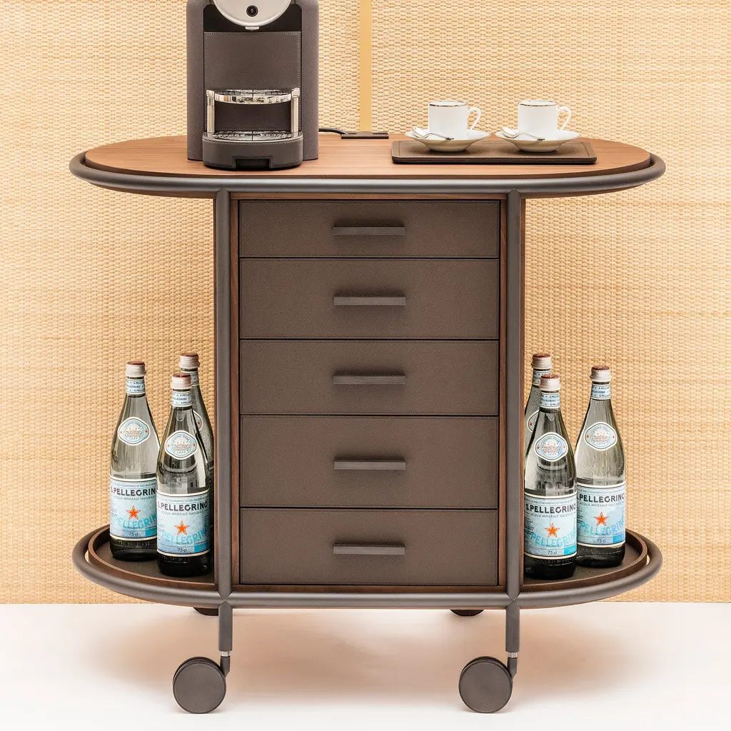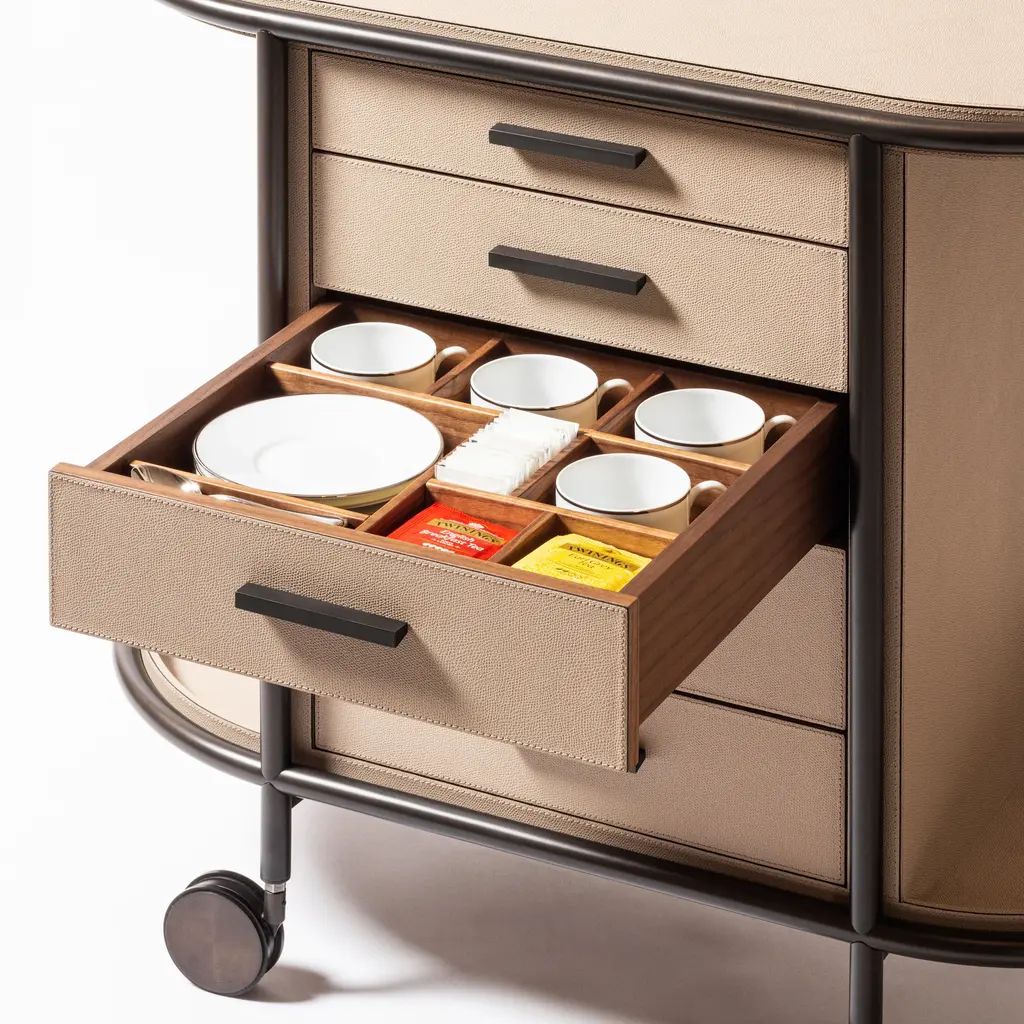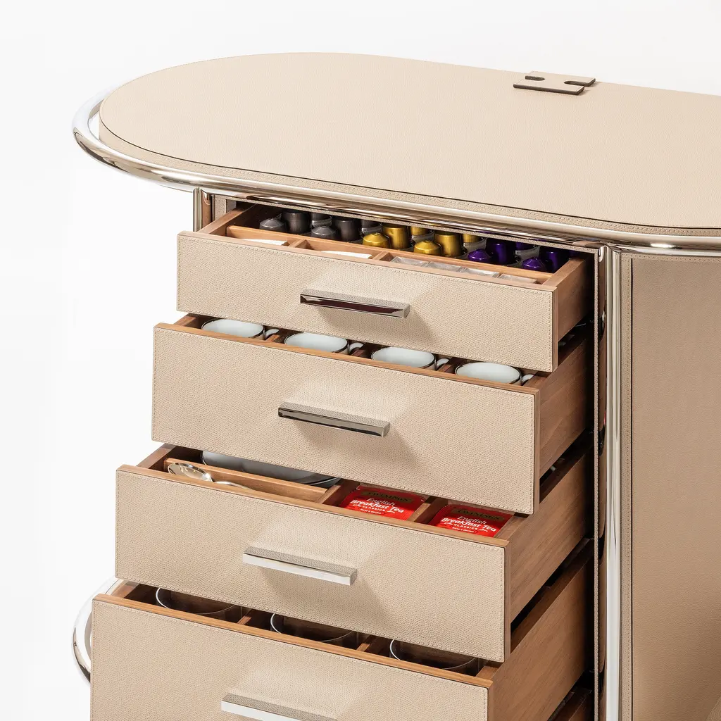 Elevating the art of hospitality, the Arcade Oval Coffee and Tea Bar Cart from Giobagnara is a masterclass in functional elegance. Expertly crafted in Italy, this mobile serving station features a solid walnut structure with a sleek metal frame. Five drawers, wrapped in printed calfskin leather, offer organized storage for coffee and tea essentials. More than a cart, it arrives as a complete hosting solution, including a curated set of porcelain cups and wooden service trays, making it the definitive statement piece for the discerning host. Highlights: