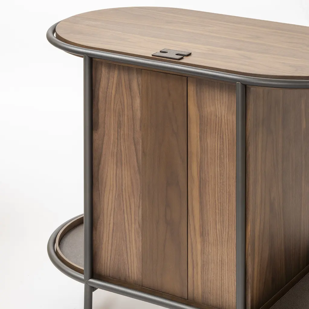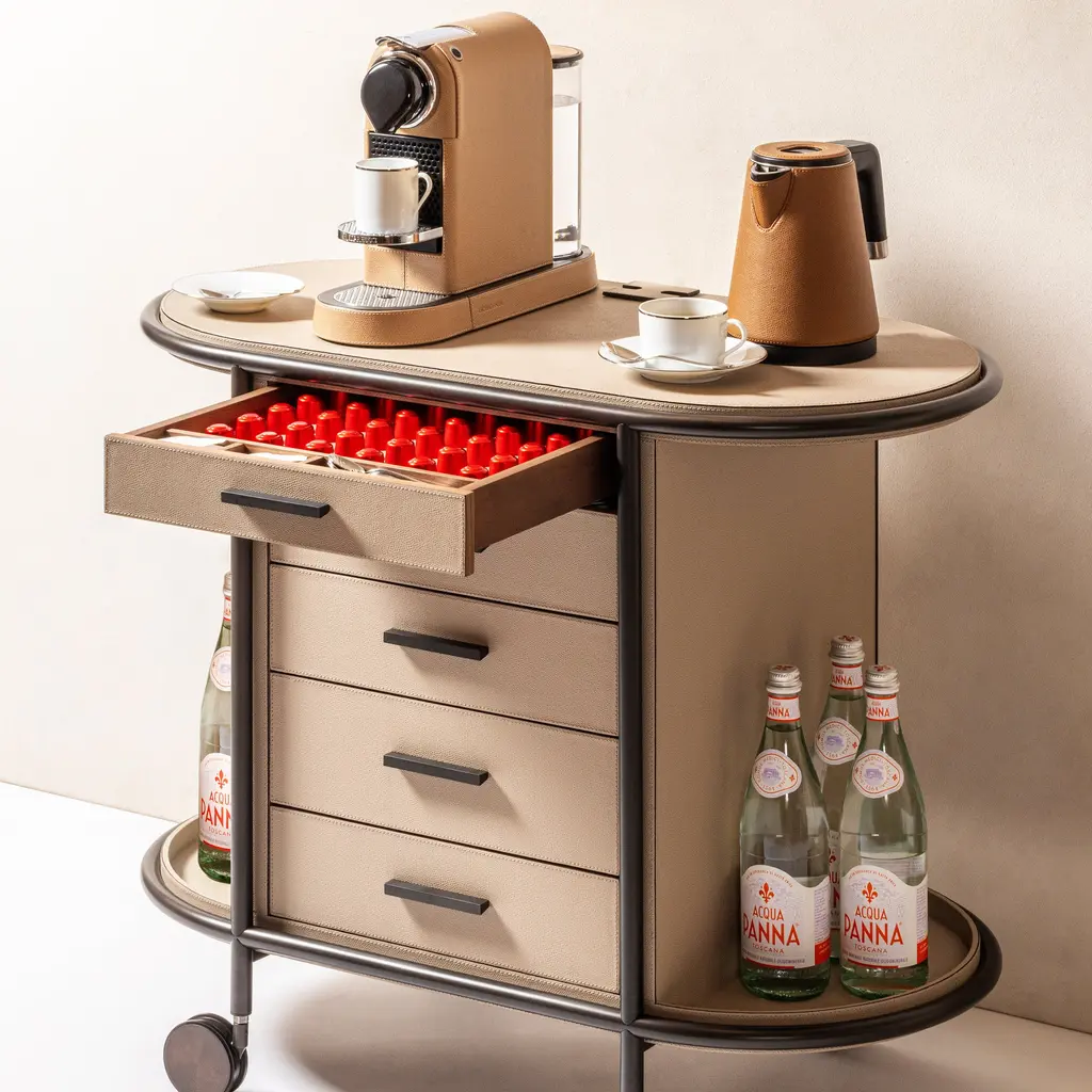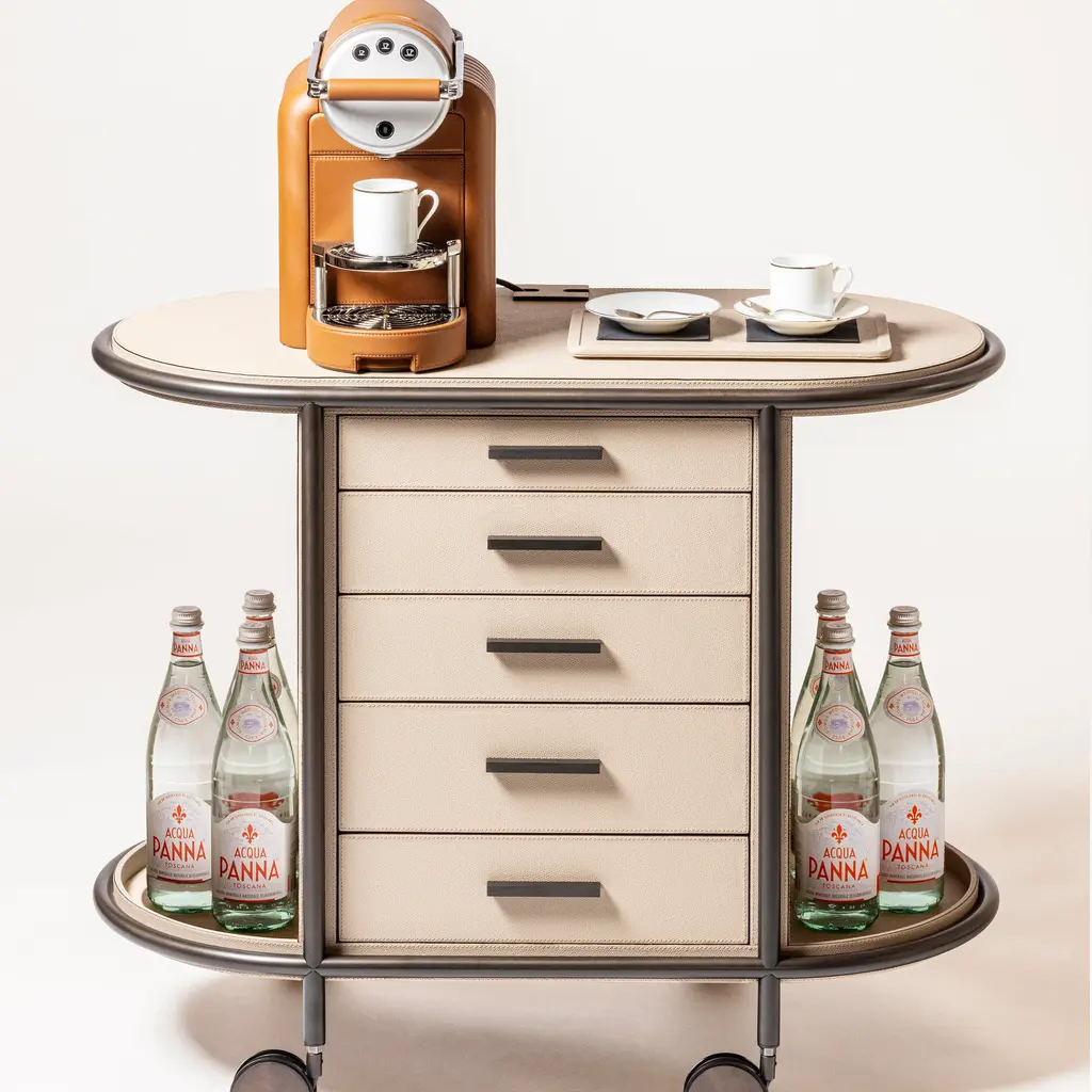 Elevating the art of hospitality, the Arcade Oval Coffee and Tea Bar Cart from Giobagnara is a masterclass in functional elegance. Expertly crafted in Italy, this mobile serving station features a solid walnut structure with a sleek metal frame. Five drawers, wrapped in printed calfskin leather, offer organized storage for coffee and tea essentials. More than a cart, it arrives as a complete hosting solution, including a curated set of porcelain cups and wooden service trays, making it the definitive statement piece for the discerning host. Highlights:
