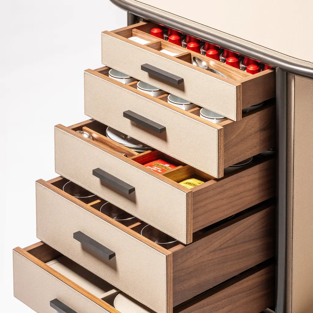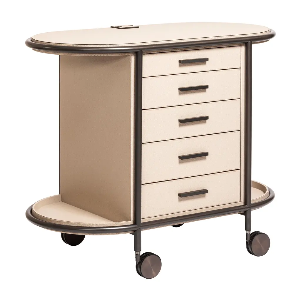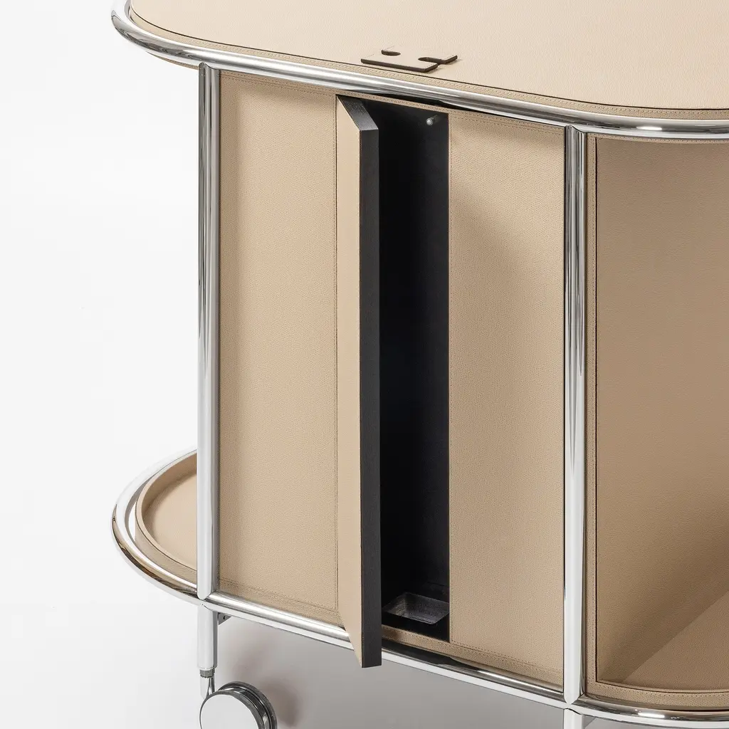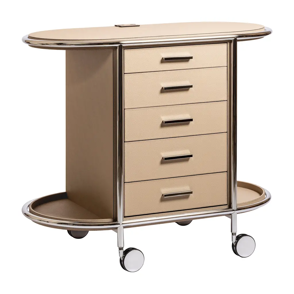 Elevating the art of hospitality, the Arcade Oval Coffee and Tea Bar Cart from Giobagnara is a masterclass in functional elegance. Expertly crafted in Italy, this mobile serving station features a solid walnut structure with a sleek metal frame. Five drawers, wrapped in printed calfskin leather, offer organized storage for coffee and tea essentials. More than a cart, it arrives as a complete hosting solution, including a curated set of porcelain cups and wooden service trays, making it the definitive statement piece for the discerning host. Highlights: