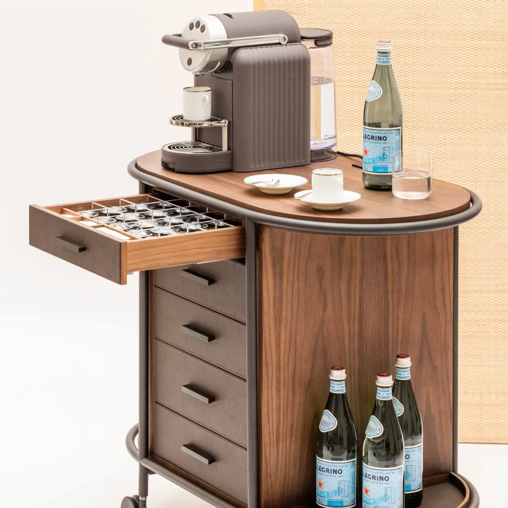 Elevating the art of hospitality, the Arcade Oval Coffee and Tea Bar Cart from Giobagnara is a masterclass in functional elegance. Expertly crafted in Italy, this mobile serving station features a solid walnut structure with a sleek metal frame. Five drawers, wrapped in printed calfskin leather, offer organized storage for coffee and tea essentials. More than a cart, it arrives as a complete hosting solution, including a curated set of porcelain cups and wooden service trays, making it the definitive statement piece for the discerning host. Highlights: