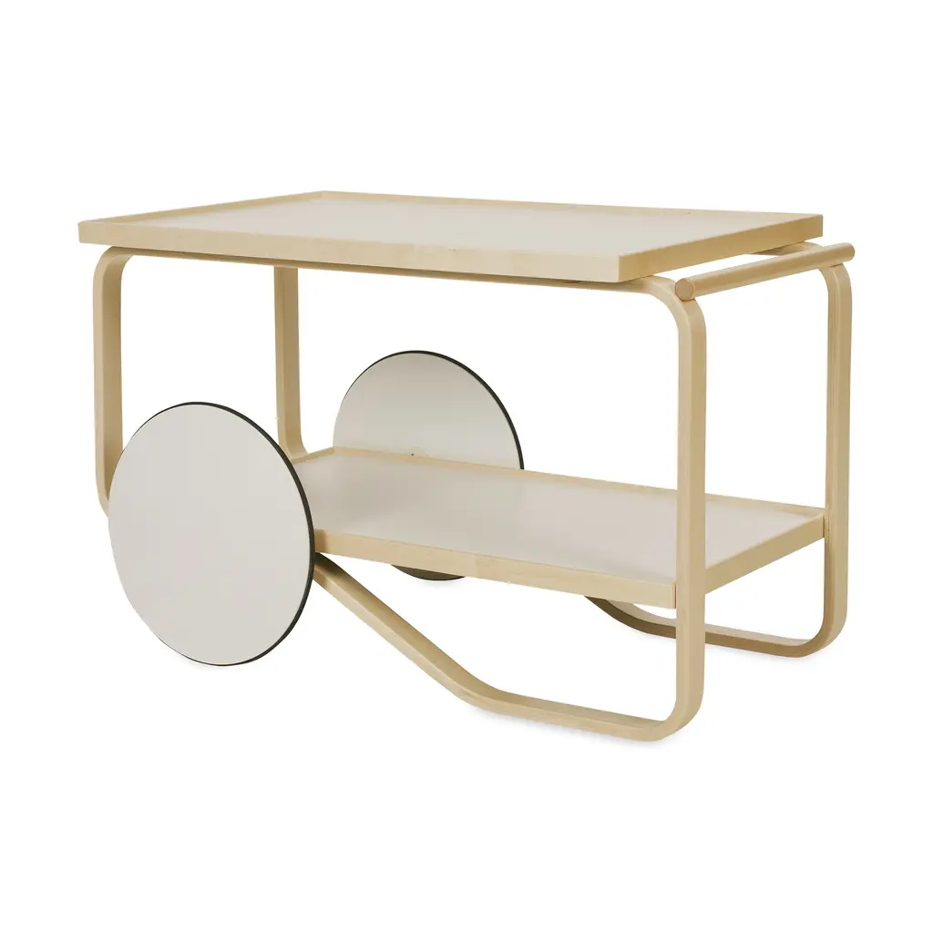 For Tea Trolley 901, which was introduced at the 1937 Paris World’s Fair, Alvar Aalto invented a process for bending thick layers of birch wood into gracefully curved loops to create strong, light frames. The large white wheels have black rubber treads that won’t mark floors. The trolley was inspired by Alvar and his wife Aino’s experience of British tea culture during their world travels, and also by their admiration for Japanese woodwork and architecture. Besides being an impressive and classic way to serve tea, the Tea Trolley 901 can also be used as a bar cart or a place to display art objects, pottery or plants. Made in Finland, the Tea Trolley 901 has a top surface made from high-pressure laminate. The trolley measures 22h x 35.5w x 19.75”d. Some assembly required. Both Alvar Aalto and the trolley’s manufacturer, Artek, have work in MoMA’s collection.