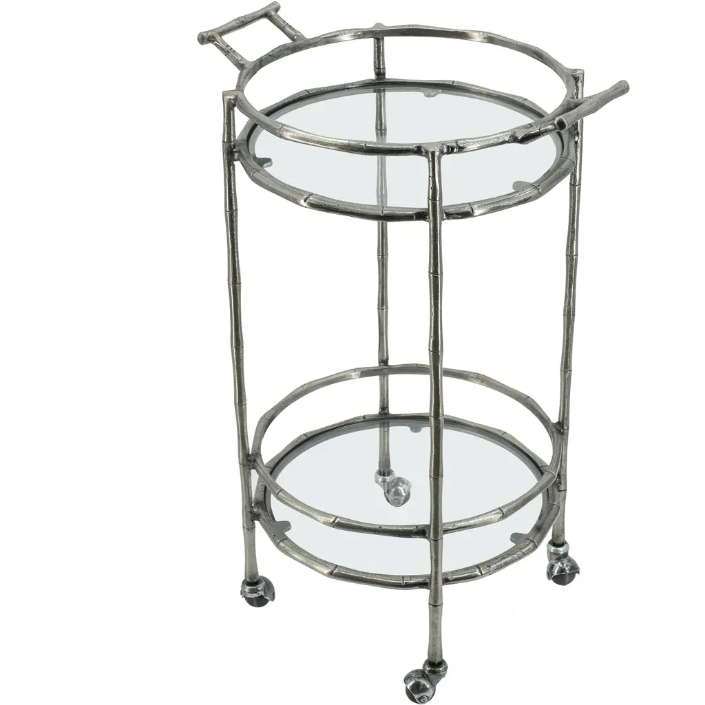A silver antique finish lends a sleek look to a Natural-inspired bar cart made of aluminum and glass. Complete with a functional two-tiered design with two shelves, it also comes equipped with handles. Entertain with style and sophistication by placing this mobile bar cart in the kitchen, dining room, or living room.