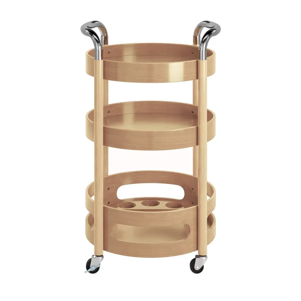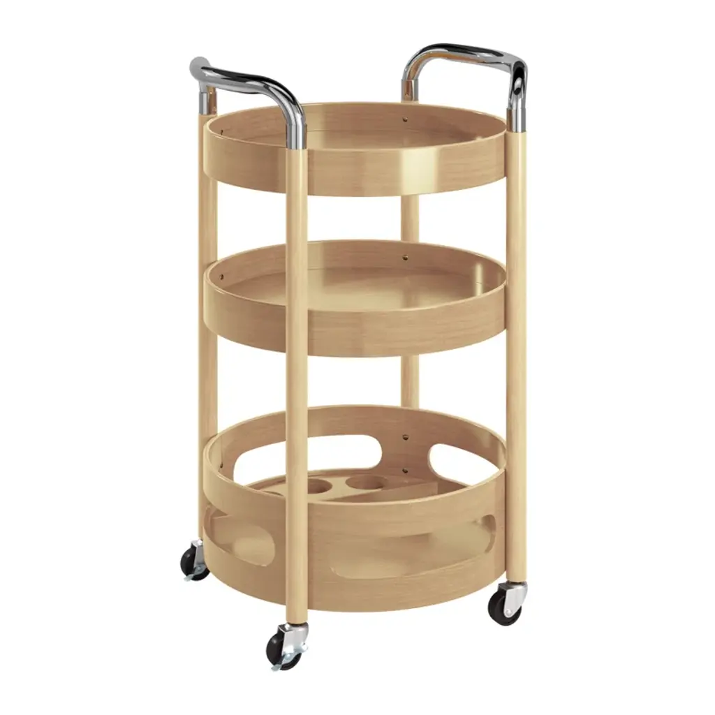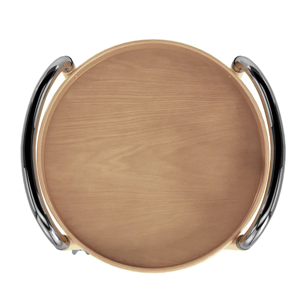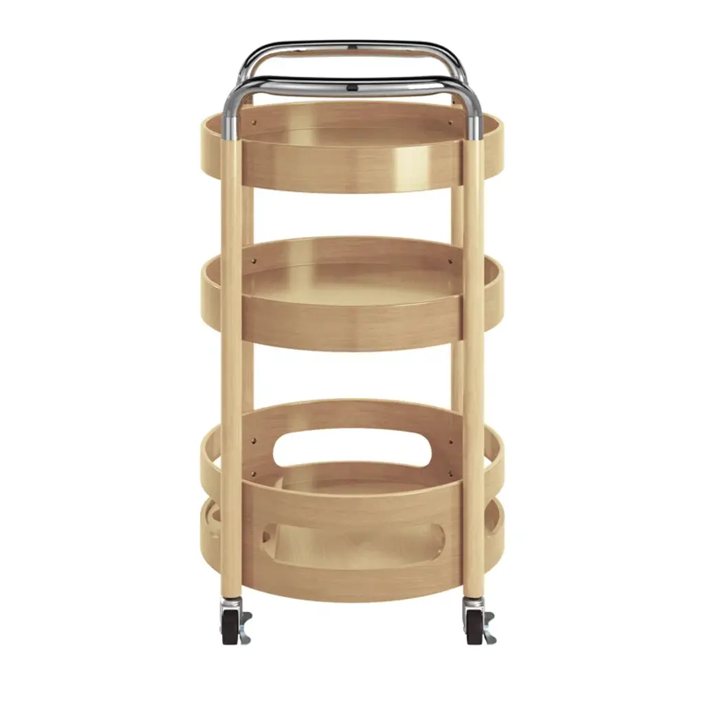 Roll in style. This modern bar cart features a sleek round shape and a combination of manufactured and solid wood materials, including rubberwood and walnut. With four locking wheels and two handles, it's easy to move around for your at-home happy hours. The cart also includes shelves for storing your favorite spirits and glassware.