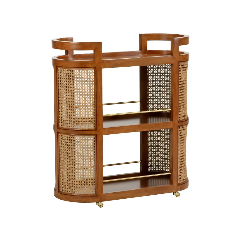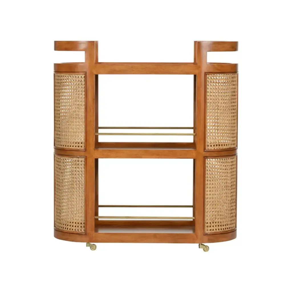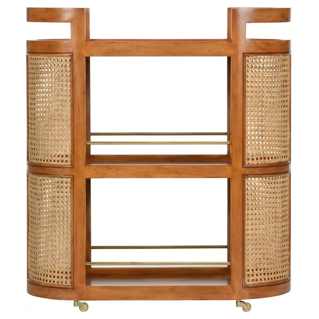 The Berkshire Bar Cart features a sleek maple veneer construction that adds a touch of sophistication to any room. Adding a touch of texture and visual interest, the sides of the bar cart are adorned with cane siding. The rich tones and smooth finish of the veneer provide a beautiful backdrop for showcasing your favorite beverages and barware.