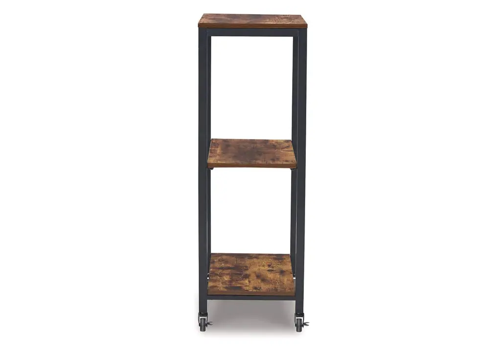 Impress your party guests in style with the Bevinfield bar cart. It features a sturdy design, with black metal rails and an antiqued brown wood finish on the three shelves for a relaxed feel. Smooth-gliding casters offer easy mobility. Weight 33.000 lbs. (14.85kgs.)