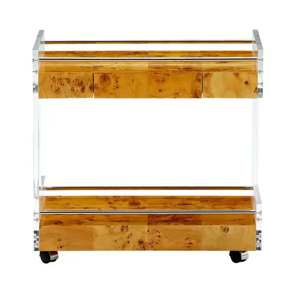Architectural rigor meets the warmth of burled wood. Featuring pieced mappa wood floating between two clear acrylic c-shaped panels, its natural, honey-hued finish keeps your cocktail hour feeling warm and worldly. Stainless steel accents add a splash of shine. Featuring two shelves for plenty of space for stashing decanters and drinkware, plus a hidden drawer for more after-hours accoutrements.