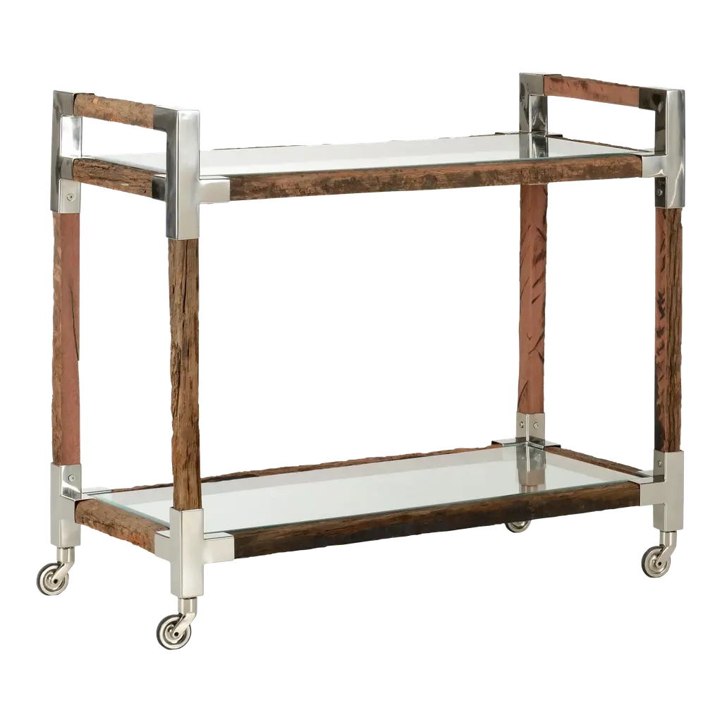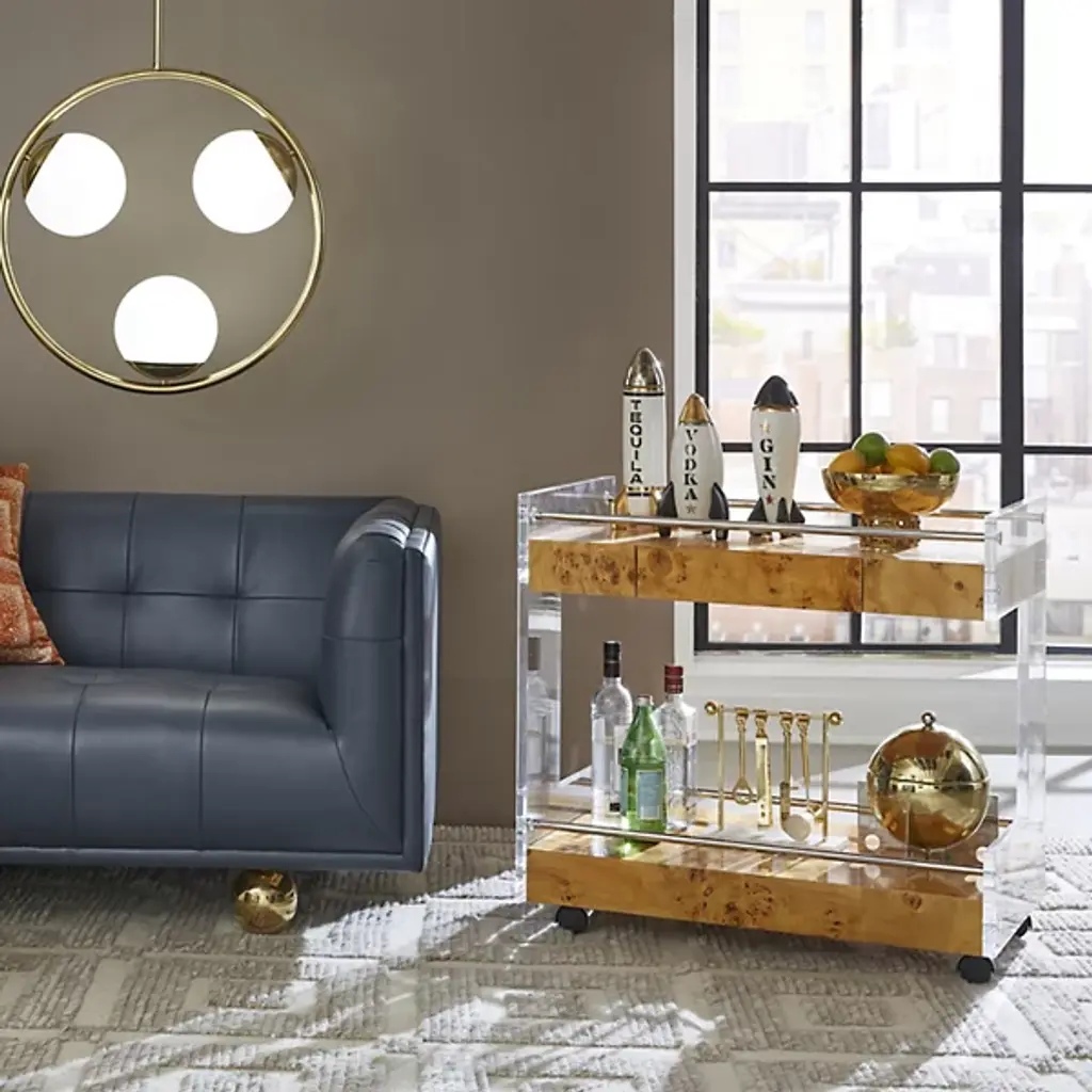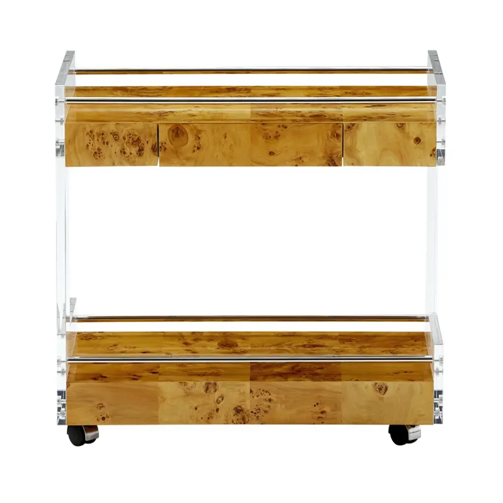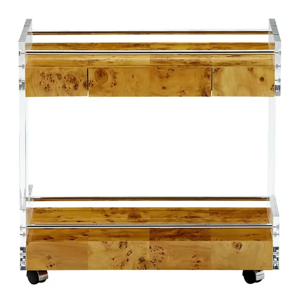 The Bond Bar Cart from Jonathan Adler presents an appealing study in contrasts. Rising eloquently from two rectangular panels of naturally-hued Mappa wood, it uses alternating “C-Shaped” panels of clear acrylic and metal crossbars to anchor them, sitting atop four small smoothly-rolling wheels. Blending clean contemporary lines with rich mid-century modern materials and naturally burled wood, the top shelf also conceals a self-closing drawer, its memorable design reflecting Adler’s ambitious design philosophy of, "If your heirs won’t fight over it, we won't make it.