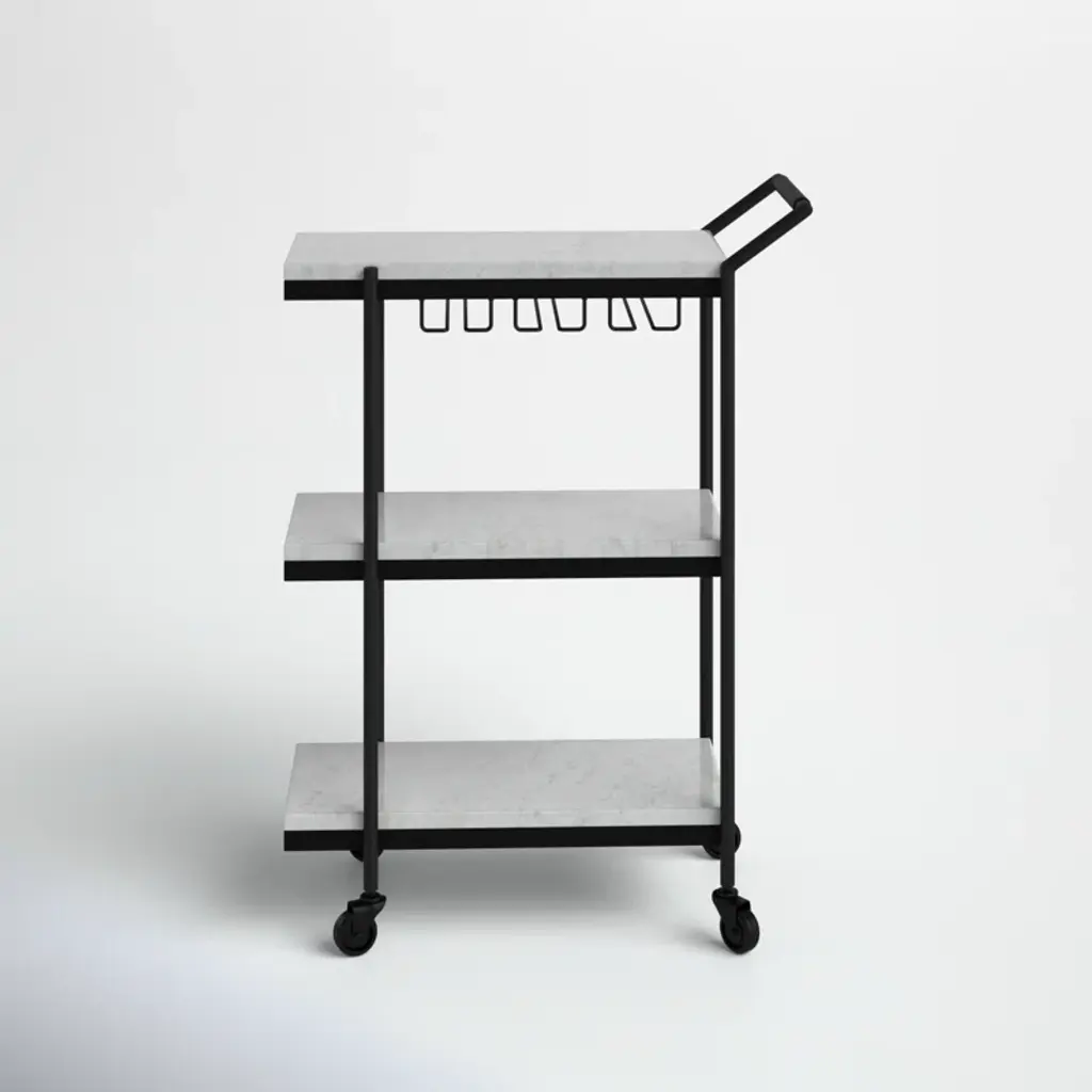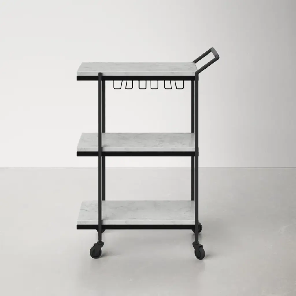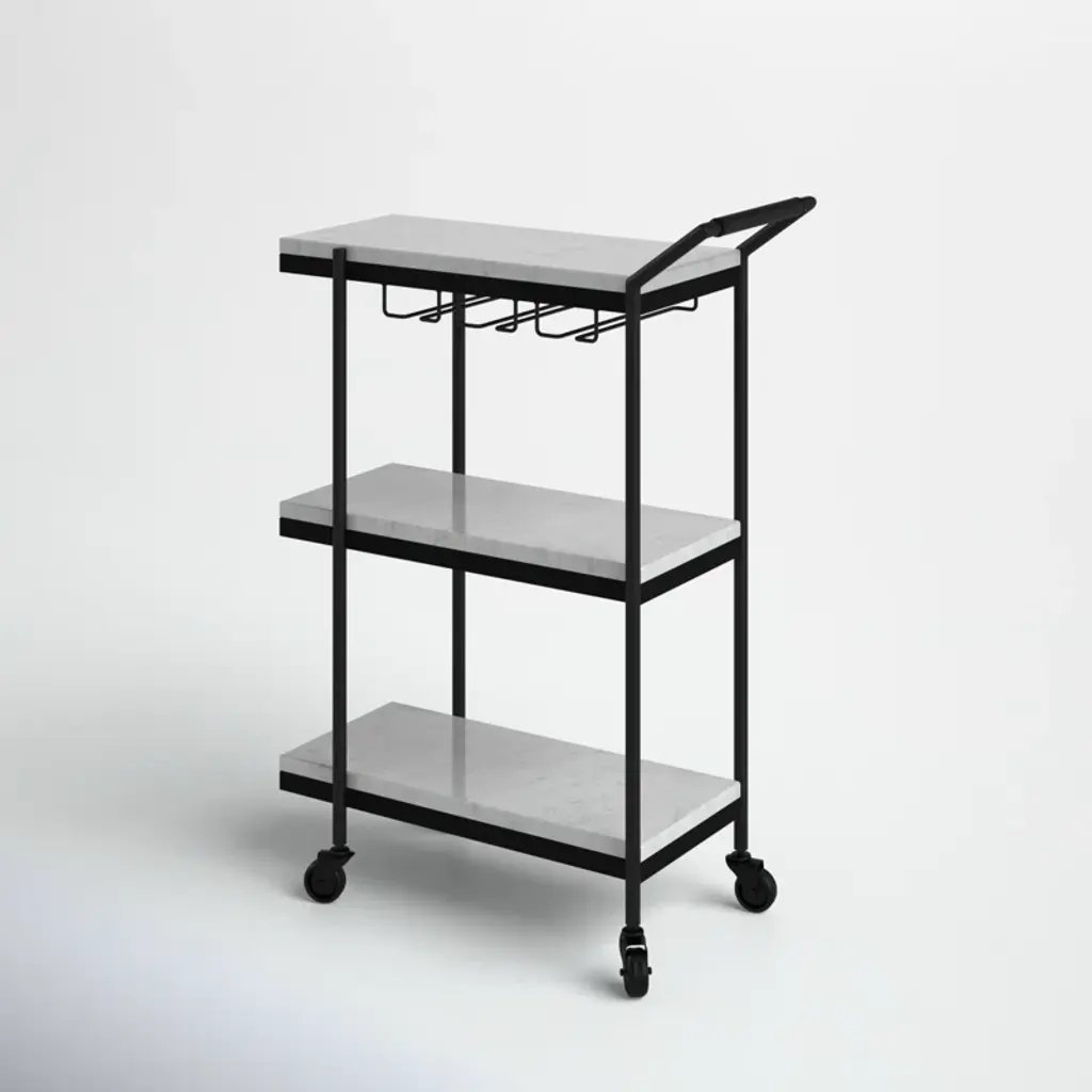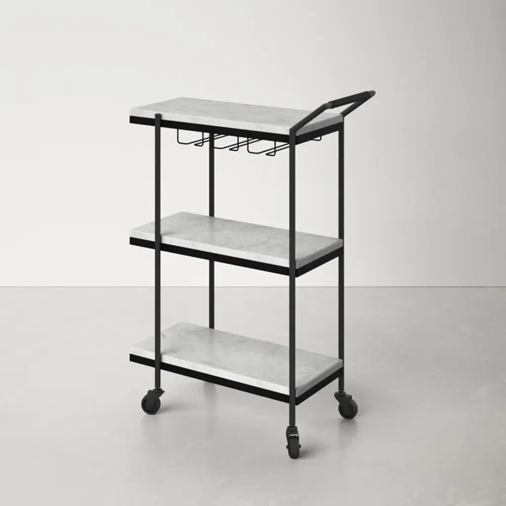 This bar cart rests its white marble shelves in a black iron frame with strong horizontal + vertical lines, for a look that’s welcome whether your party is minimalist or a little more luxe. A stemware rack keeps glasses handy, and four caster wheels allow it to mix + mingle.
