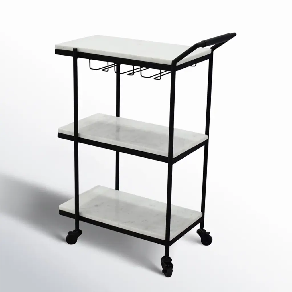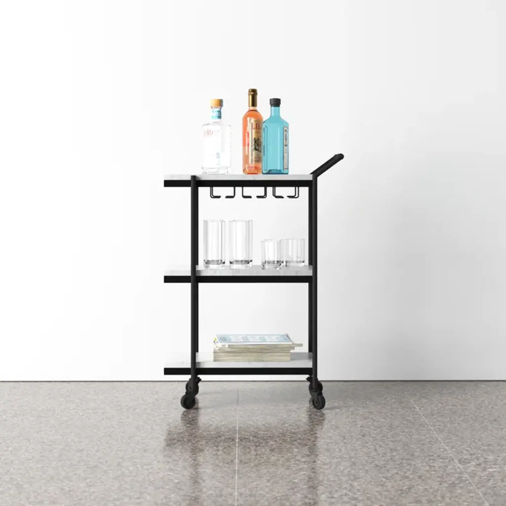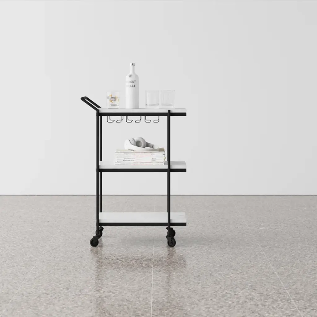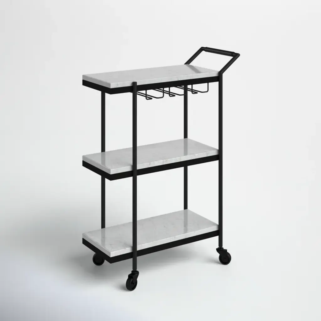 This bar cart rests its white marble shelves in a black iron frame with strong horizontal + vertical lines, for a look that’s welcome whether your party is minimalist or a little more luxe. A stemware rack keeps glasses handy, and four caster wheels allow it to mix + mingle.