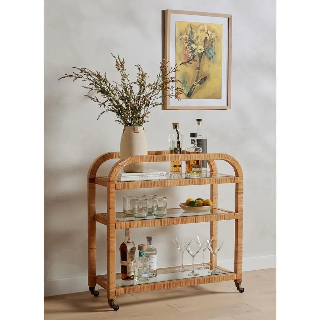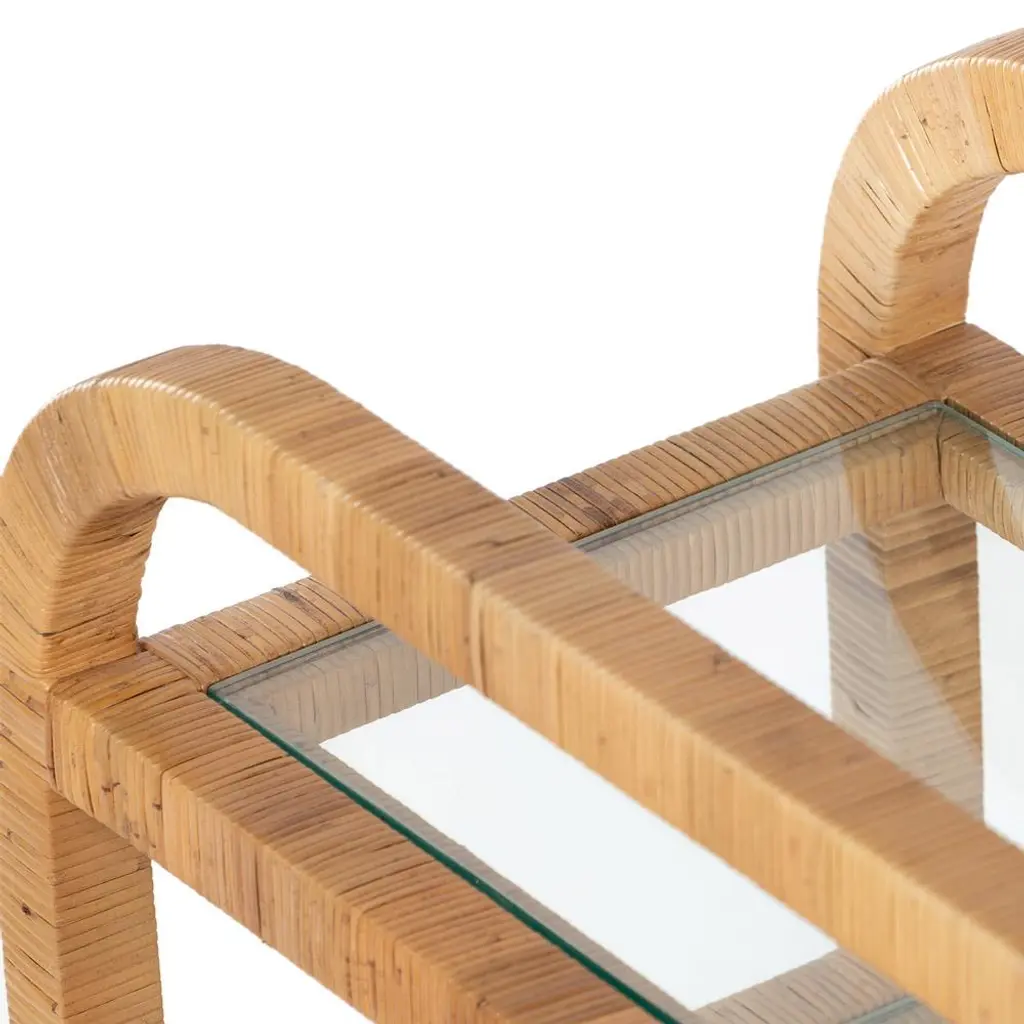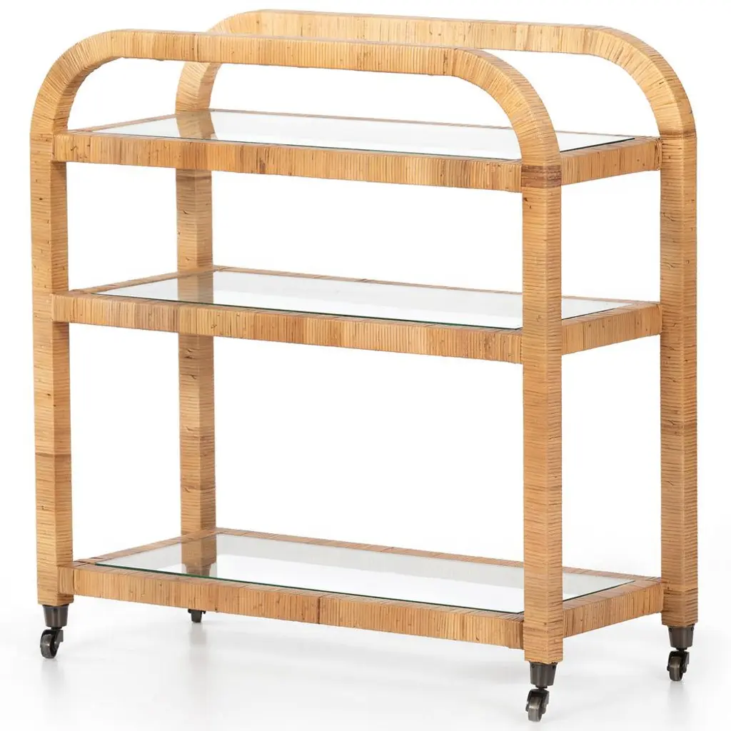 Breech Coastal Beach Brown Rattan Frame Clear Glass Caster Bar Cart