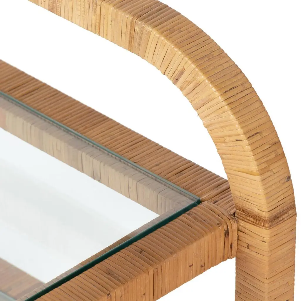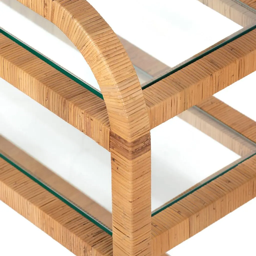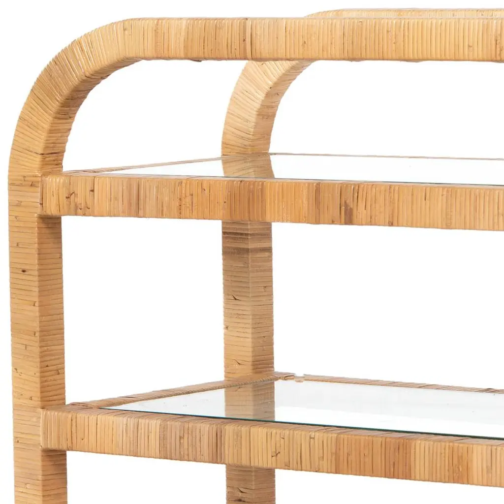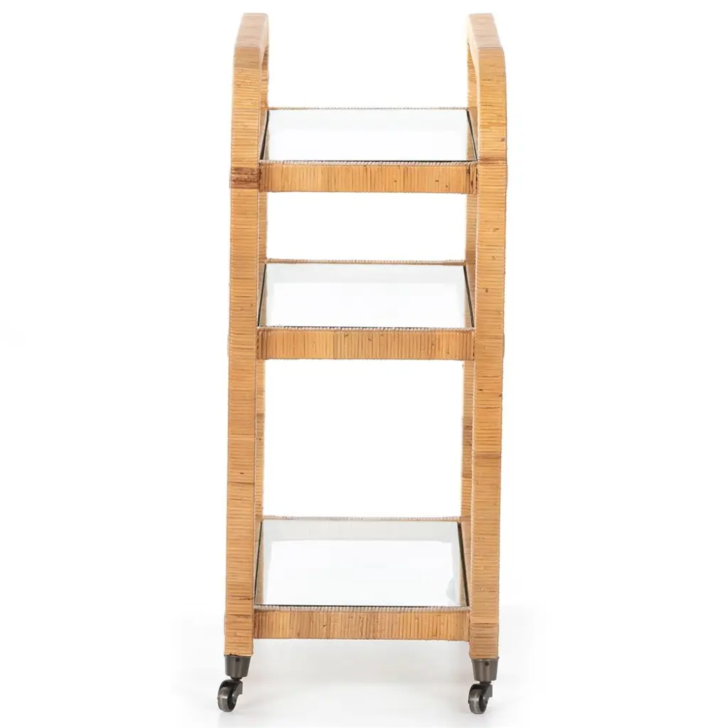 Breech Coastal Beach Brown Rattan Frame Clear Glass Caster Bar Cart